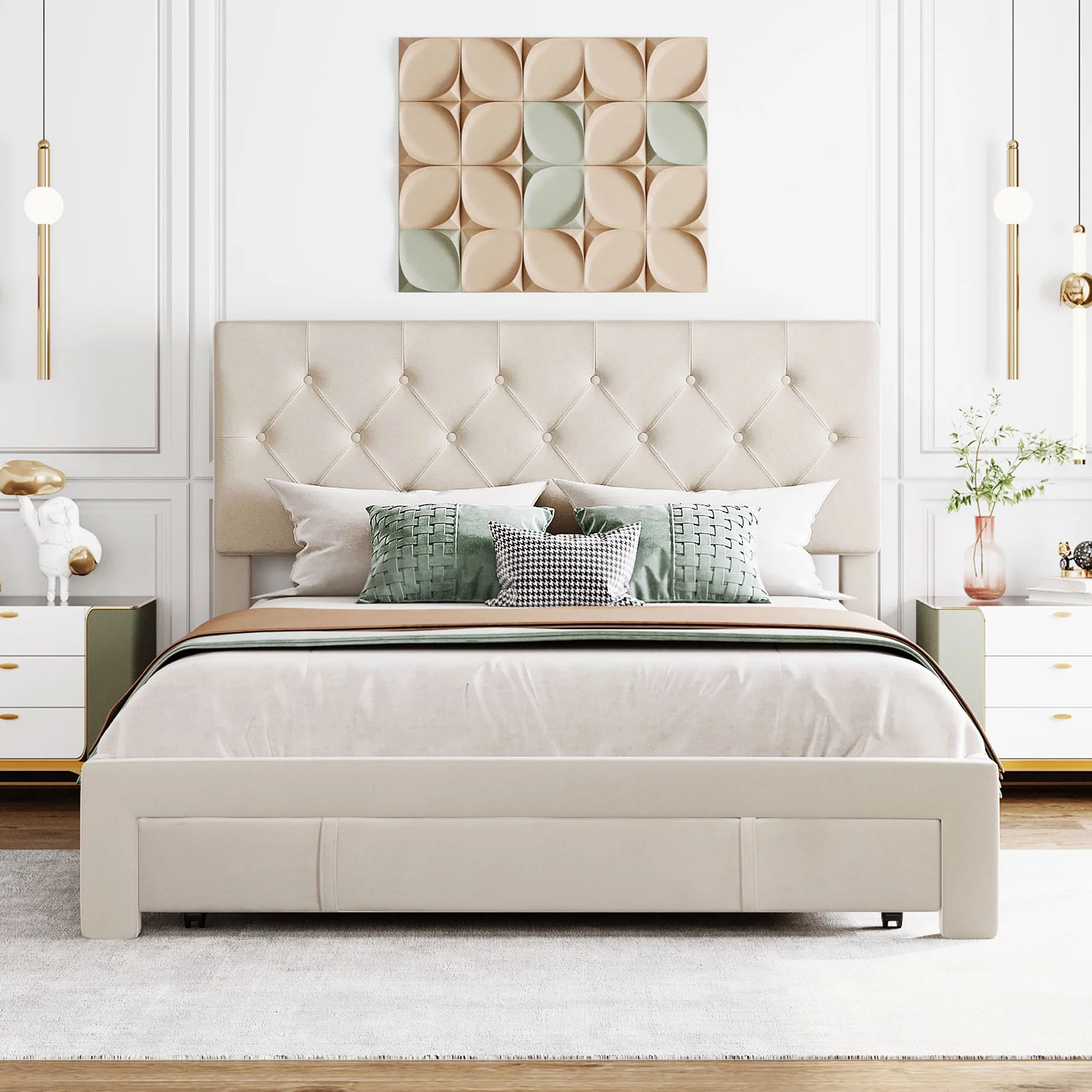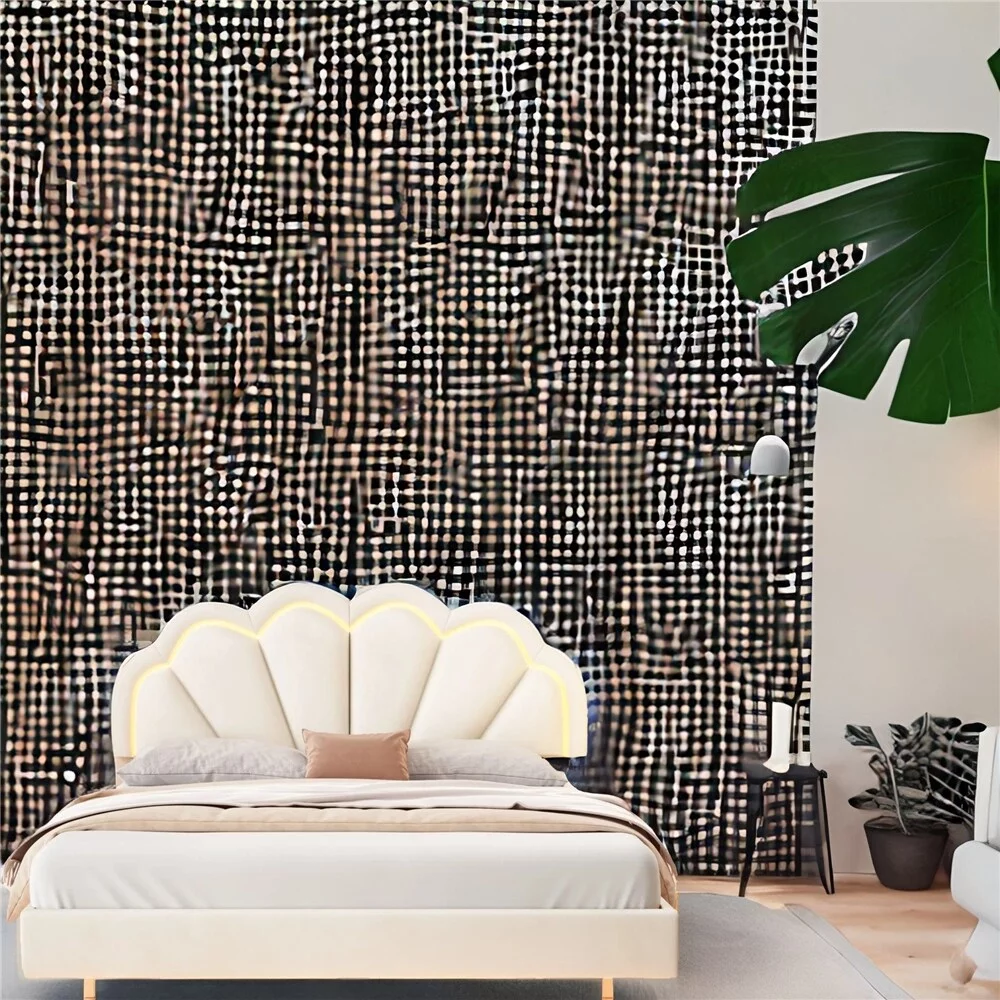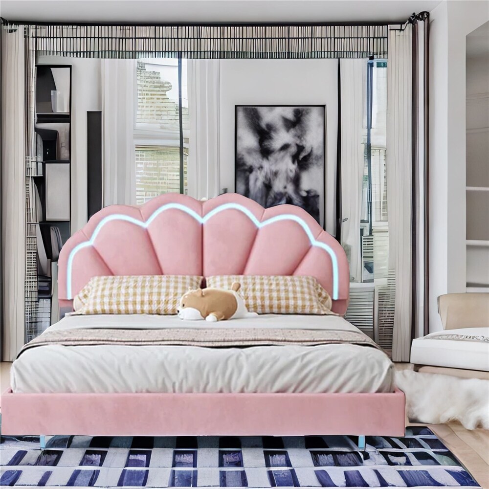 BESTCOSTY Upholstered Smart LED Bed Frame with Elegant Flowers Headboard Beige