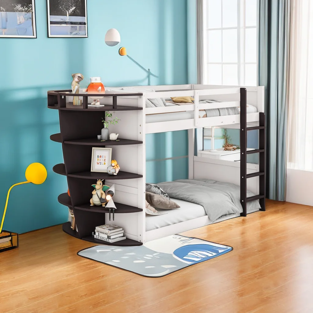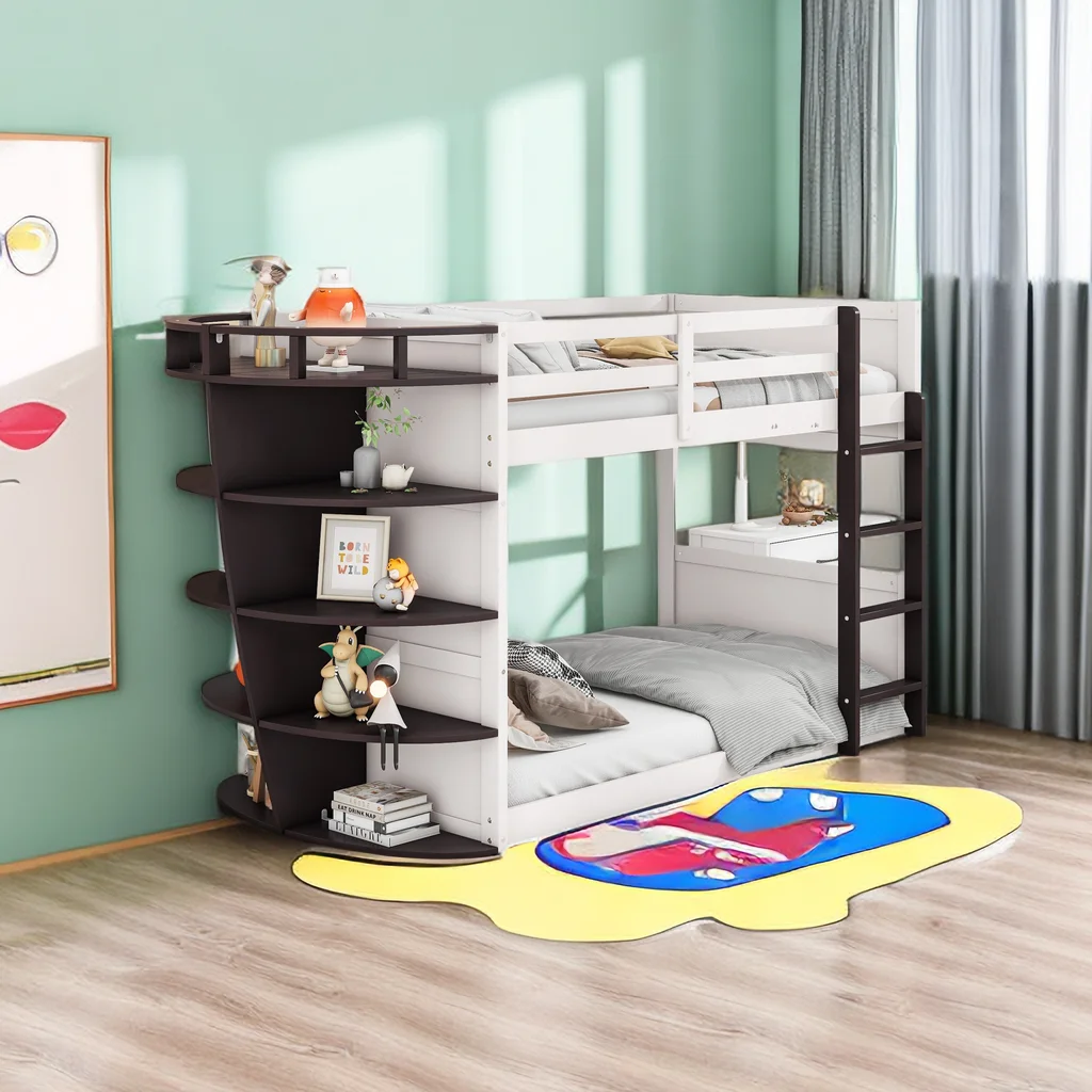 Twin over Twin Boat-Like Shape Bunk Bed with Storage Shelves, Cream+Espresso