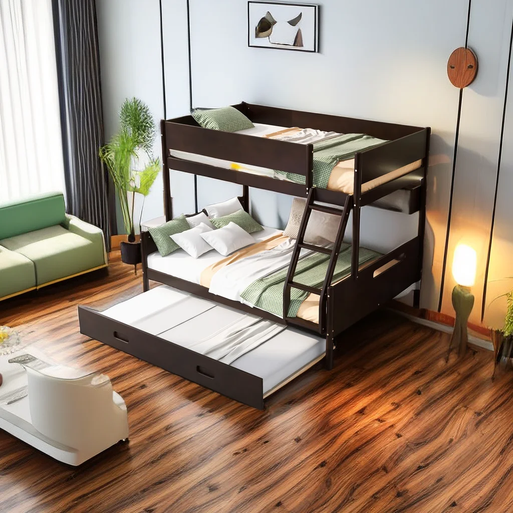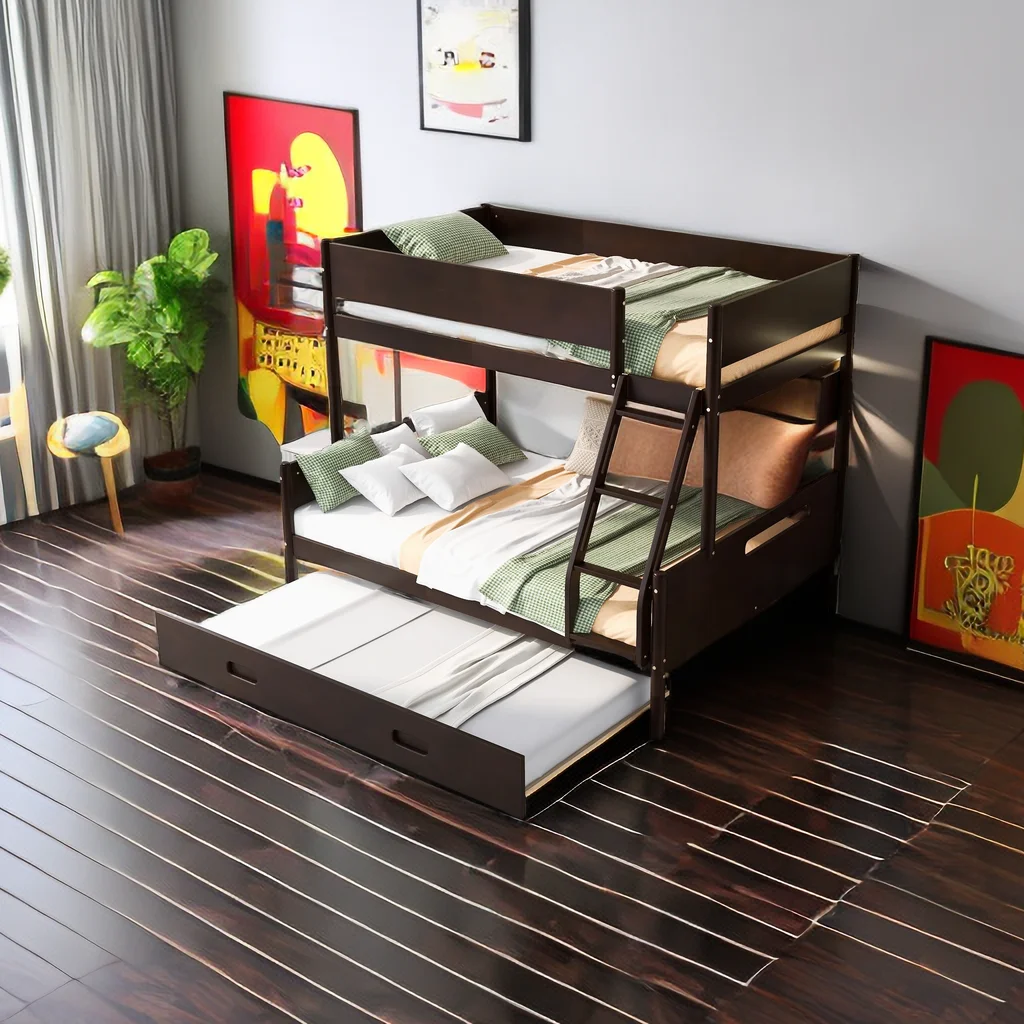 LANTRO JS Full over Full Bunk Bed with Storage Shelves, Twin Size Trundle and Ladder