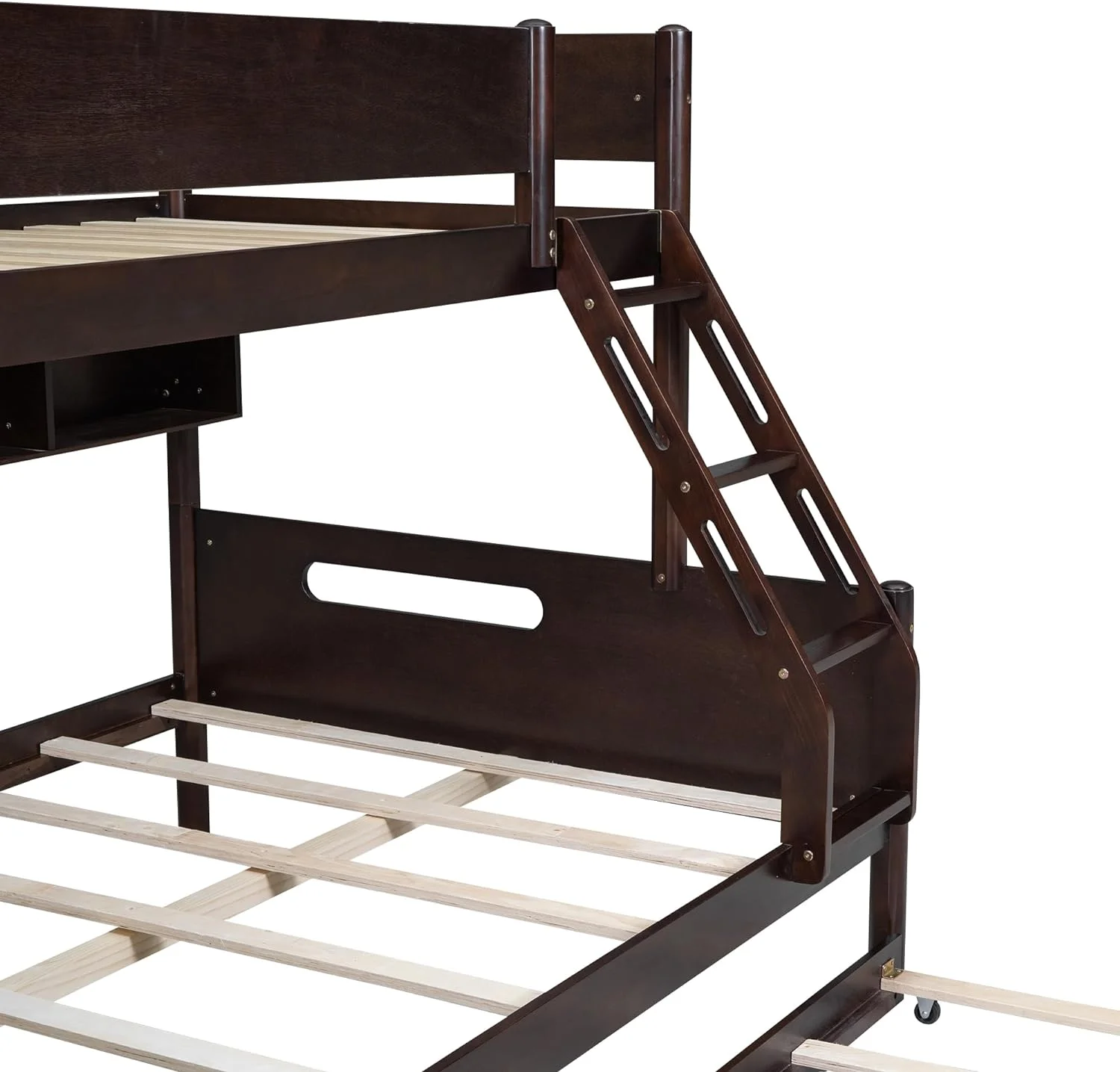 Wood Twin Over Full Bunk Bed with Bulit-in Storage Shelves and Twin Size Trundle,Bunk Bed with Safety Ladder and Guardlails