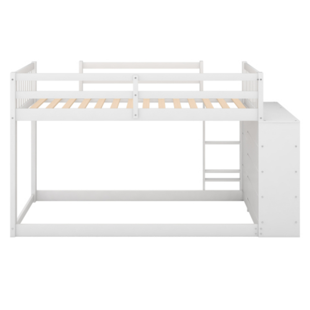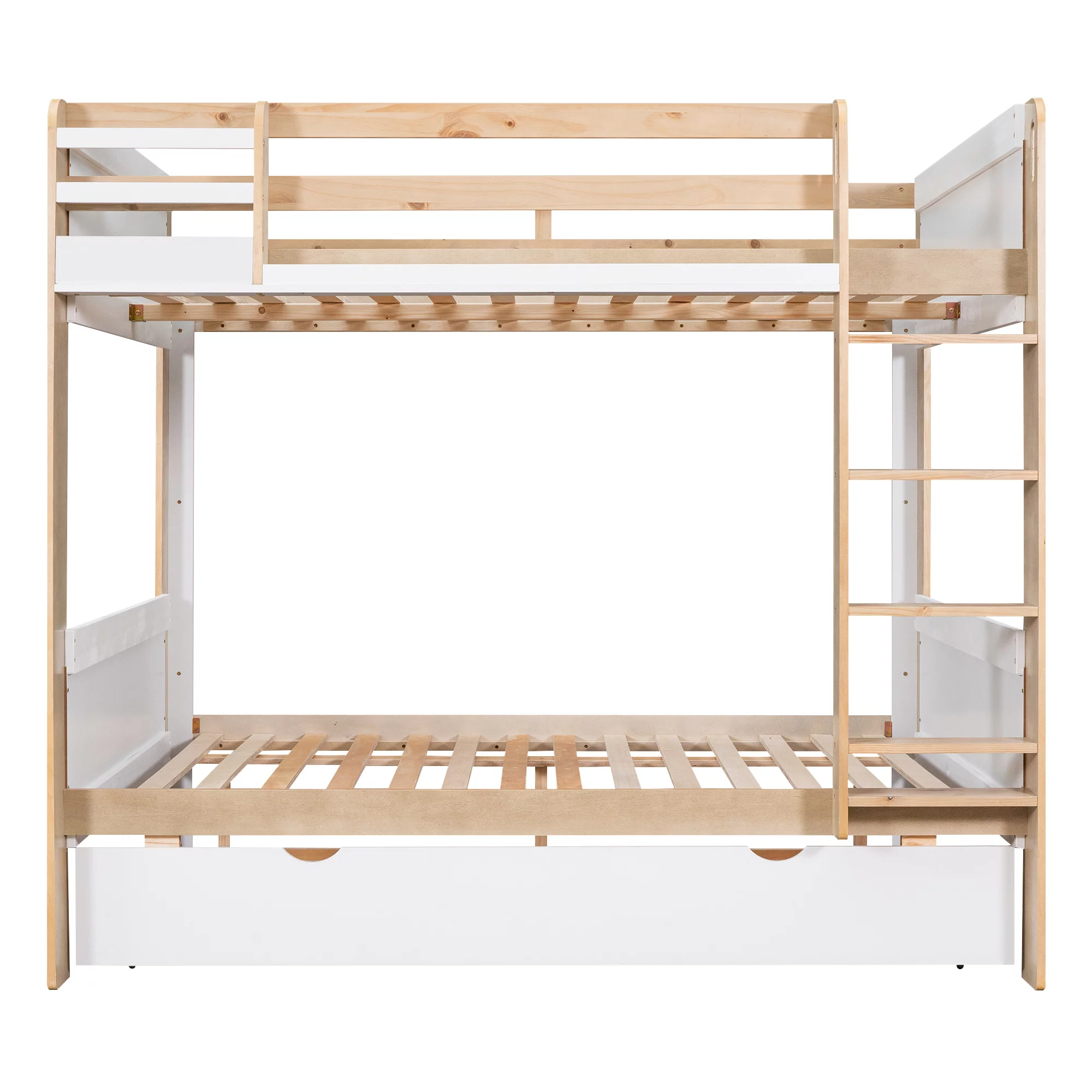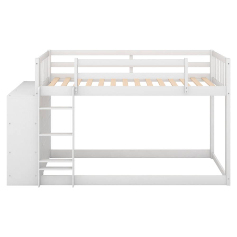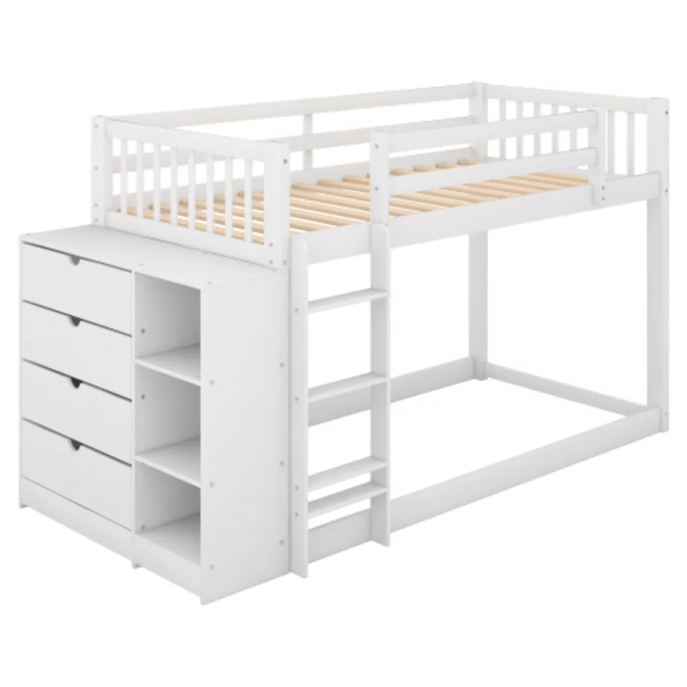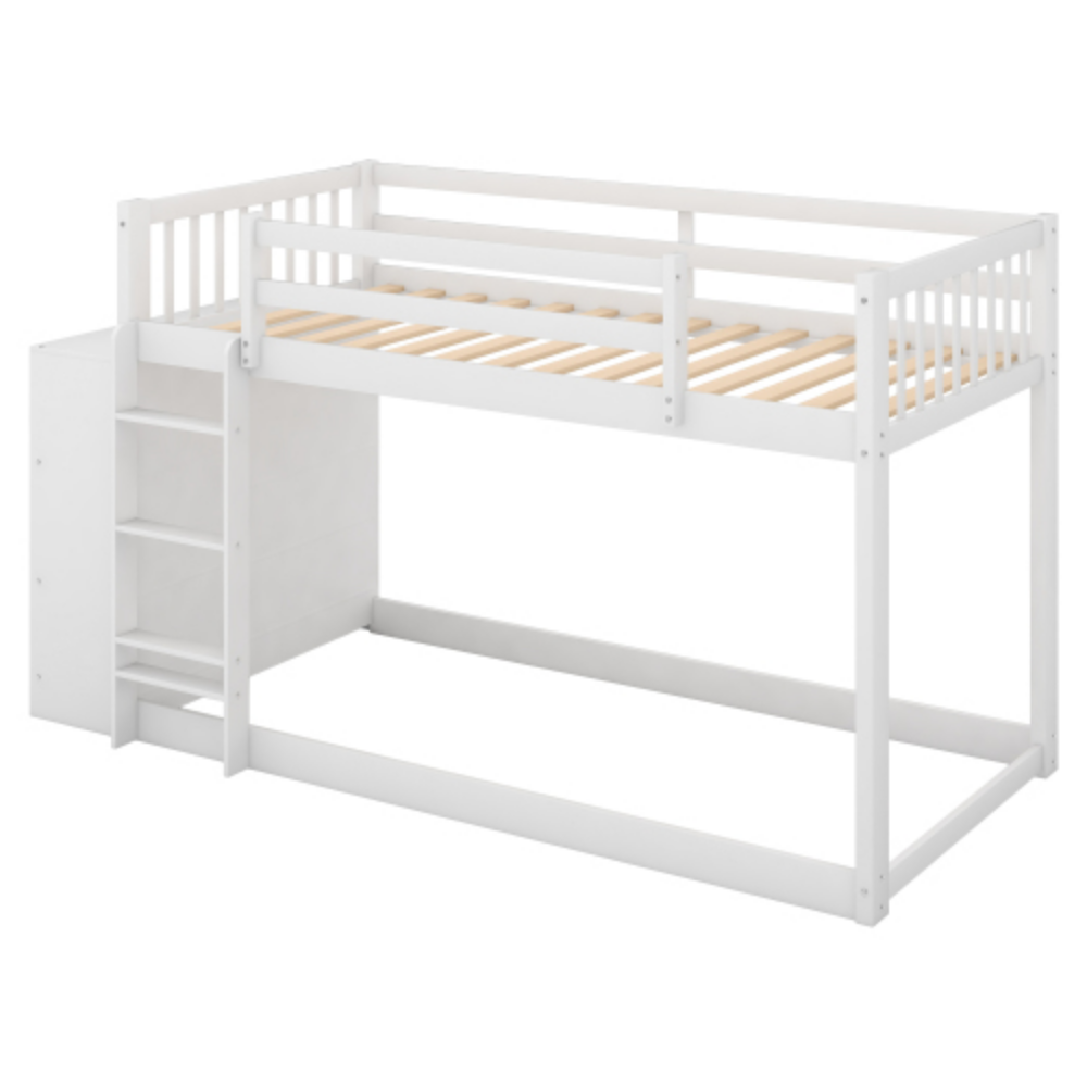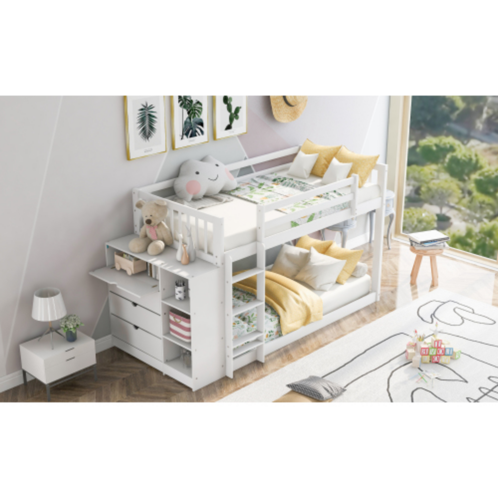 Wood Twin Over Twin Bunk Bed with One Drawers and Storage Shelves White