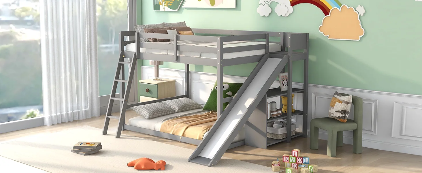 CoSoTower Full over Full Bunk Bed with Ladder, Slide and Shelves, Gray