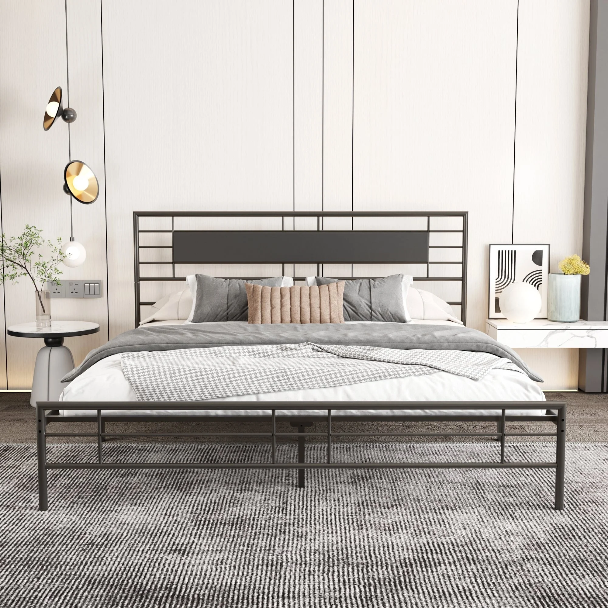 Full Heavy Duty Industrial Modern Metal Wood Platform Bed Frame with Headboard