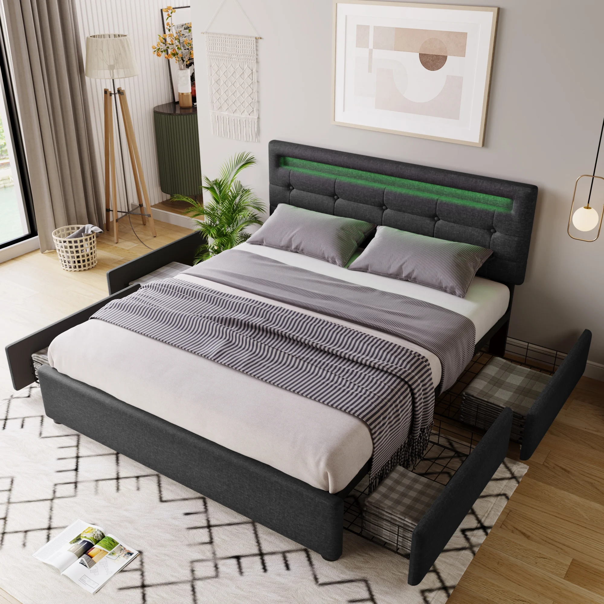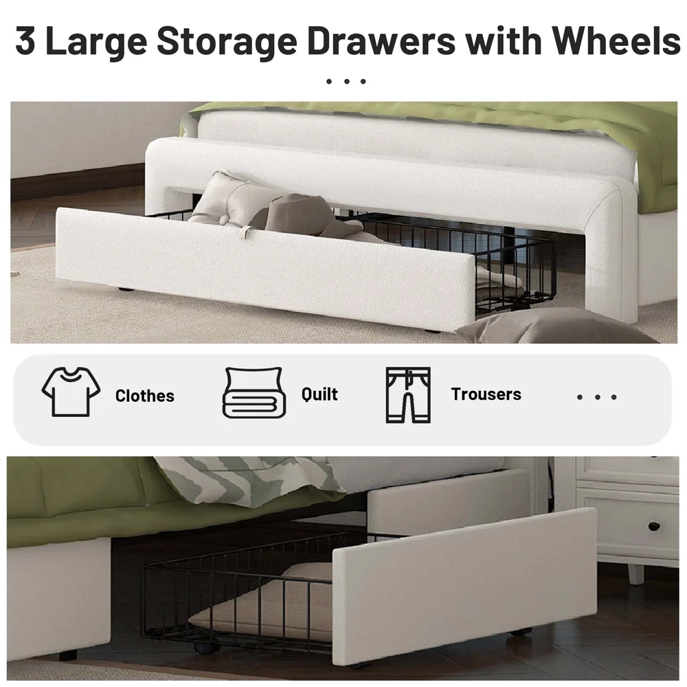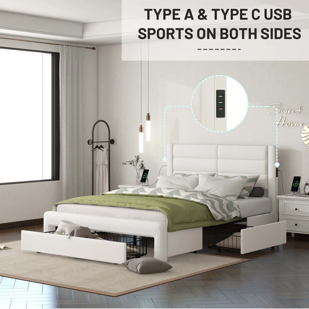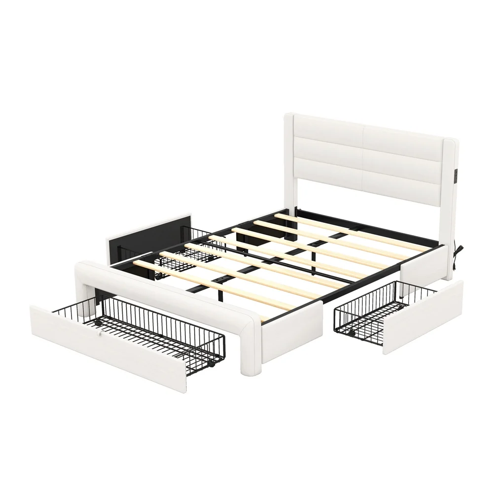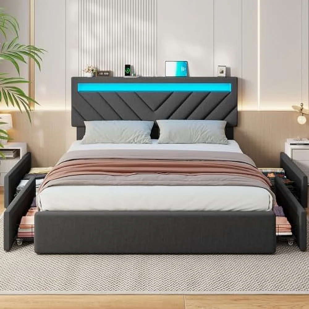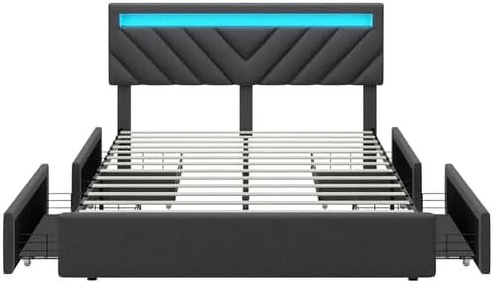 Queen Size Upholstered Bed Frame with Headboard and 4 Storage Drawers No Box Spring Needed Easy Assembly Heavy Duty
