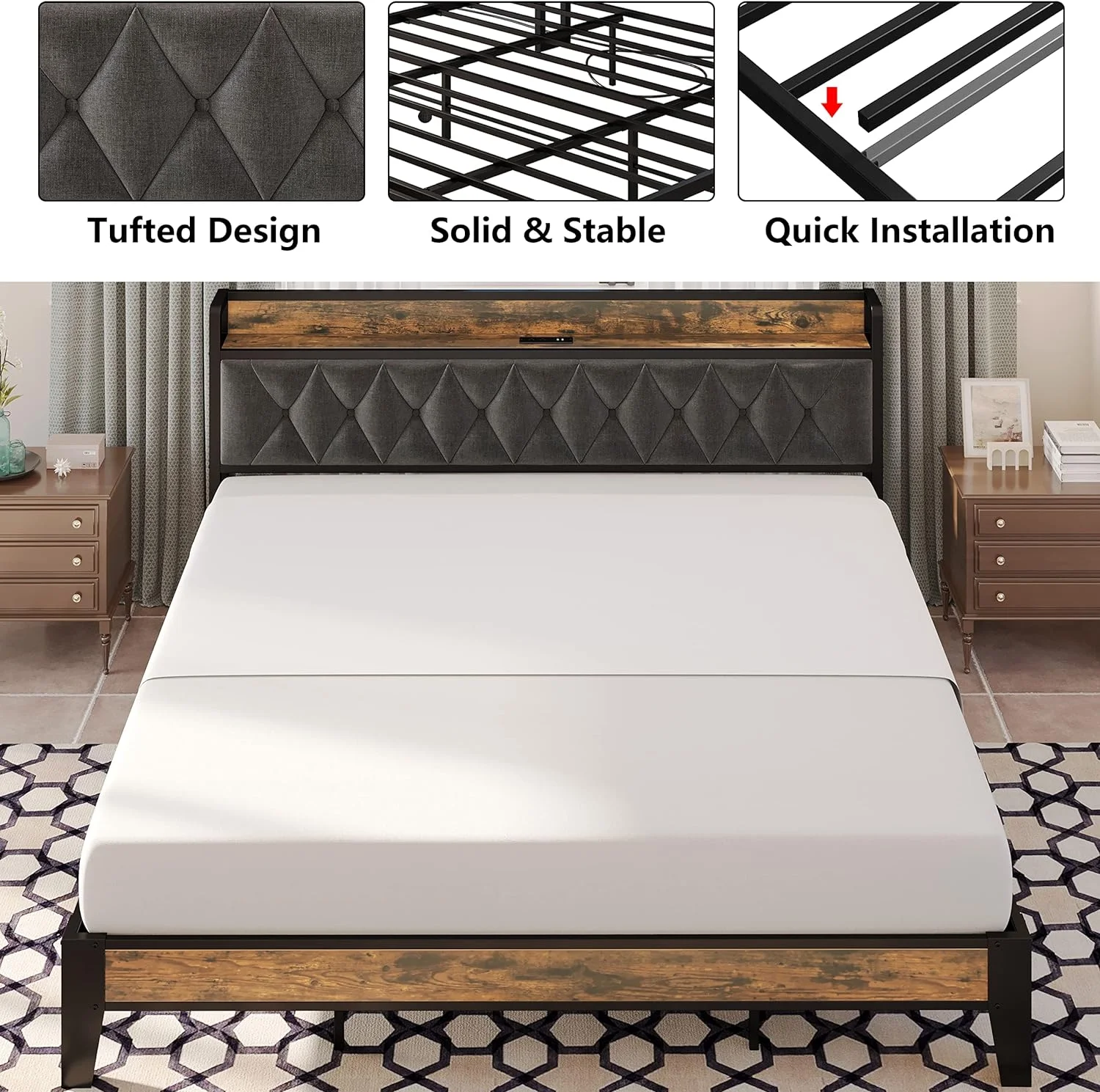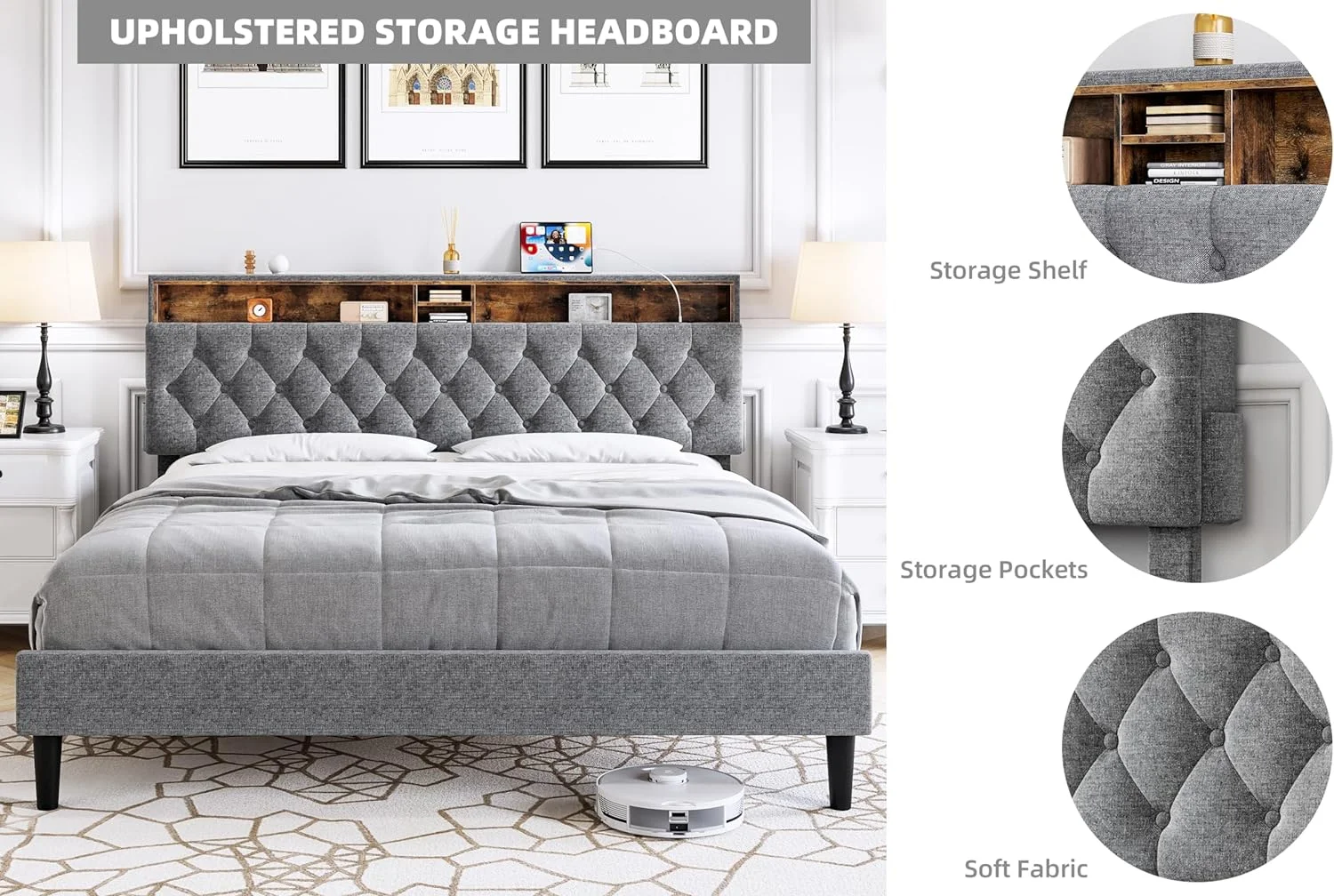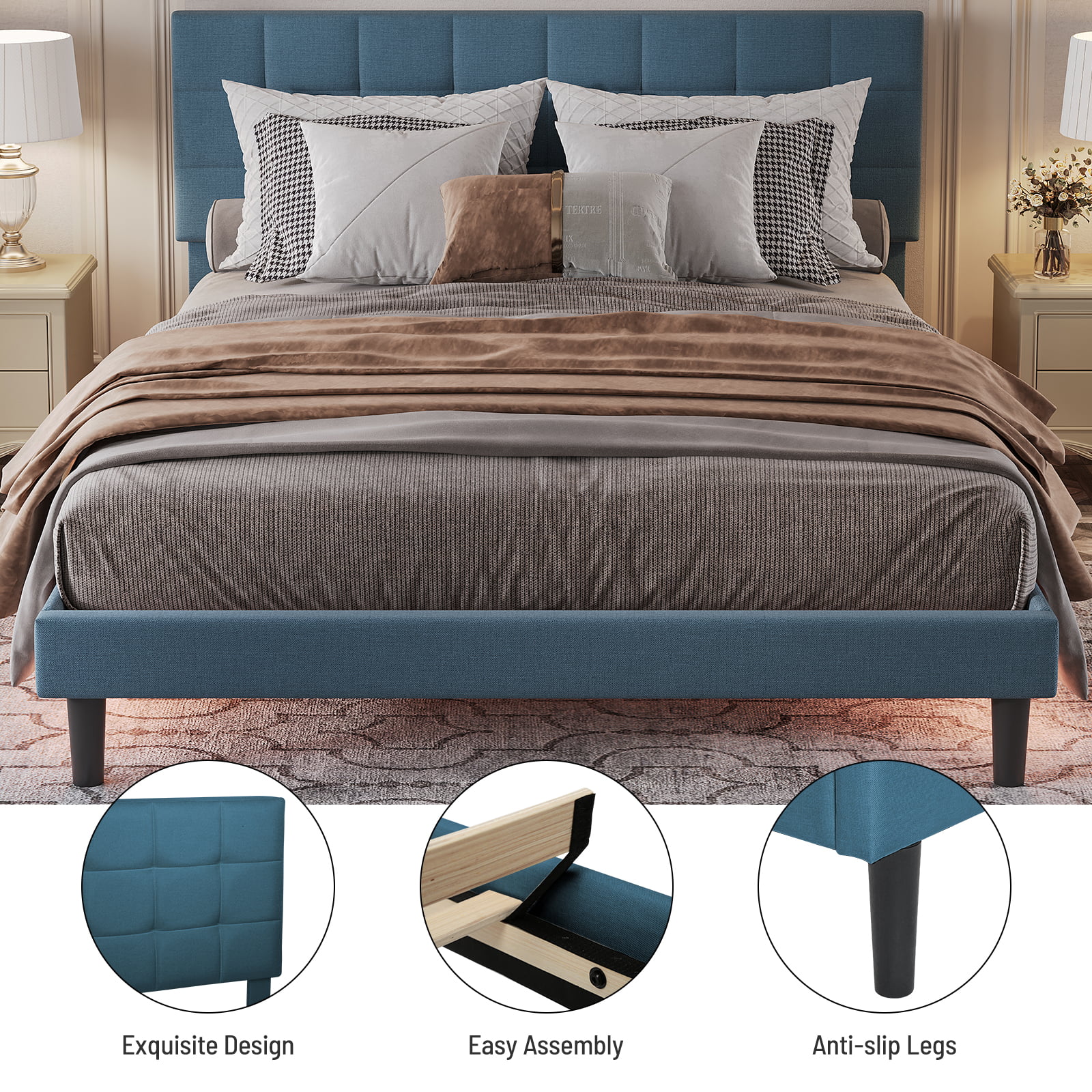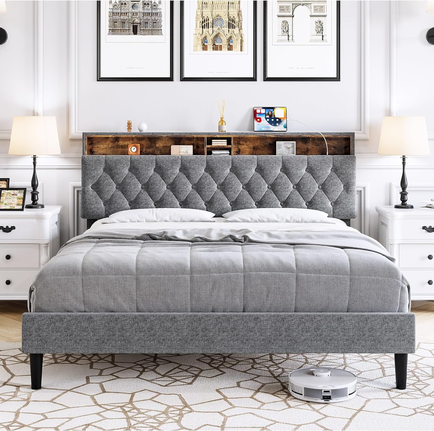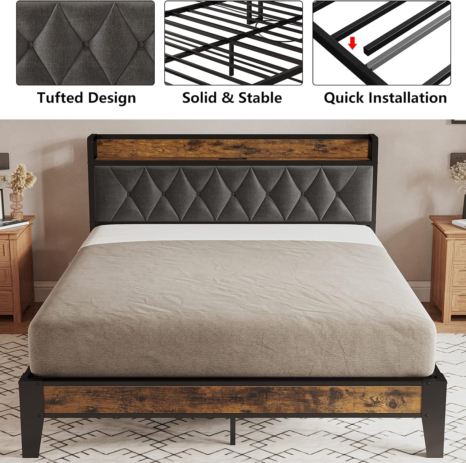 Queen Size Upholstered Bed Frame with Headboard and 4 Storage Drawers No Box Spring Needed Easy Assembly Heavy Duty