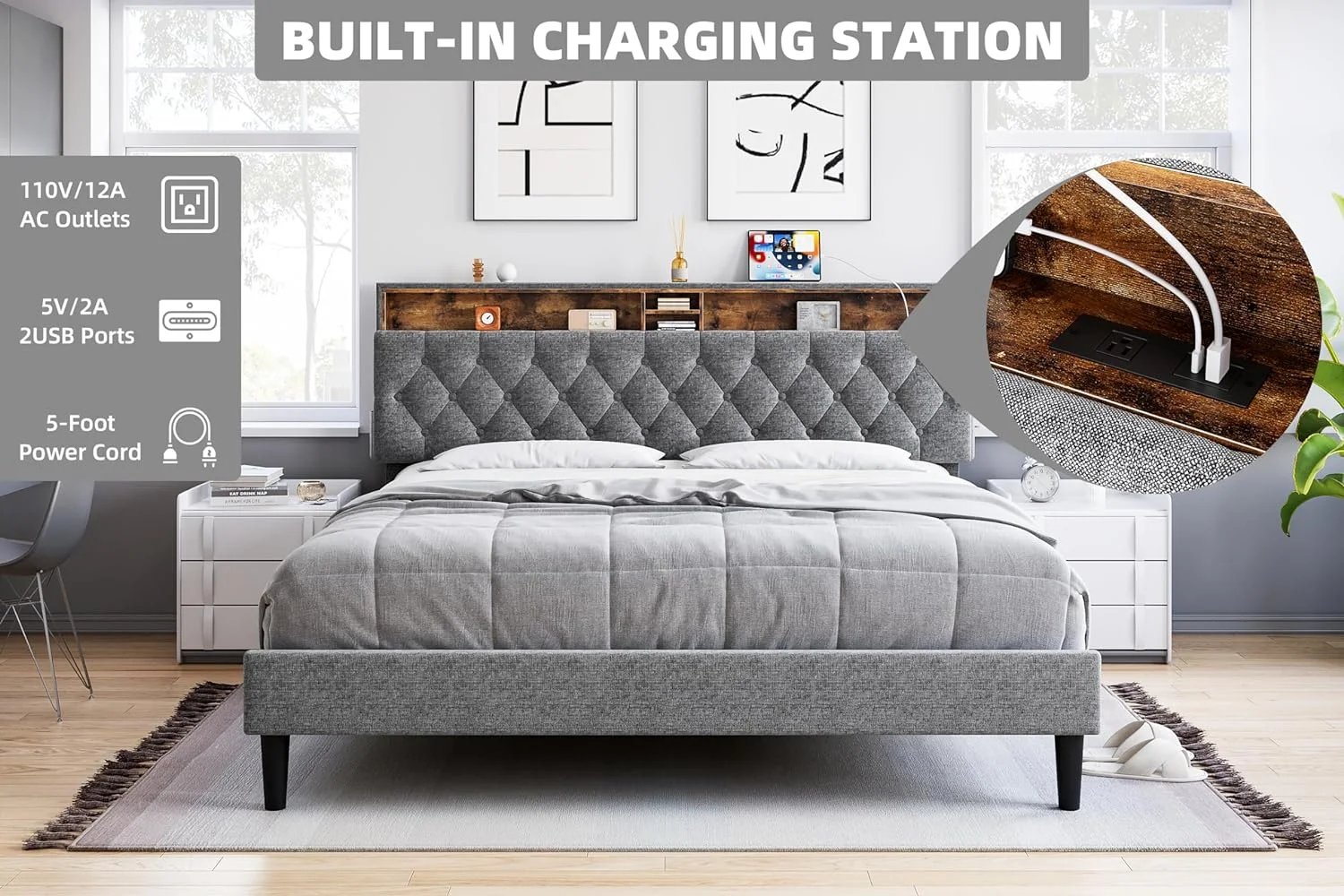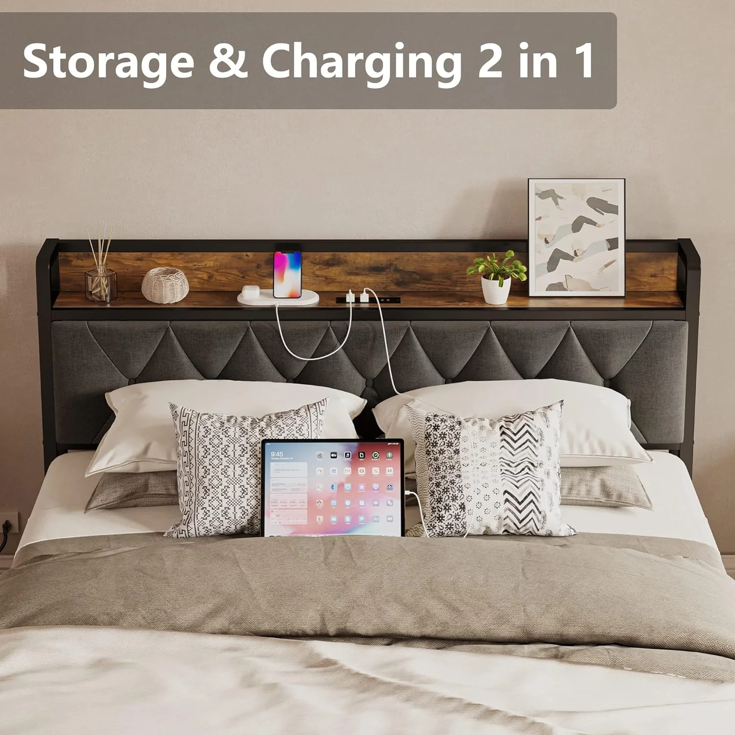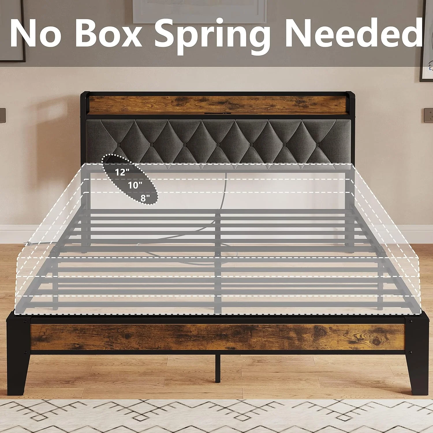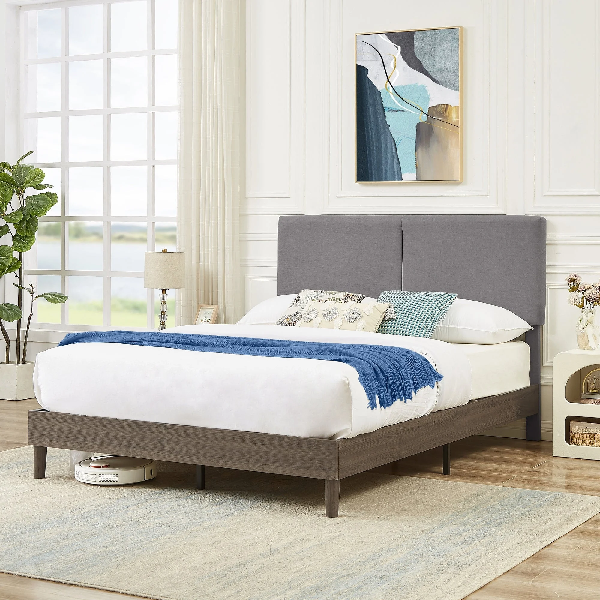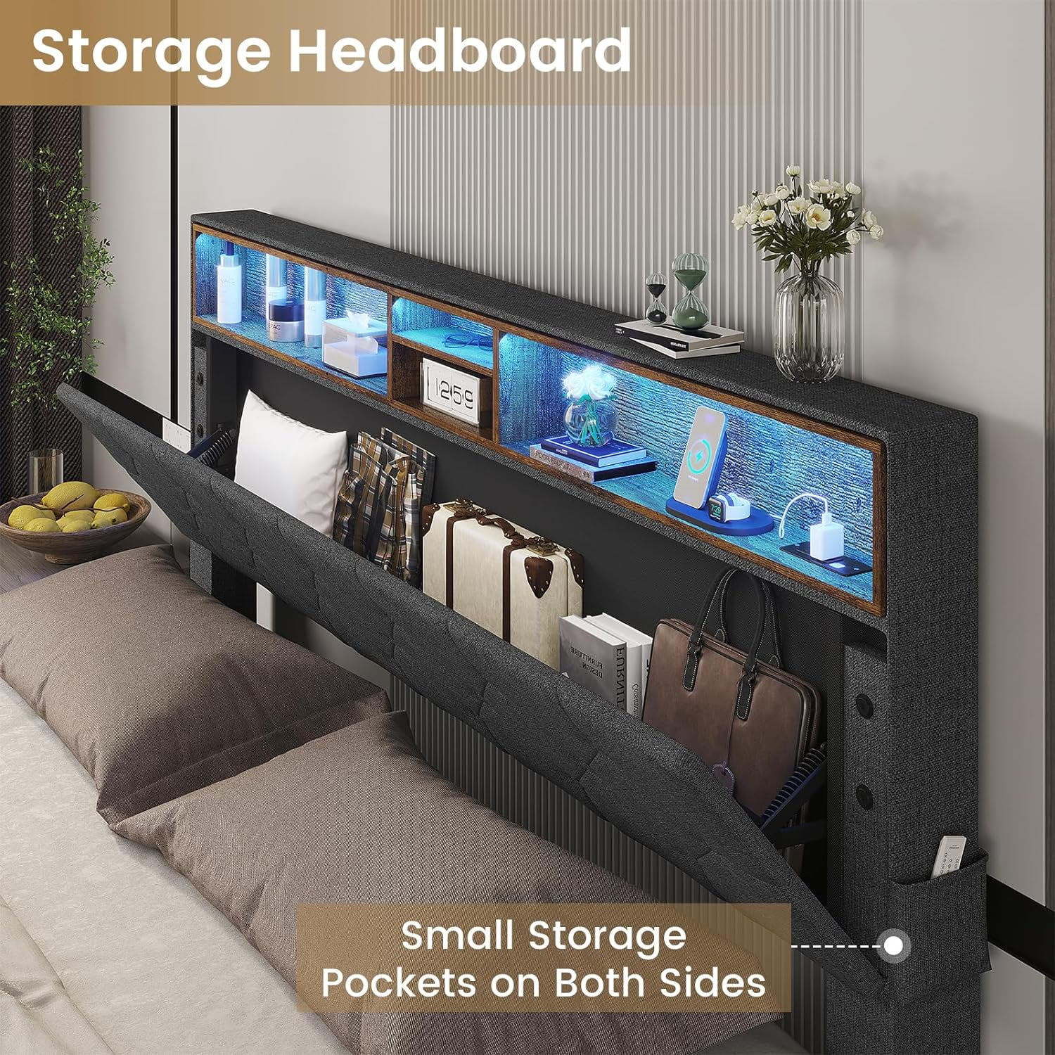 Queen Size Upholstered Bed Frame with Headboard and 4 Storage Drawers No Box Spring Needed Easy Assembly Heavy Duty