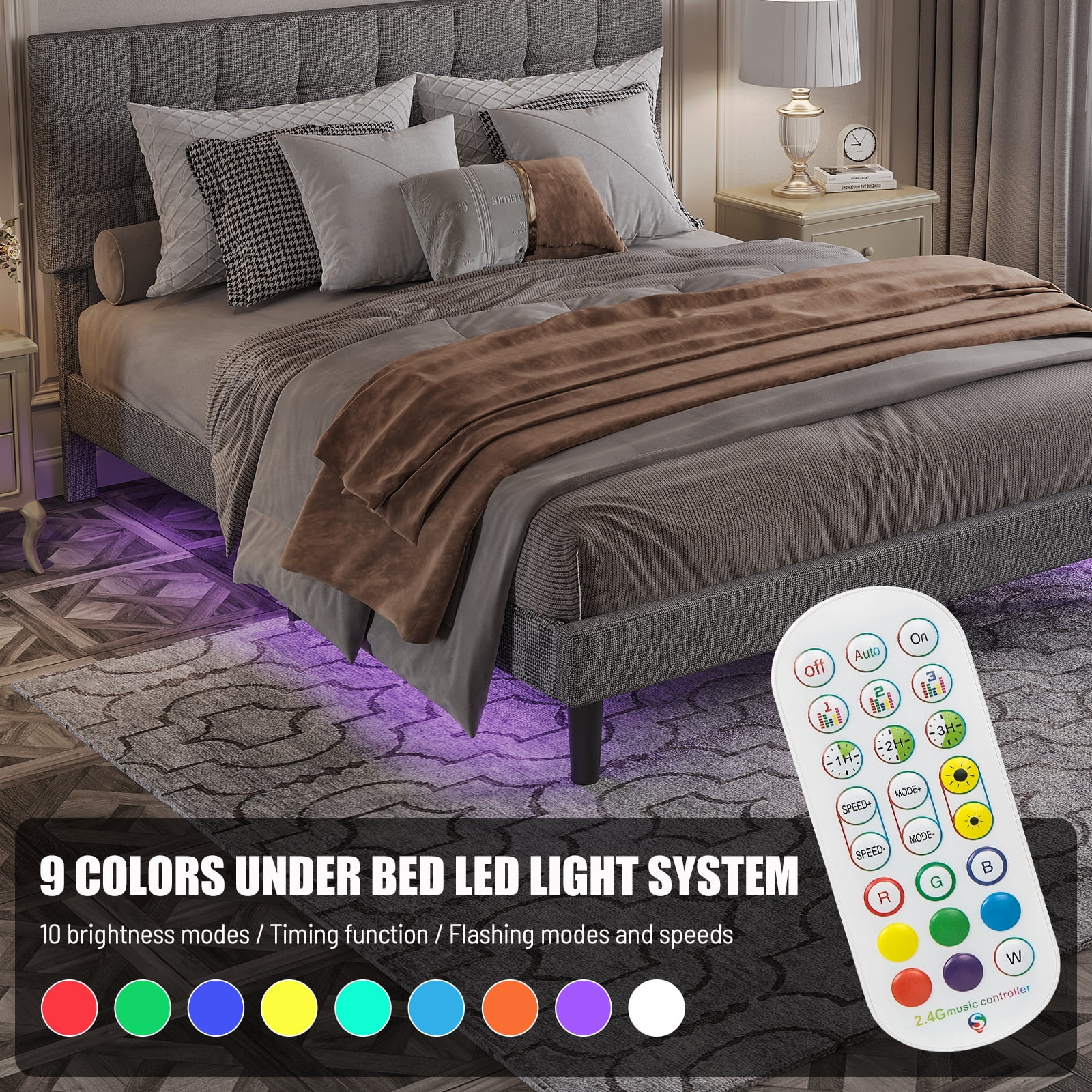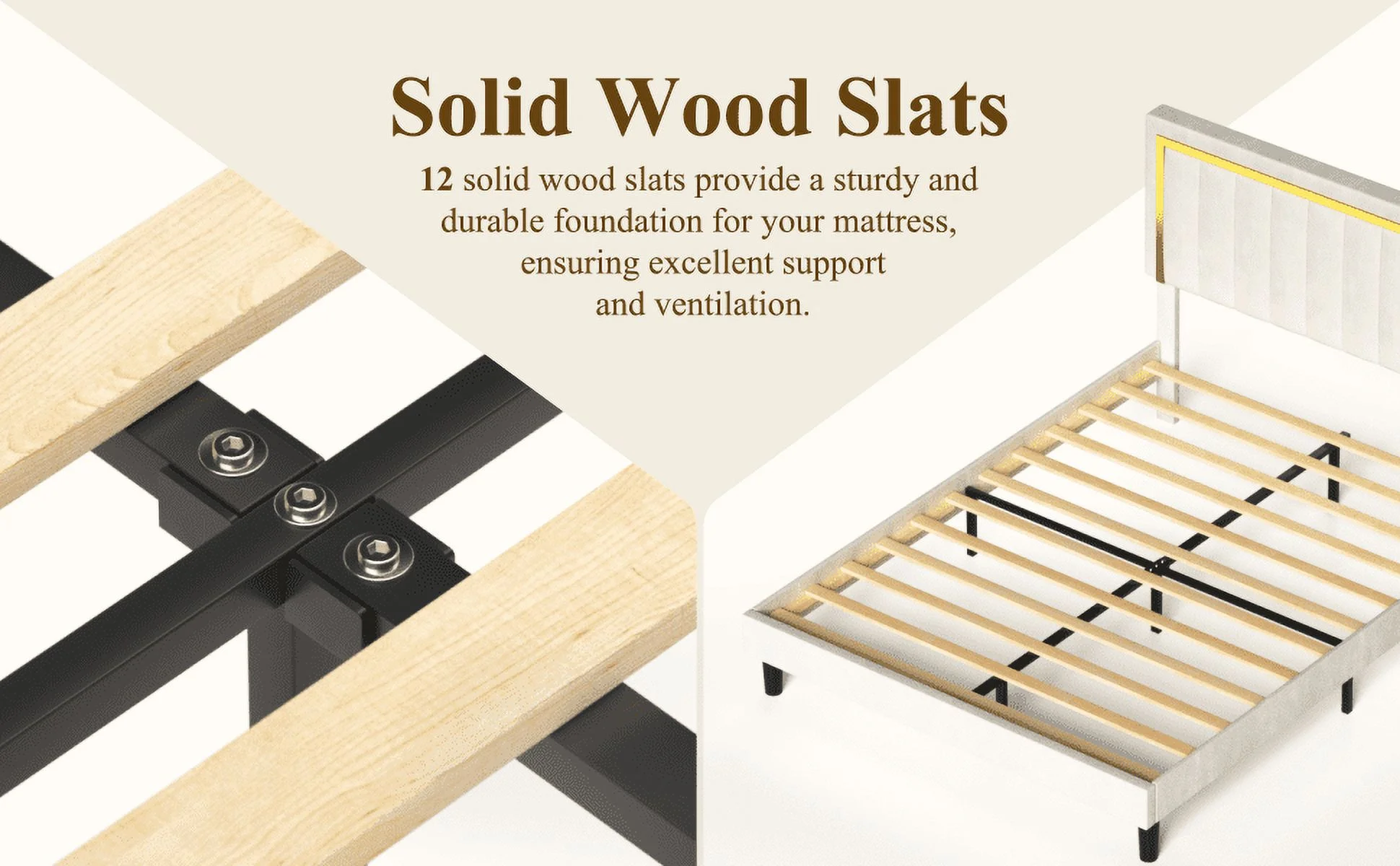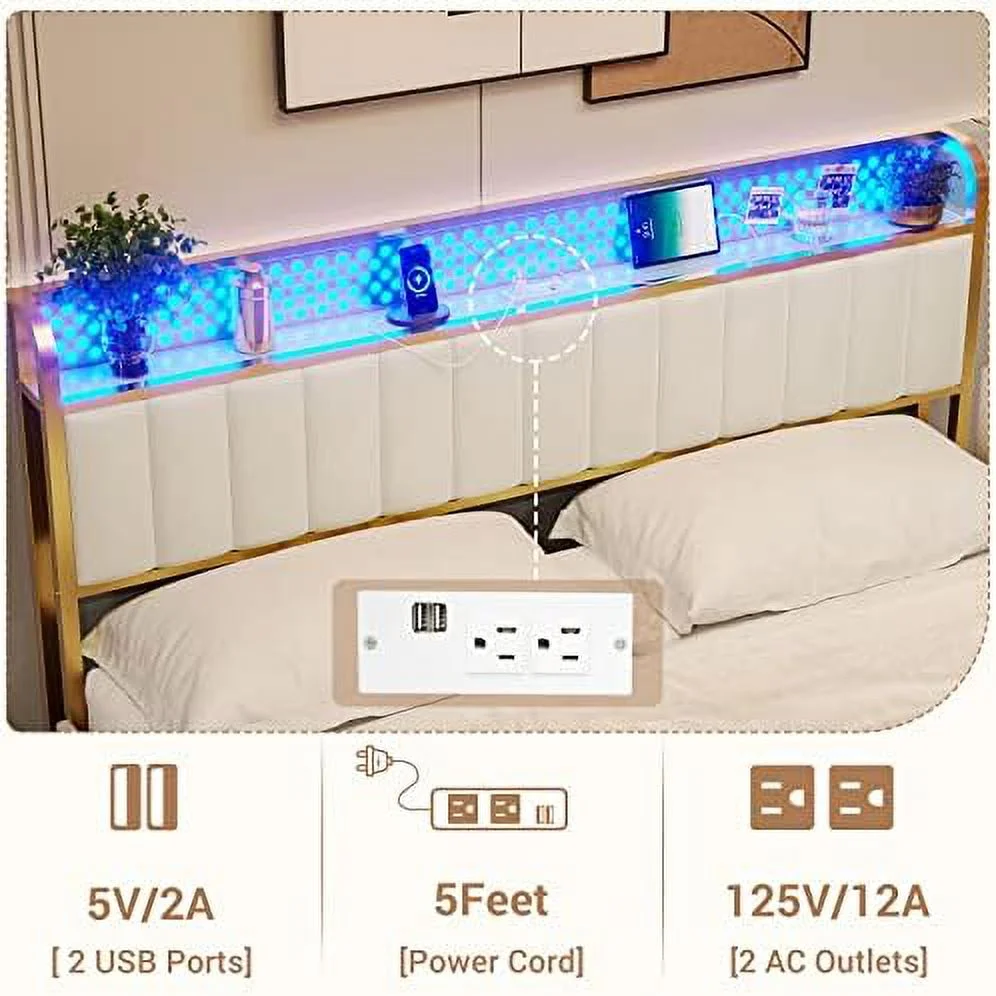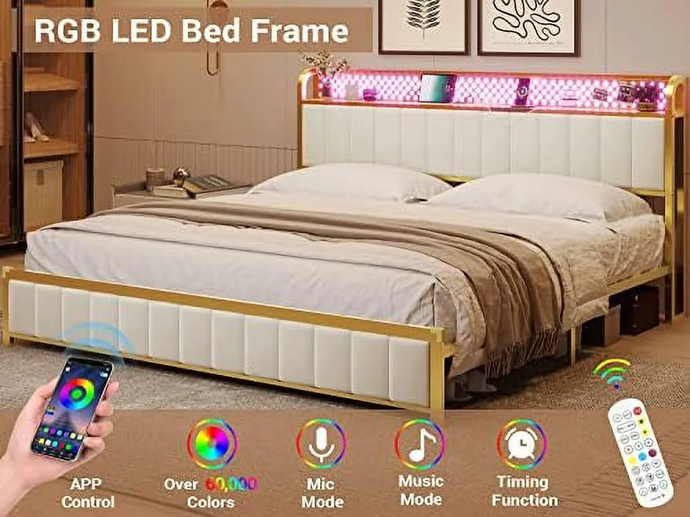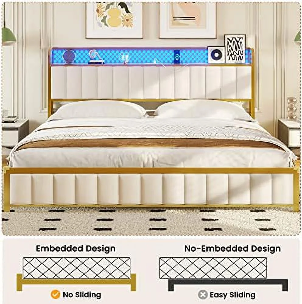 Full Upholstered Smart LED Bed Frame with Elegant Flowers Headboard Beige