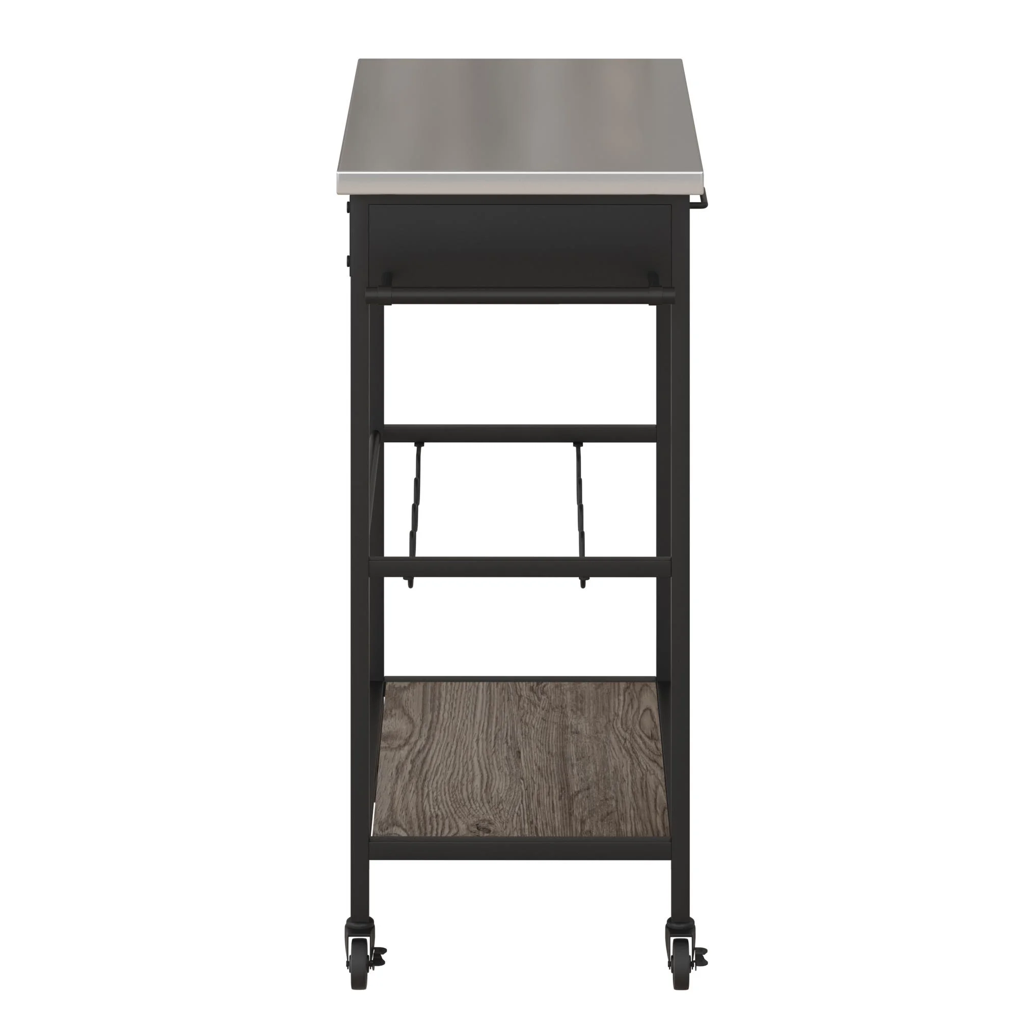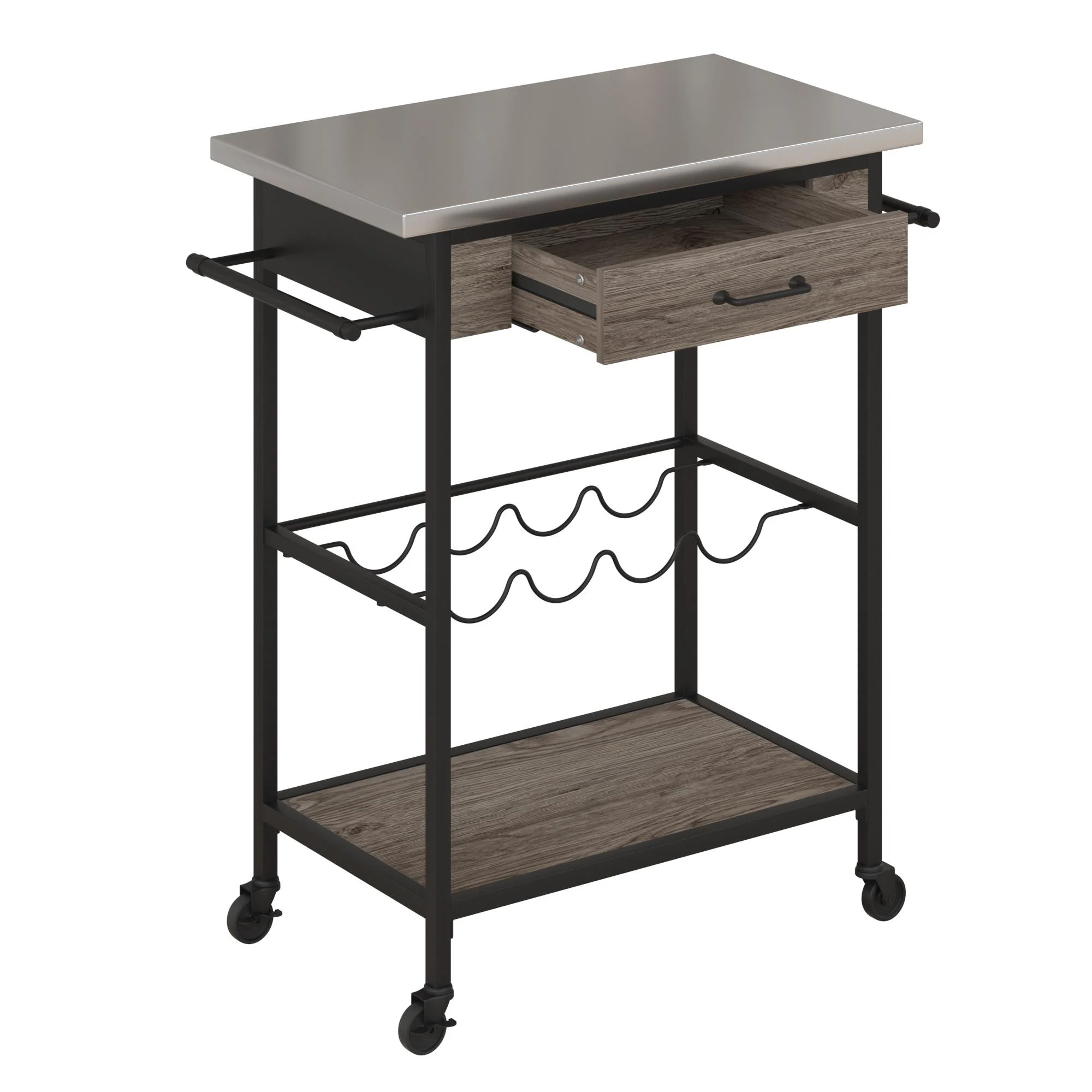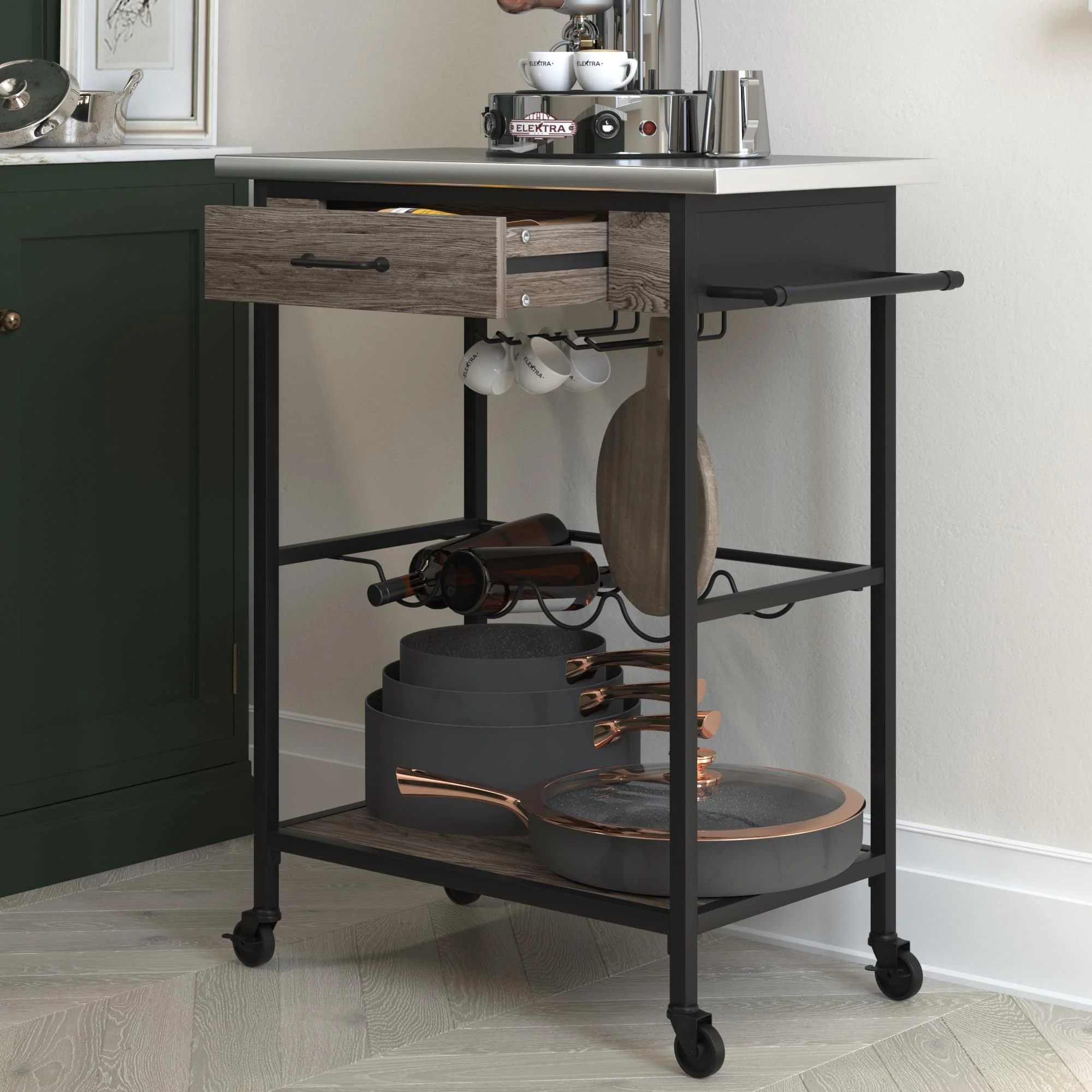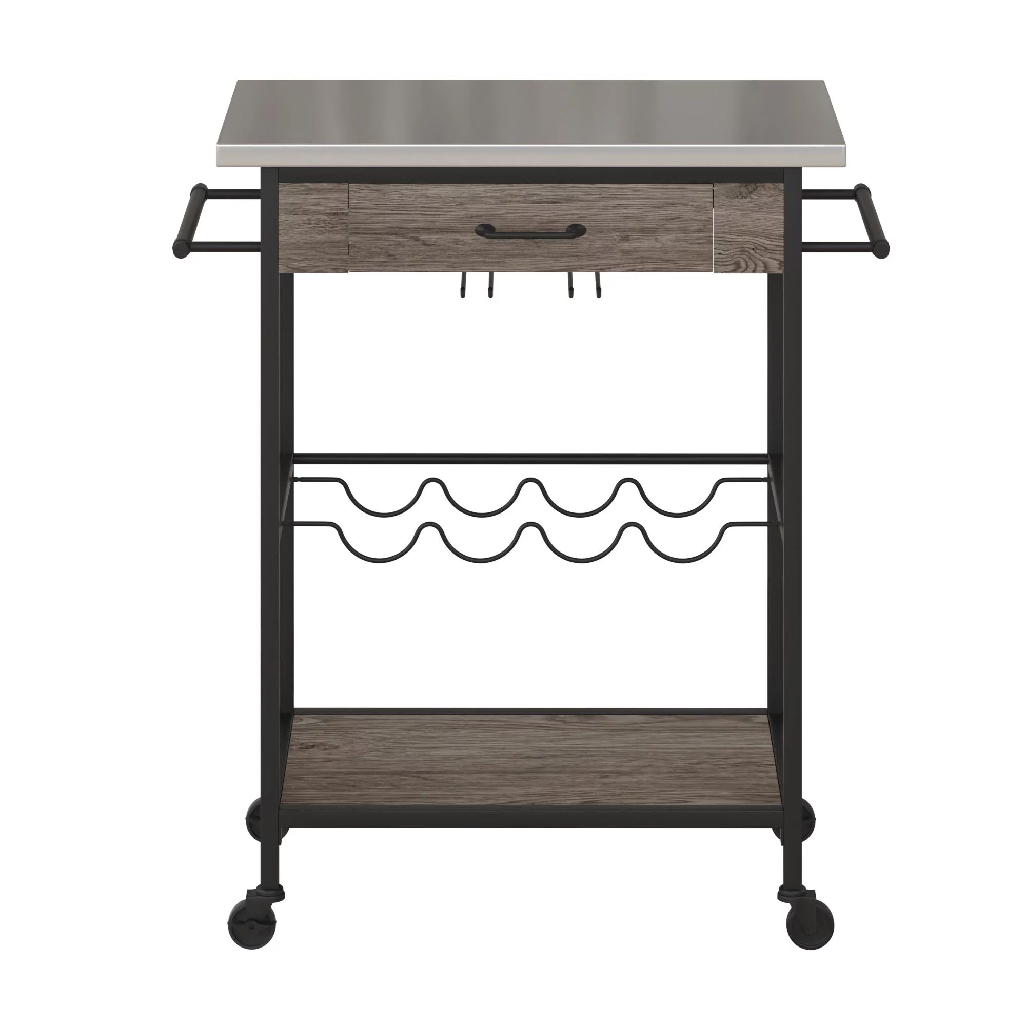 Novogratz Nora Multifunctional Kitchen Cart, Wine Rack and Pantry Storage, Stainless Steel and Black Metal, Brown