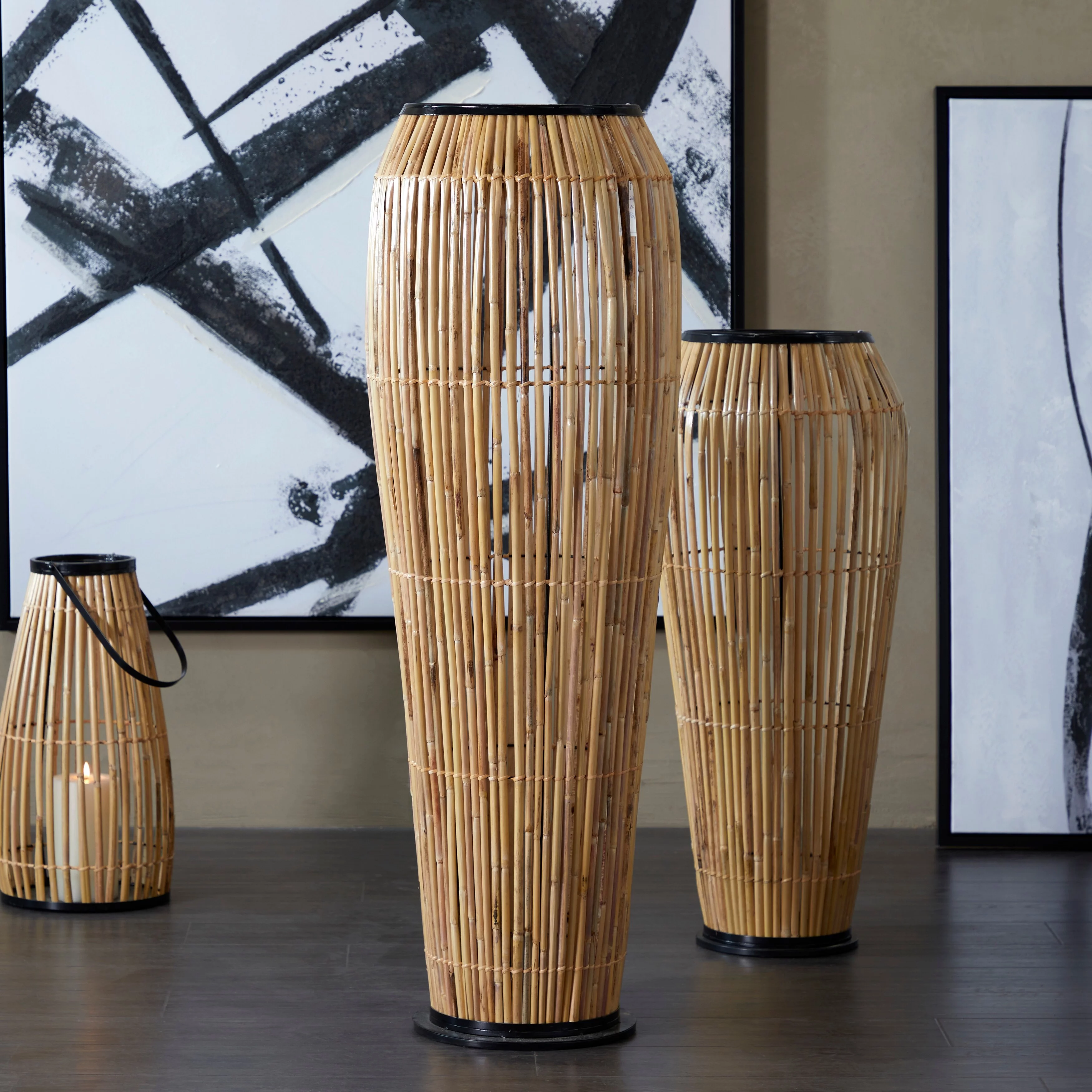 The Novogratz Handmade Slatted Frame Vase with Black Metal Accents 15.00W x 15.00L x 46.50H - Light Brown