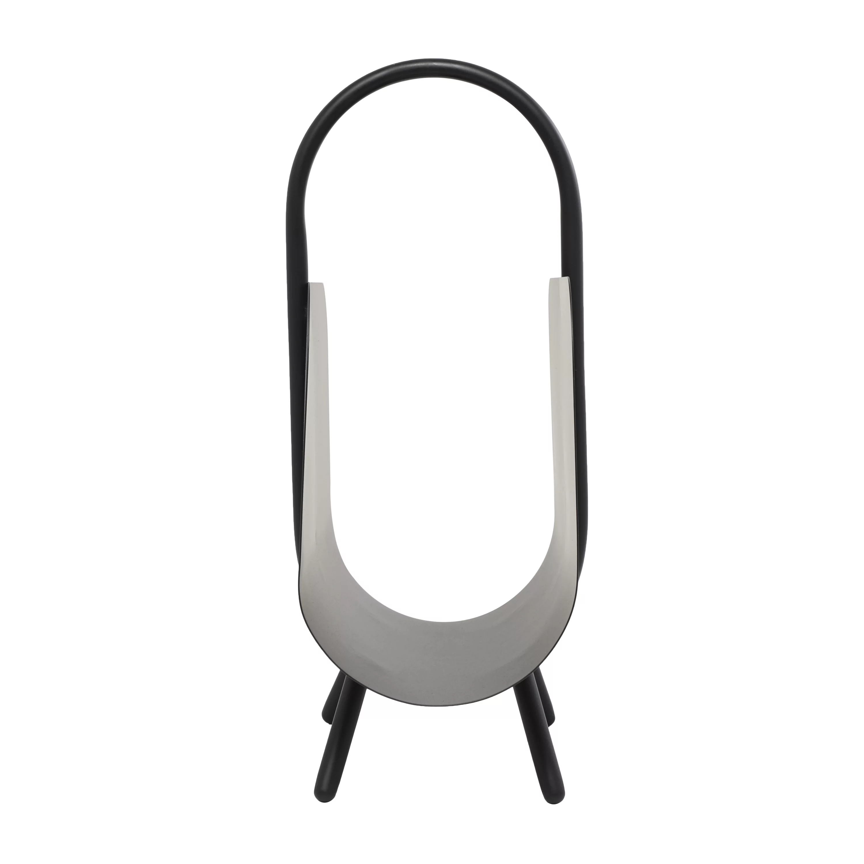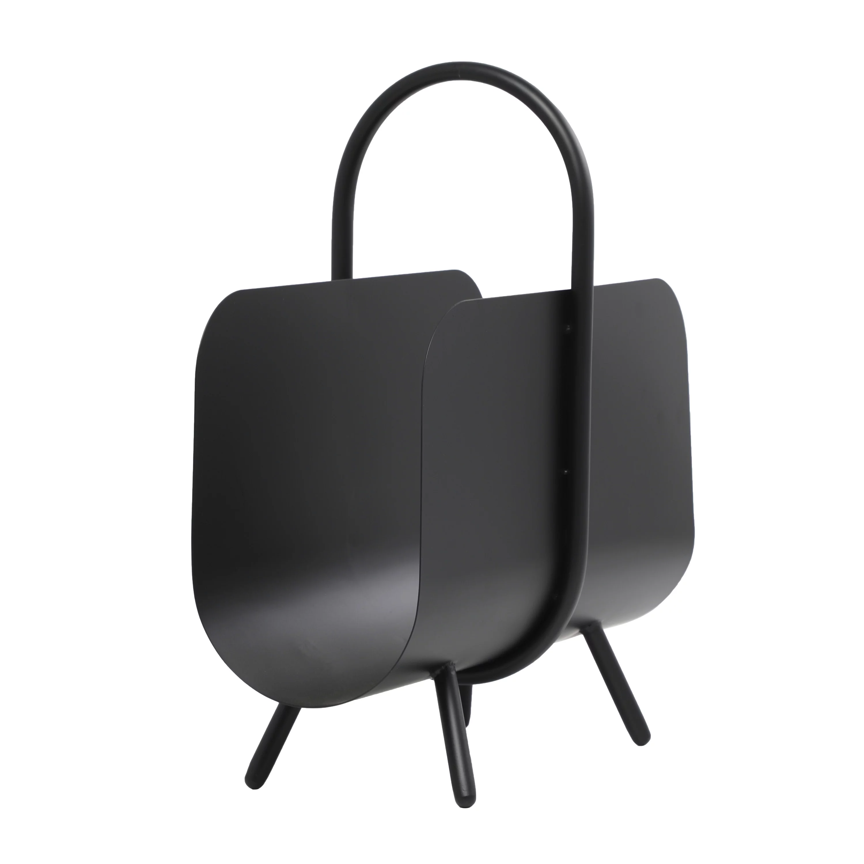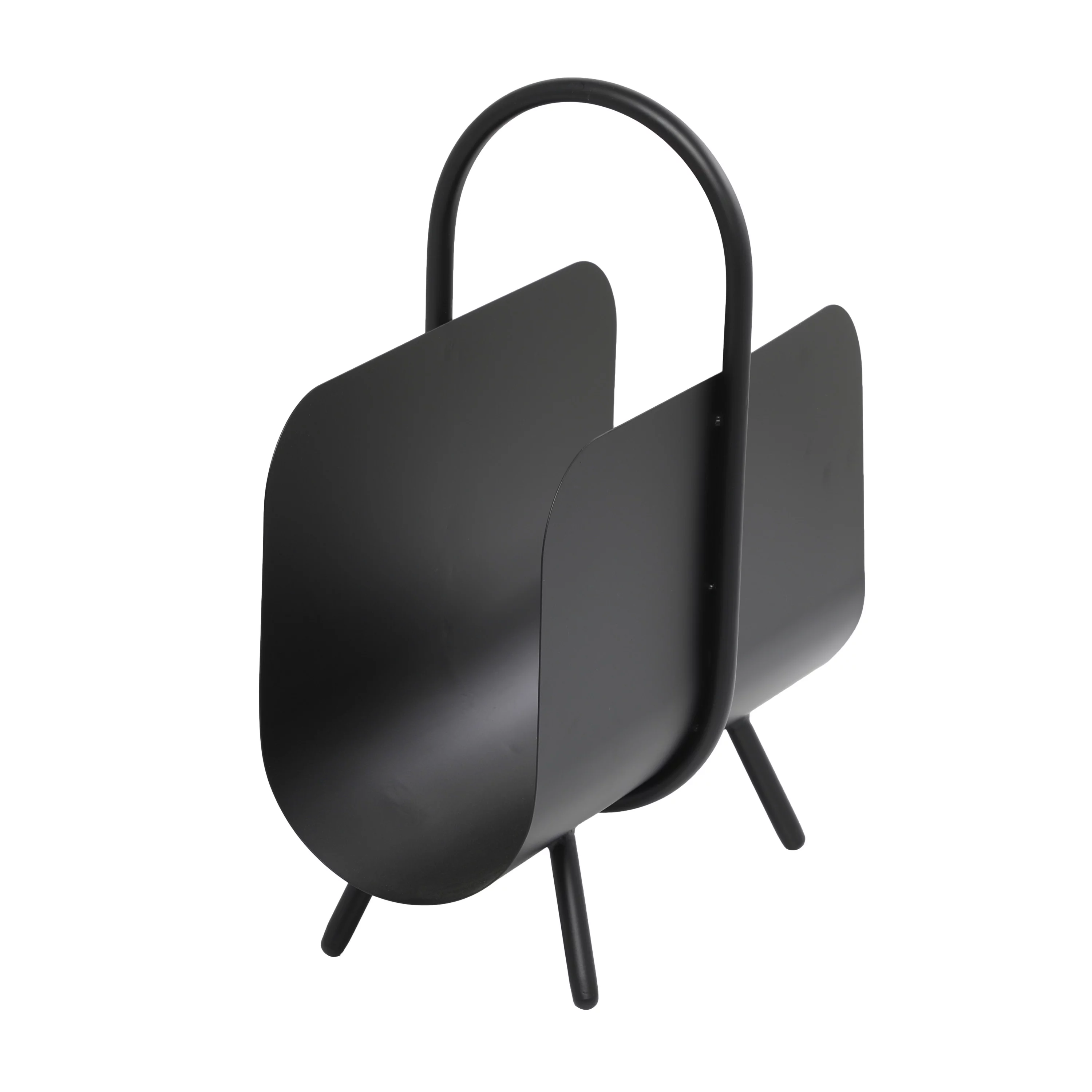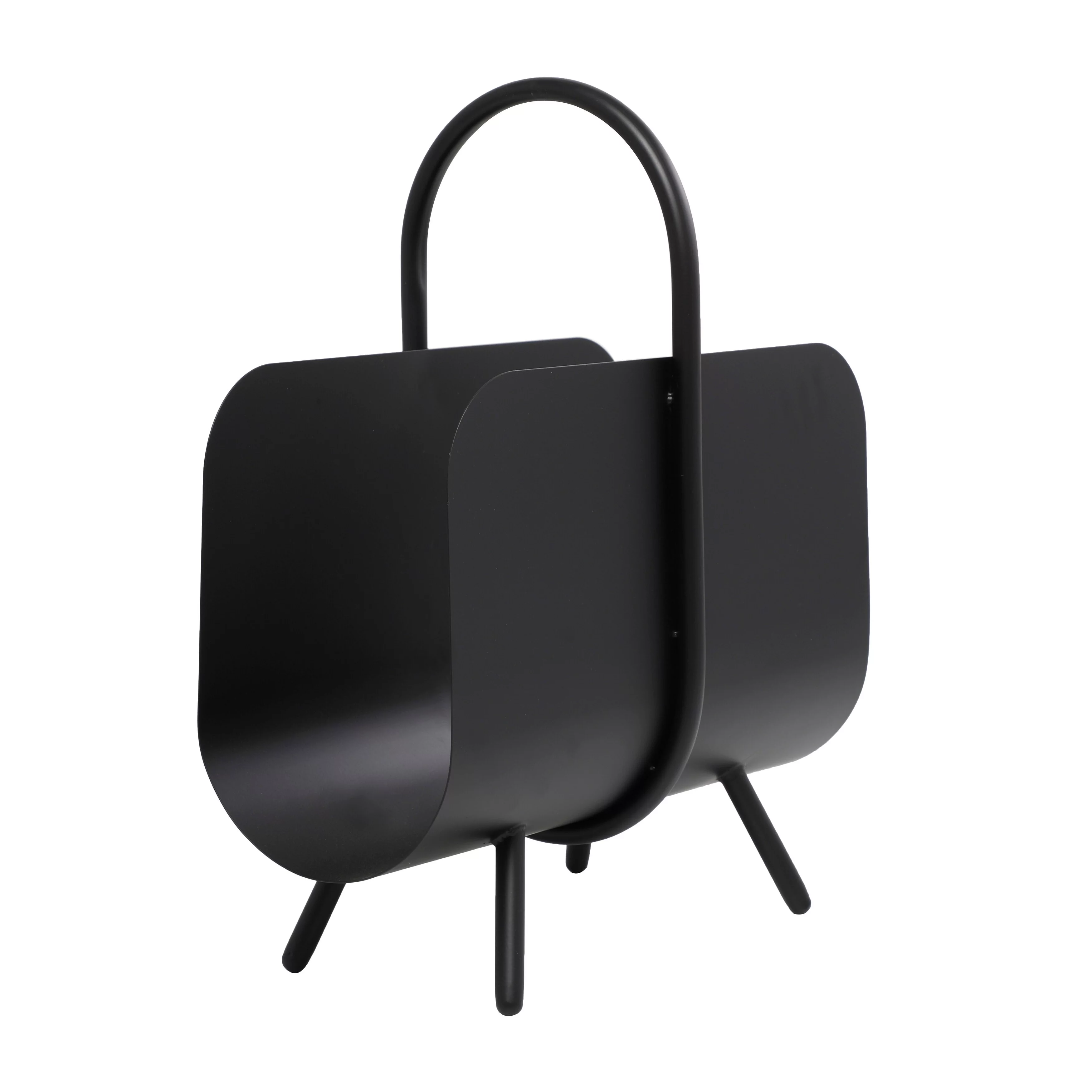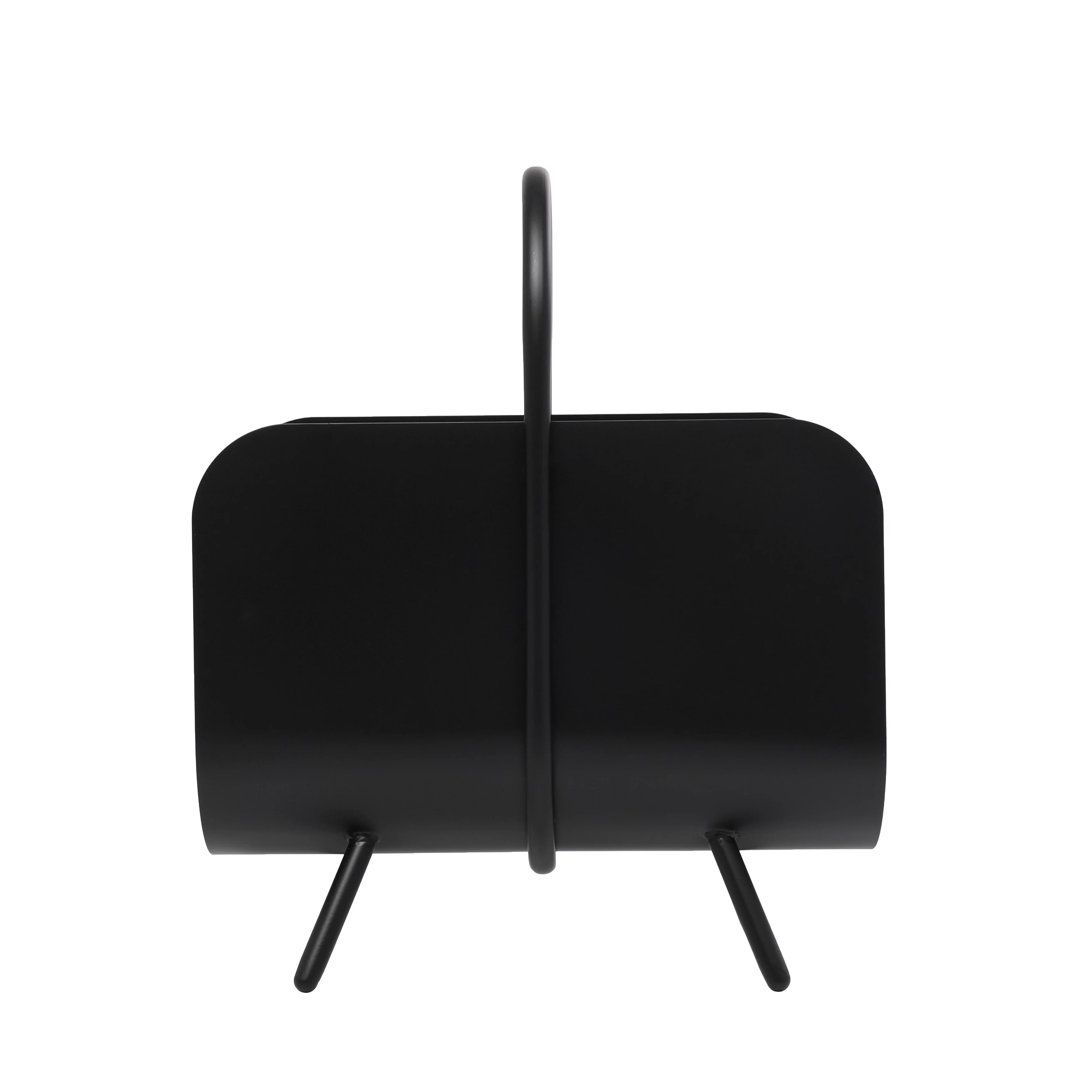 The Novogratz Black Metal Curved Magazine Holder with Arched Handle and Flared Legs