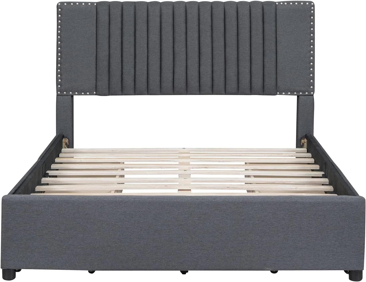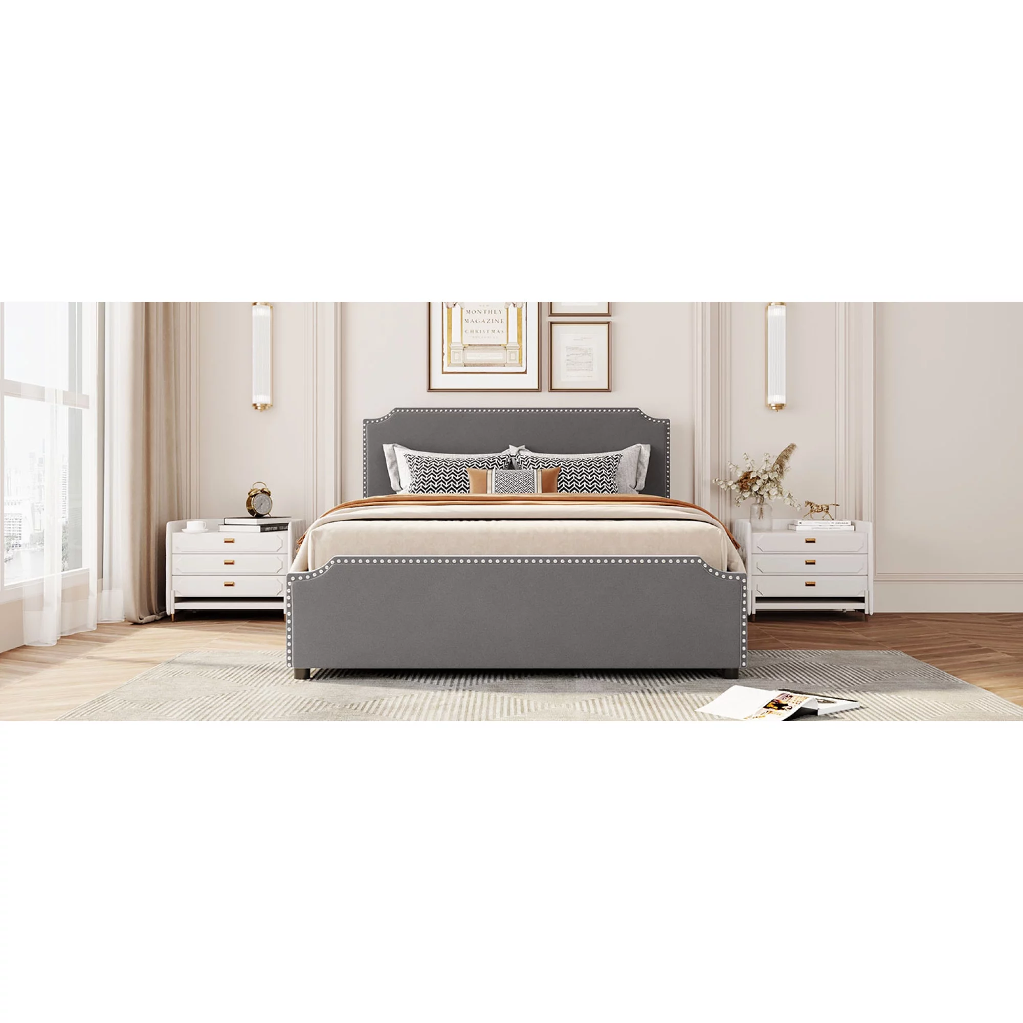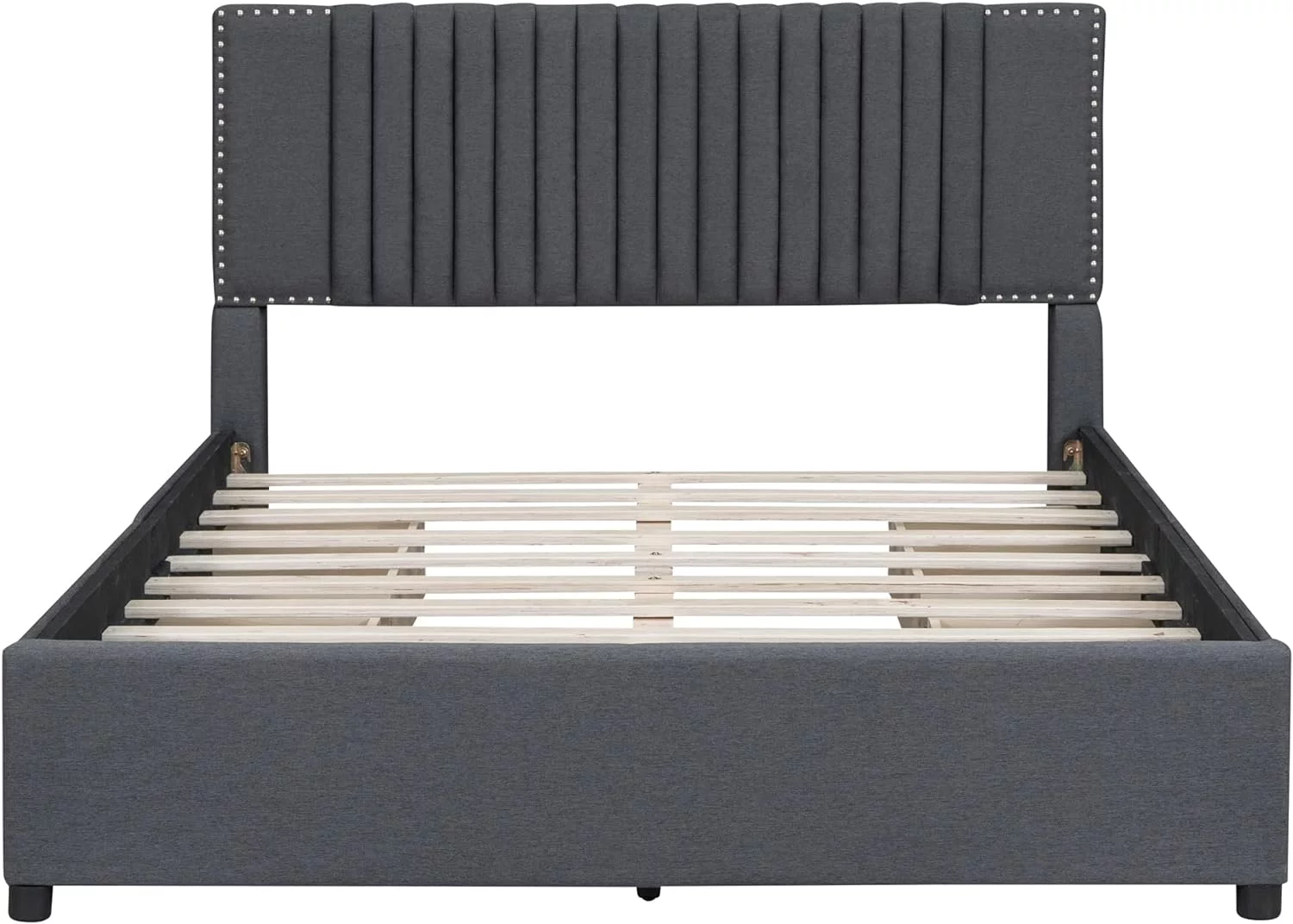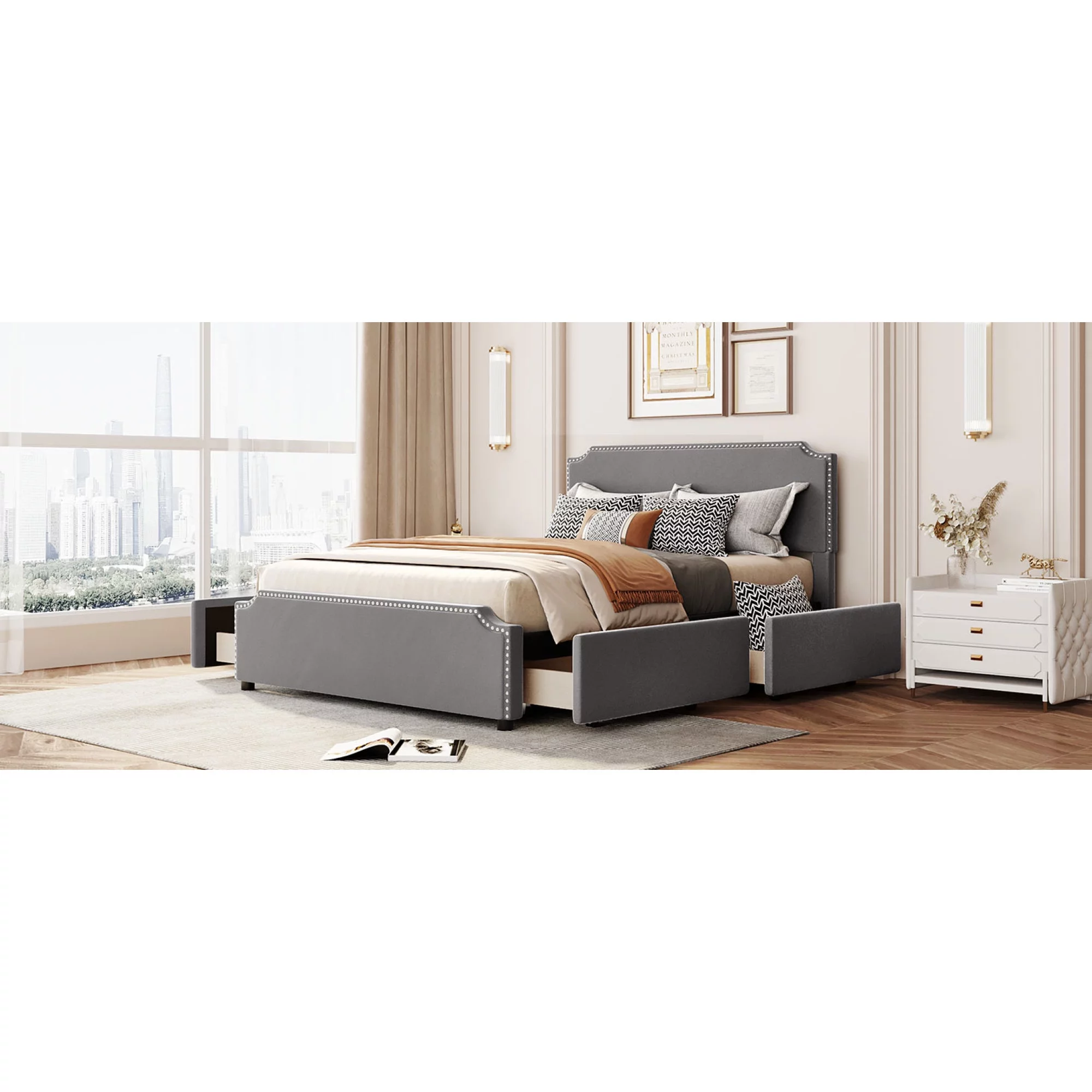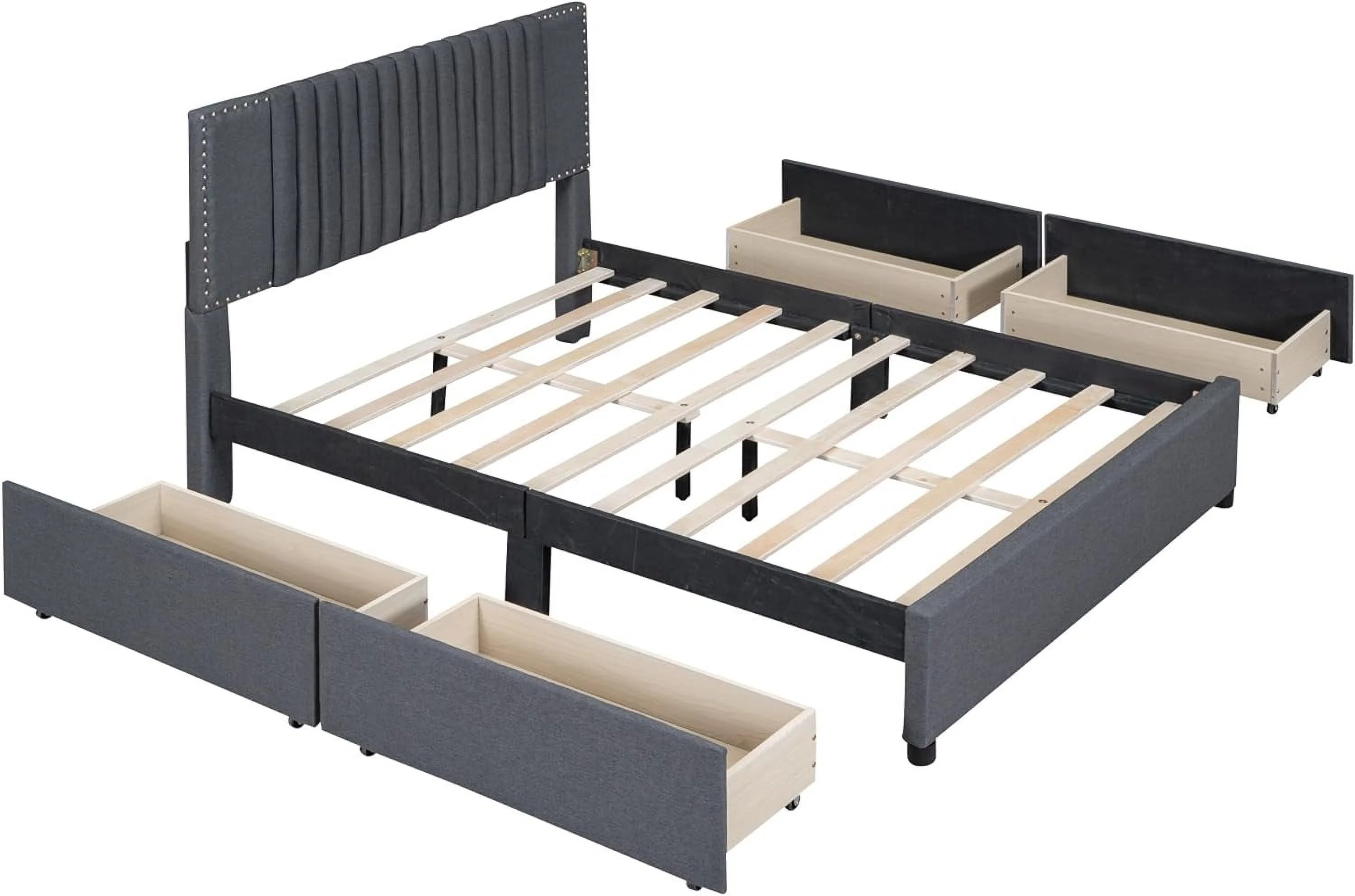 Upholstered Platform Queen Bed with Stud Trim Headboard and Footboard and 4 Drawers, Gray