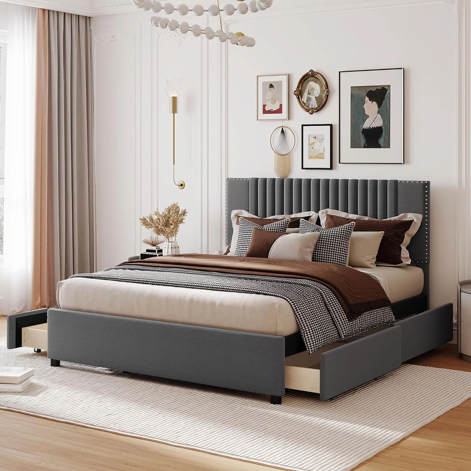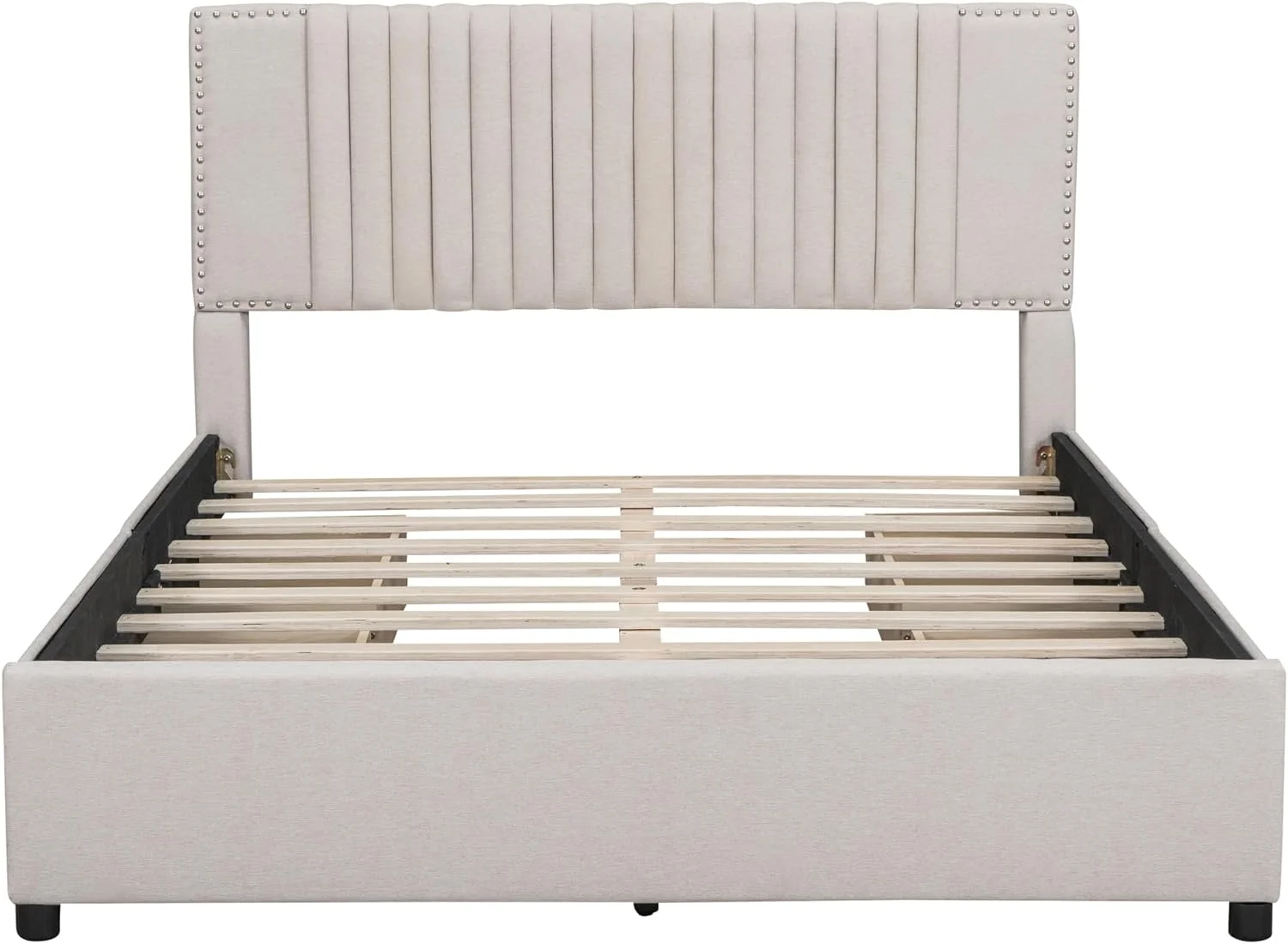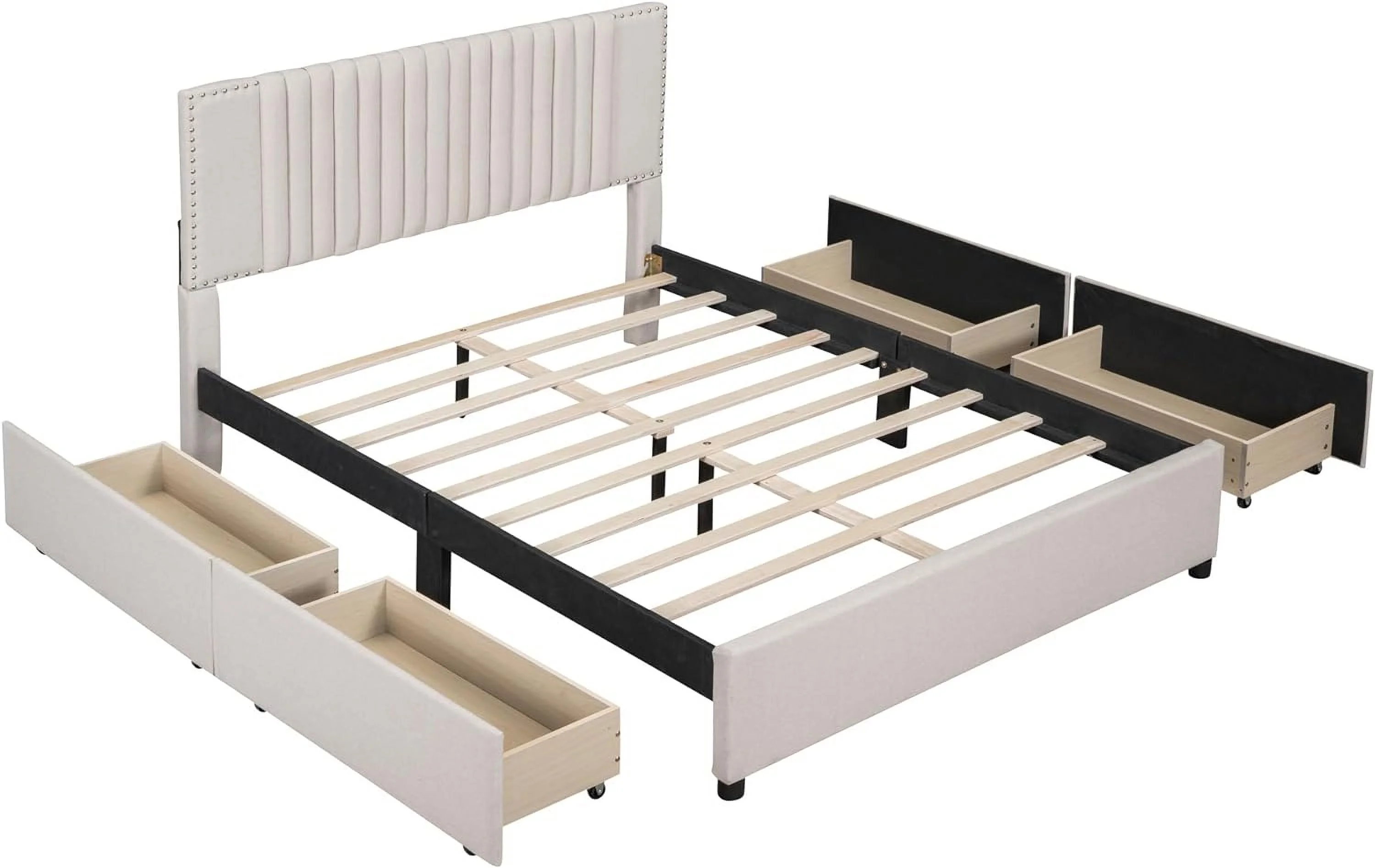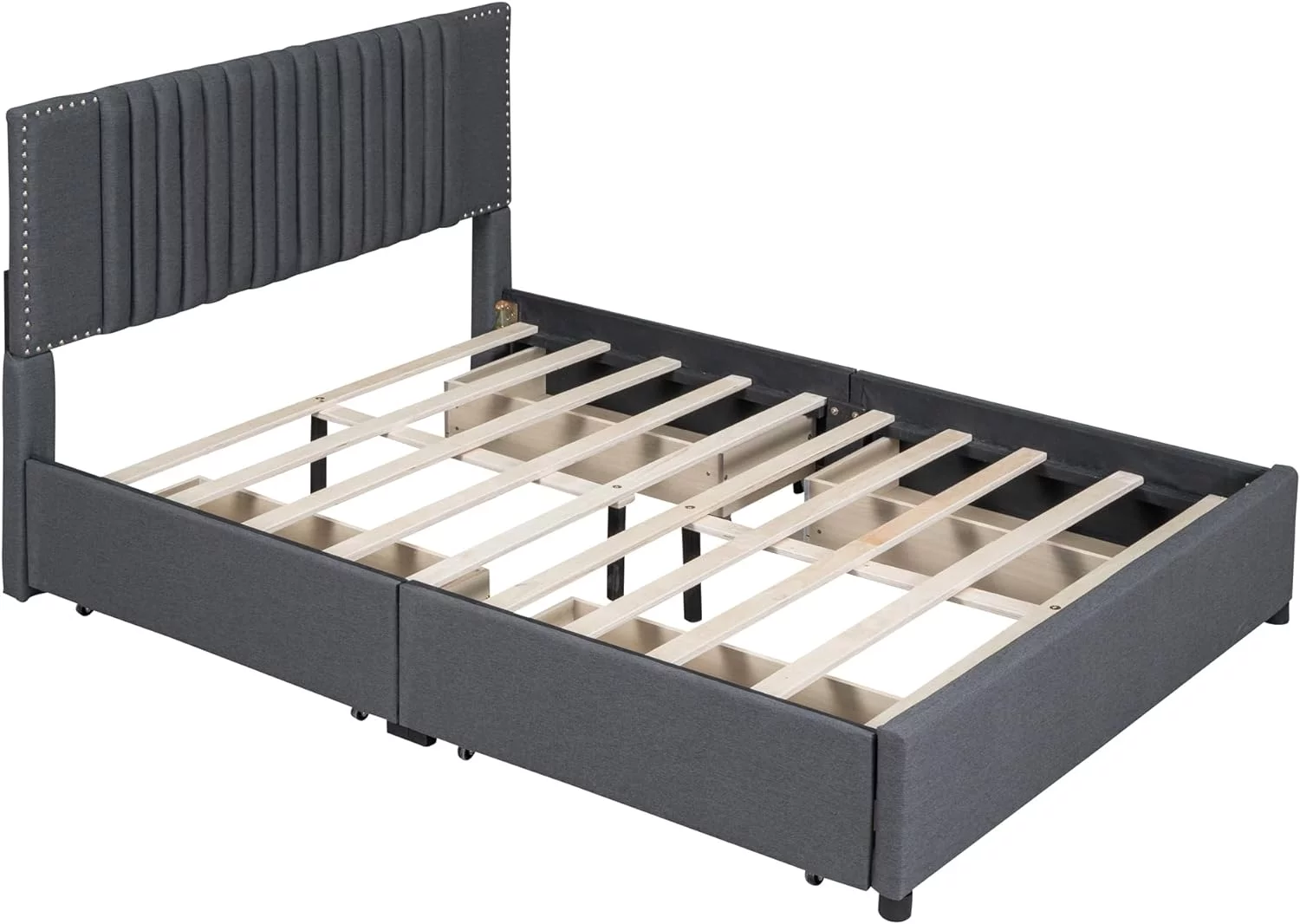 Upholstered Platform Queen Bed with Stud Trim Headboard and Footboard and 4 Drawers, Gray