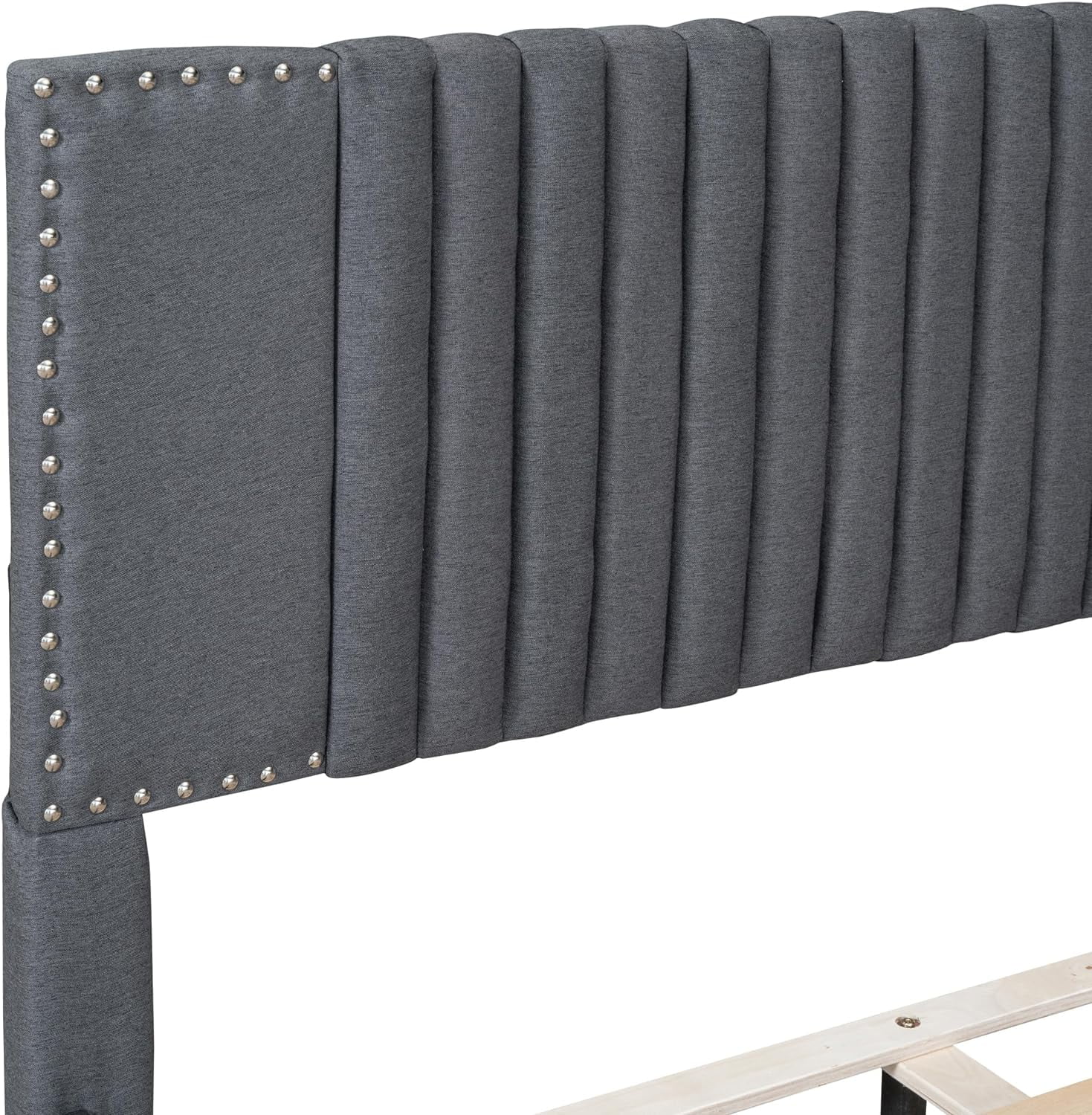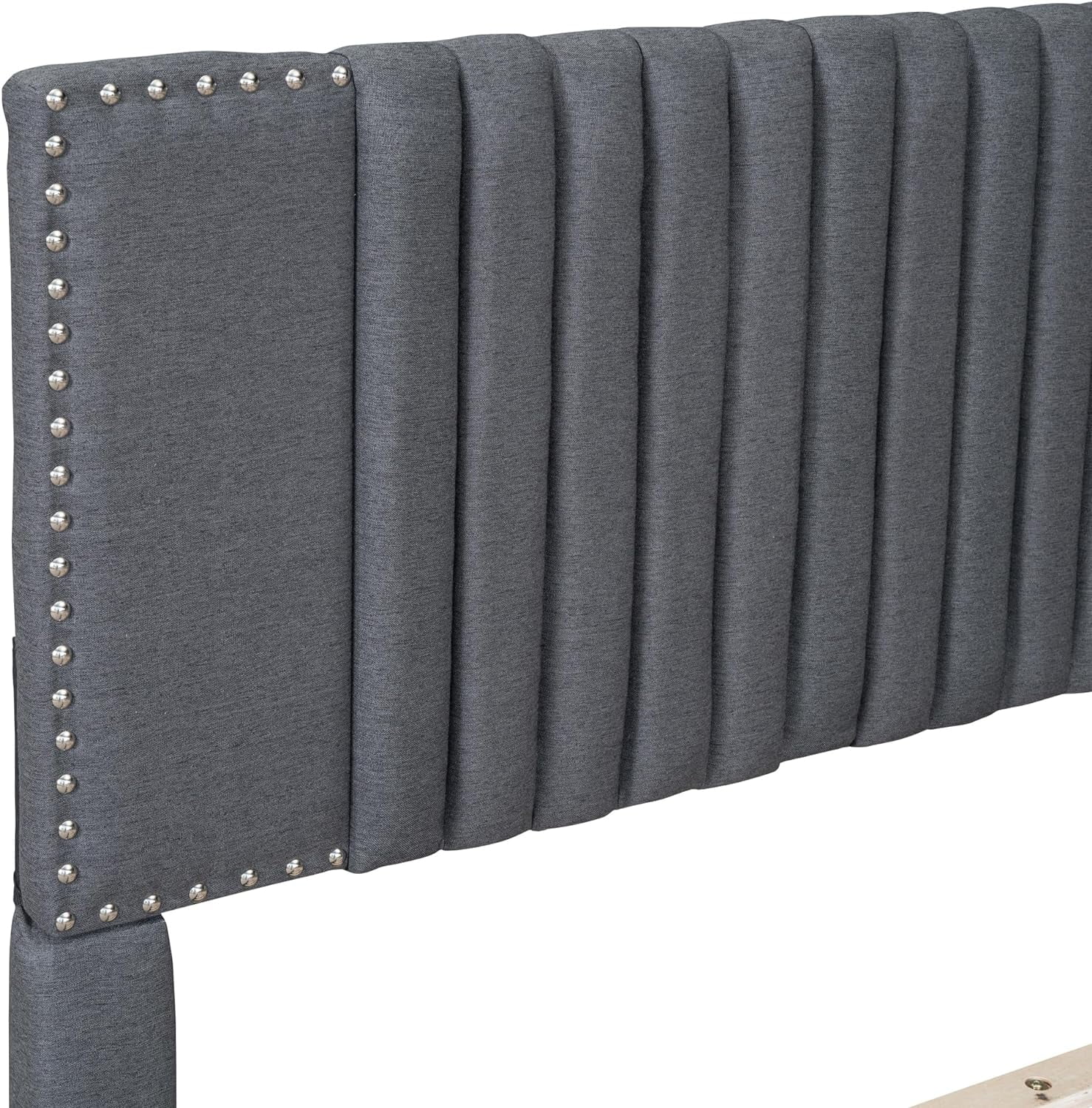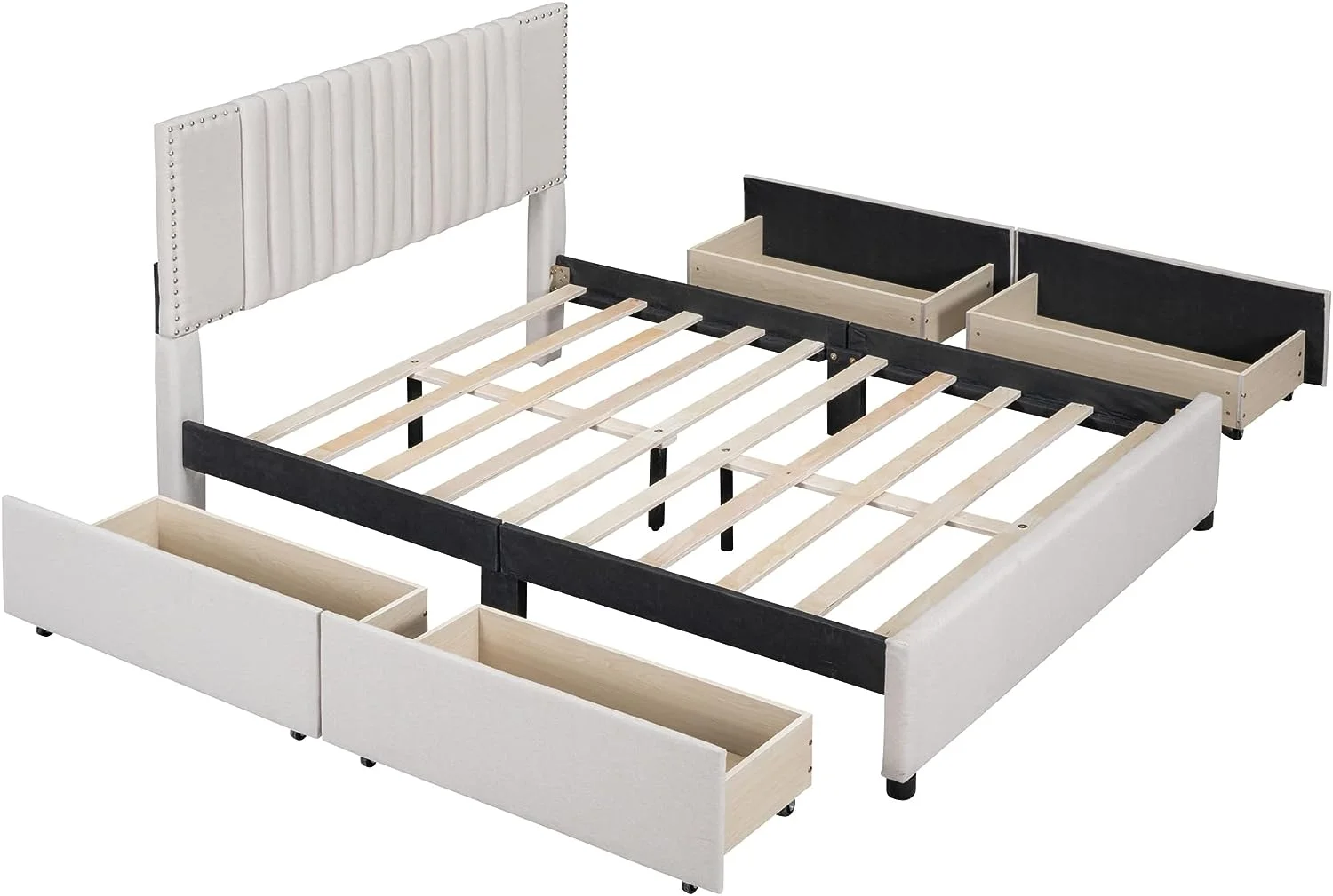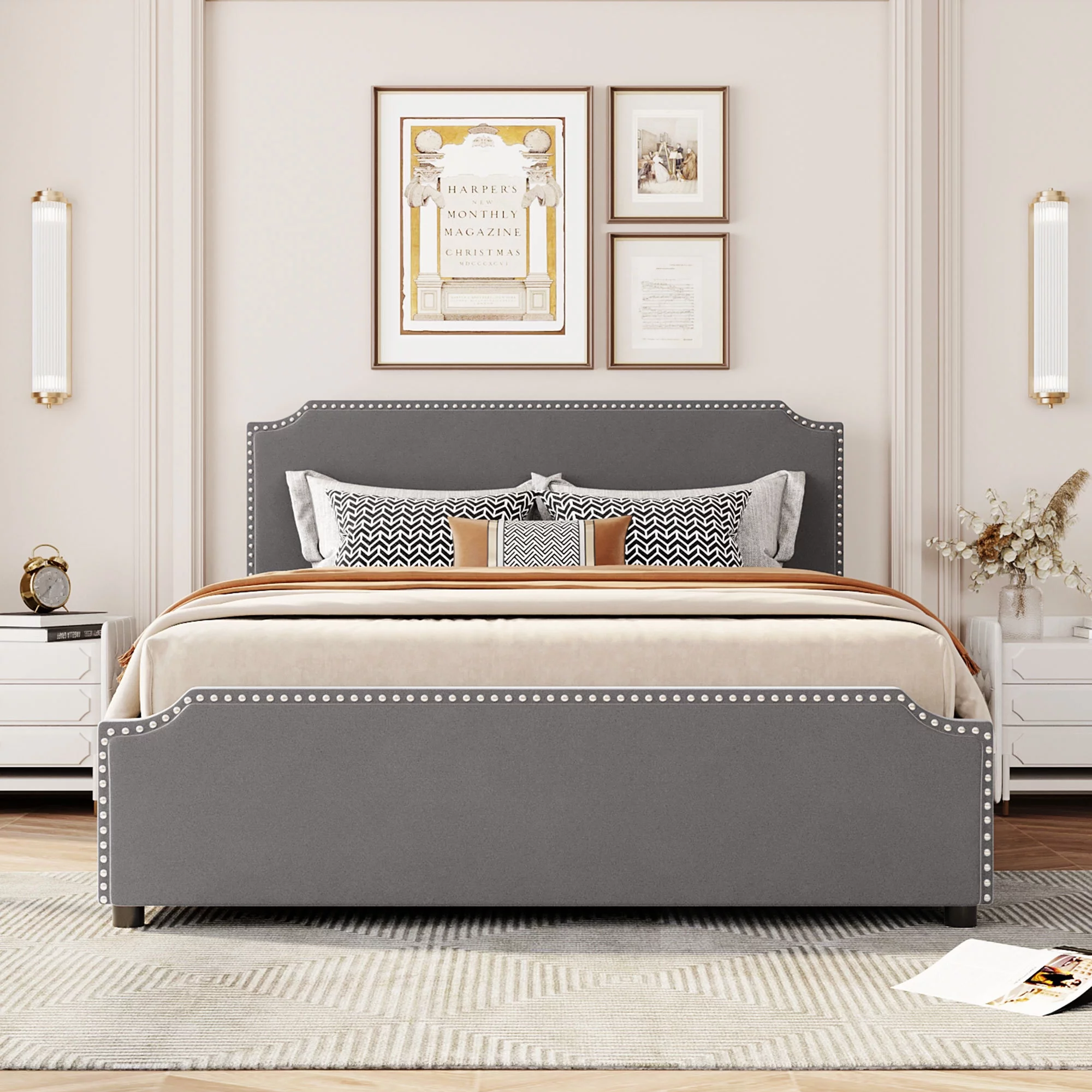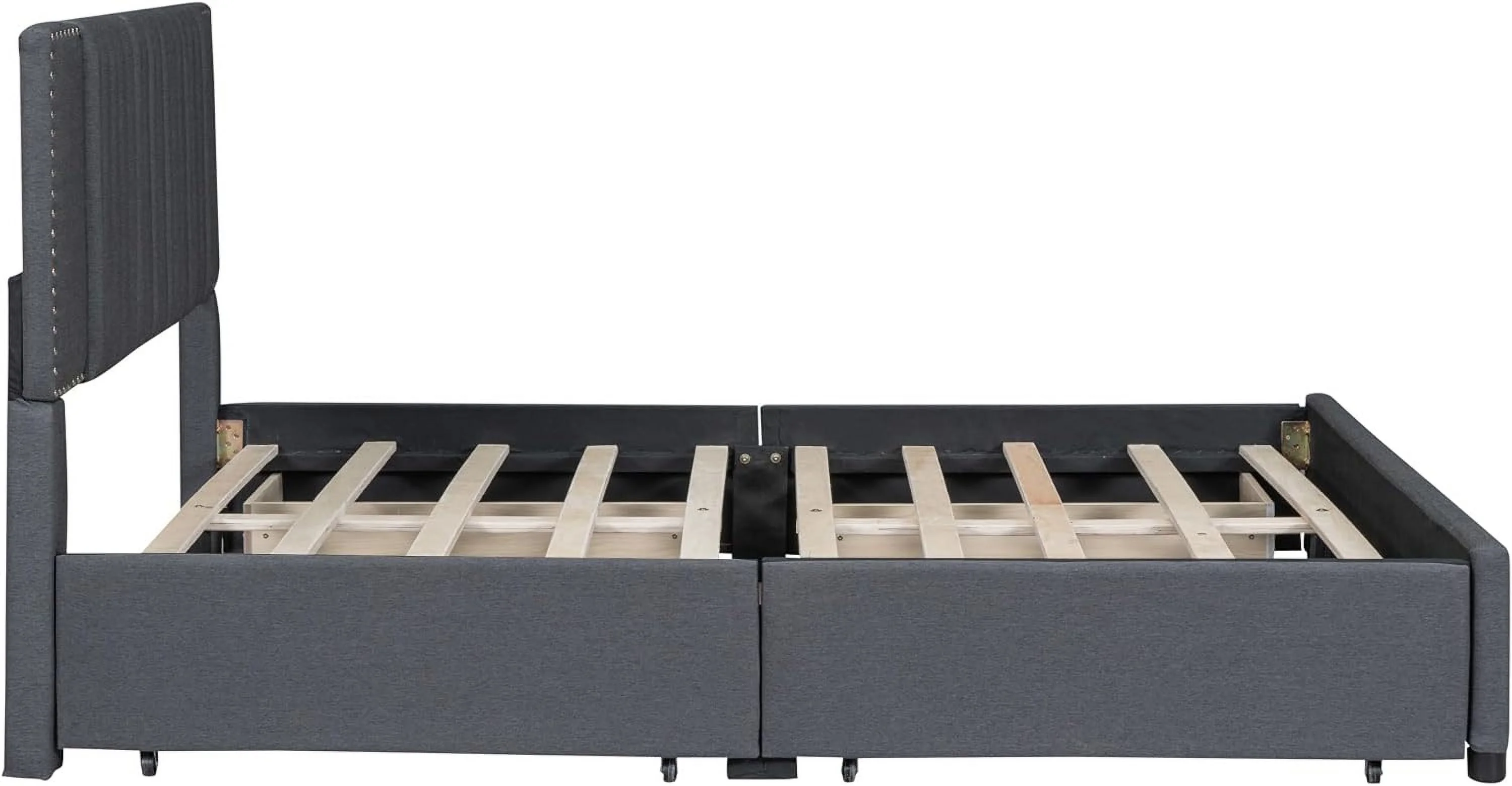 Upholstered Platform Queen Bed with Stud Trim Headboard and Footboard and 4 Drawers, Gray