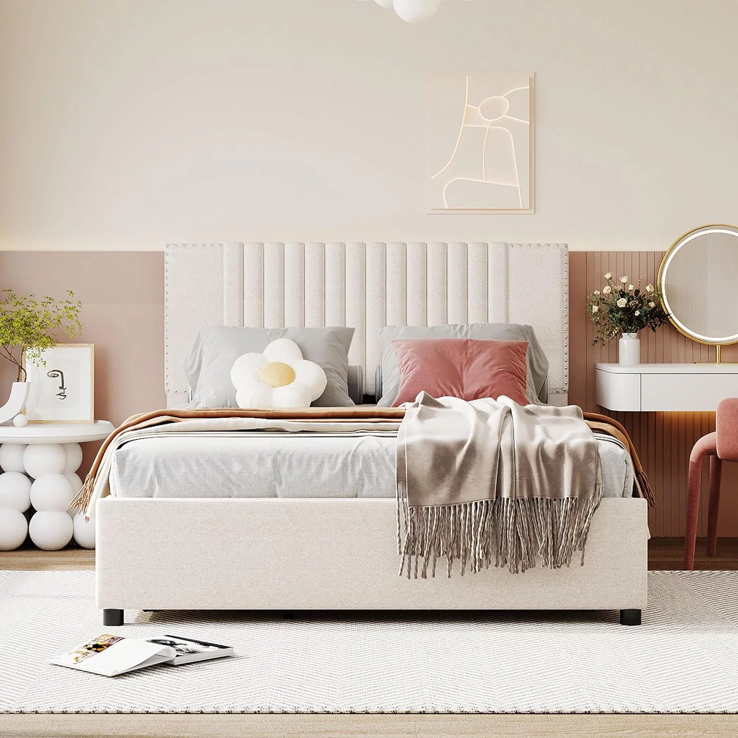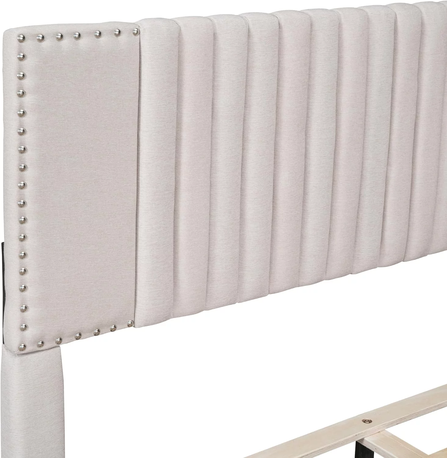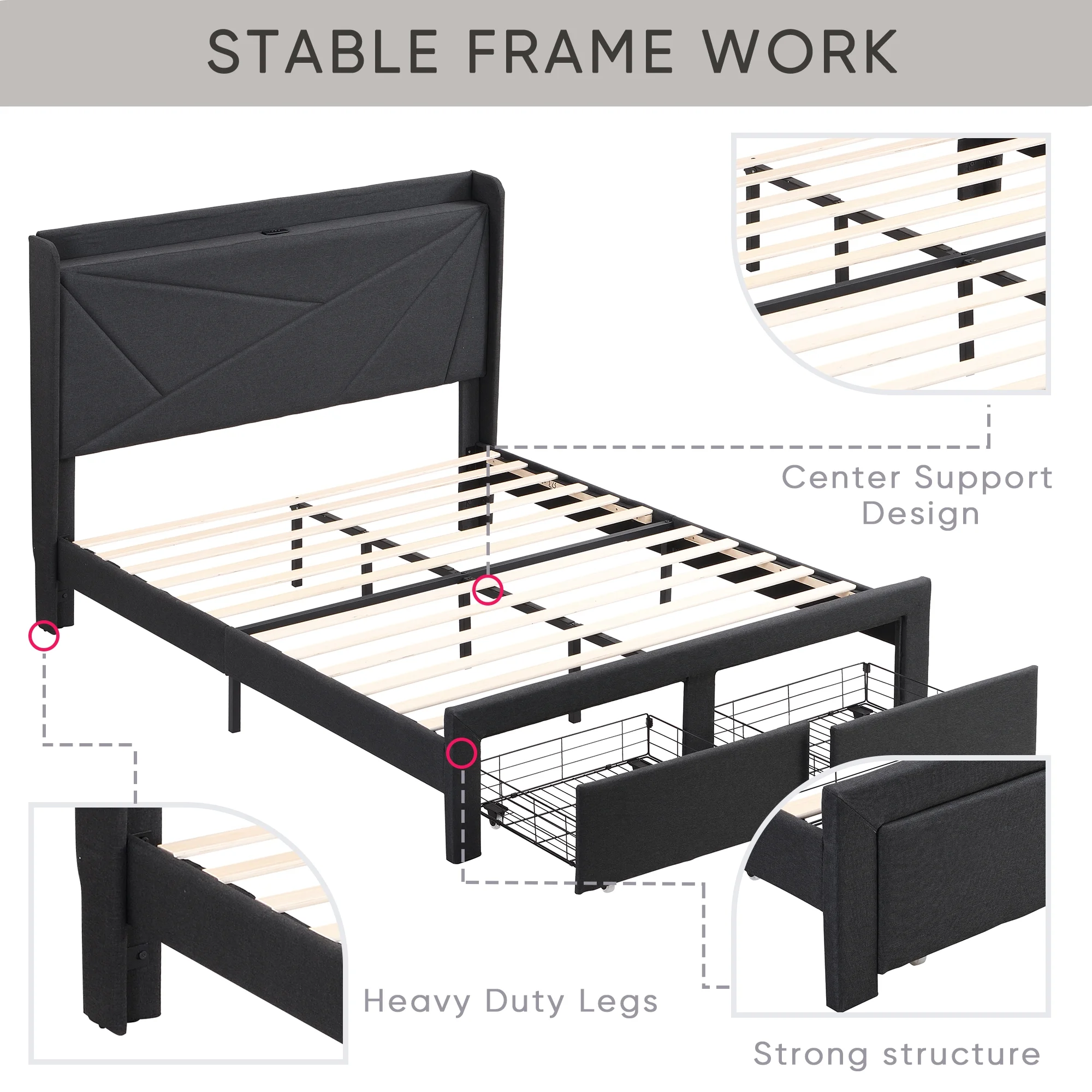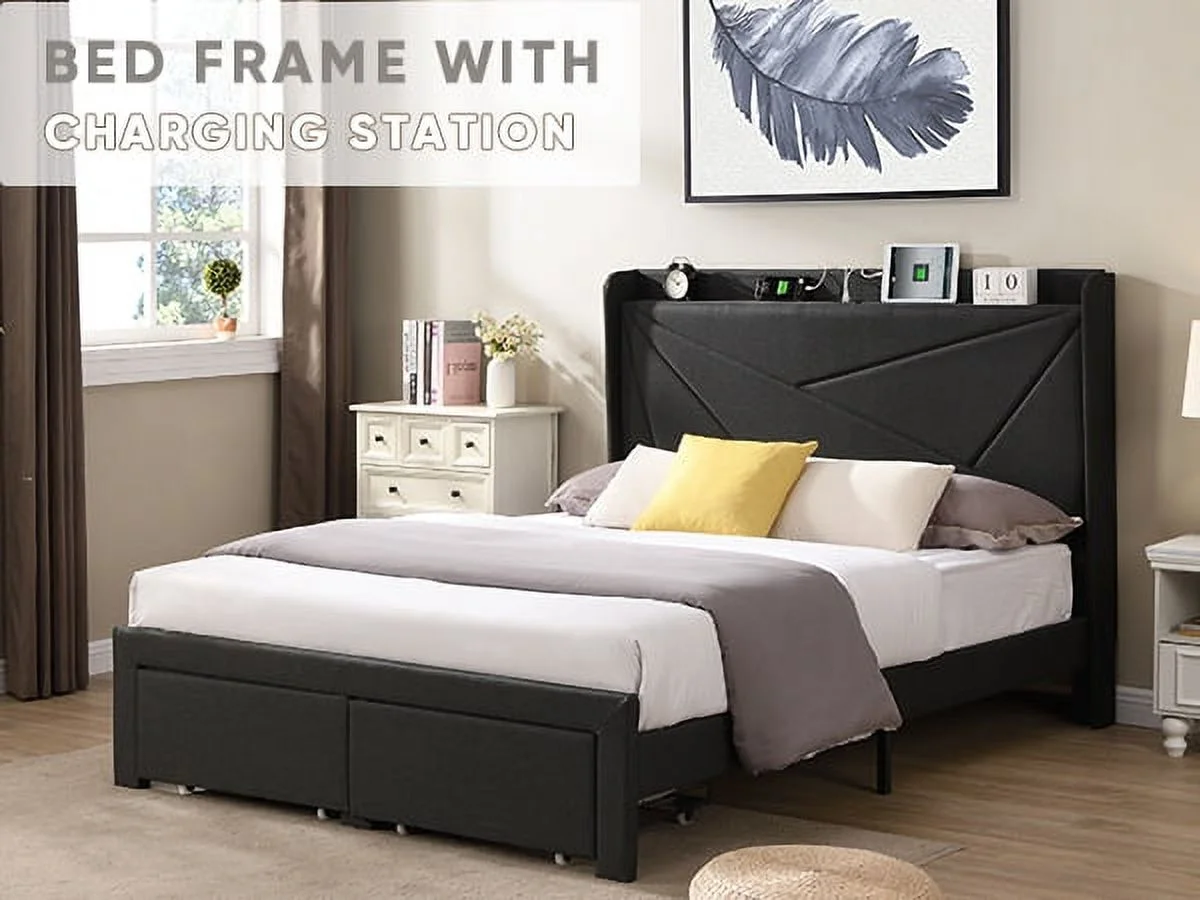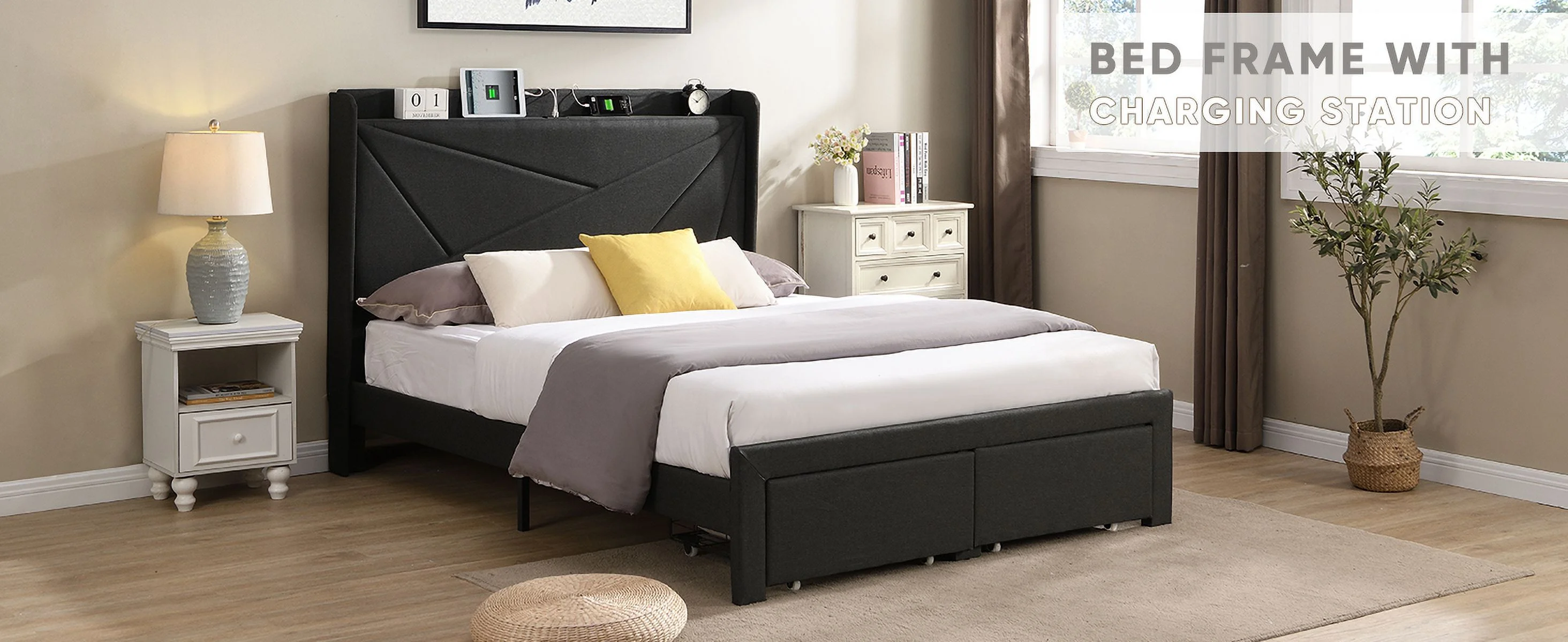 Upholstered Platform Queen Bed with Stud Trim Headboard and Footboard and 4 Drawers, Gray
