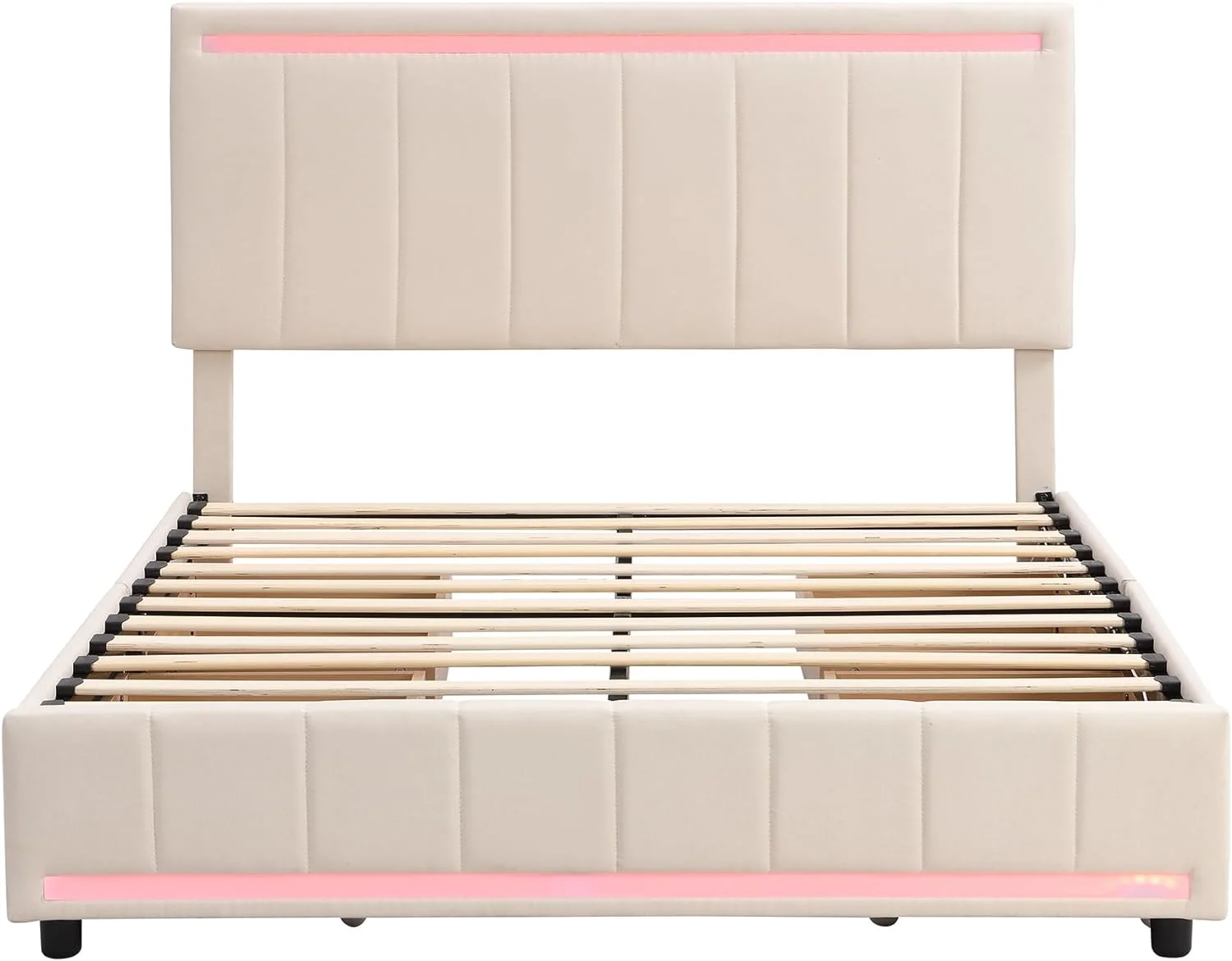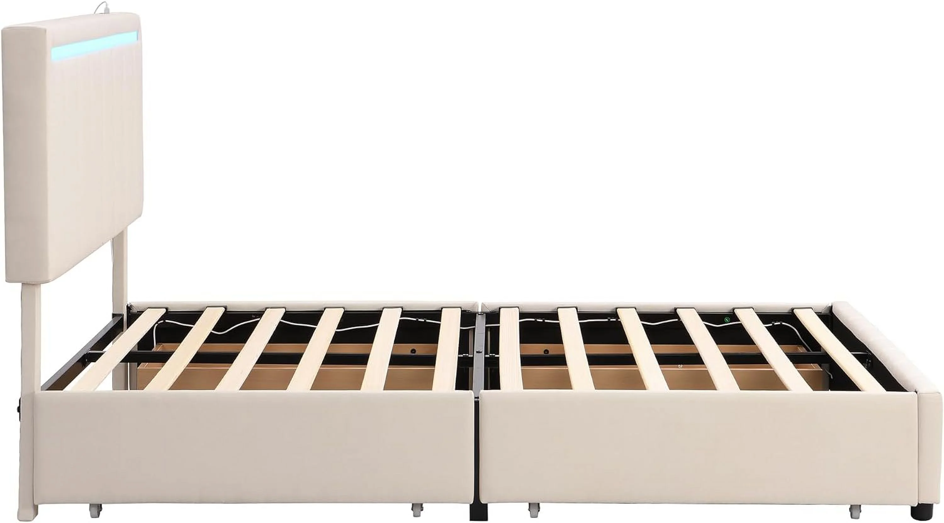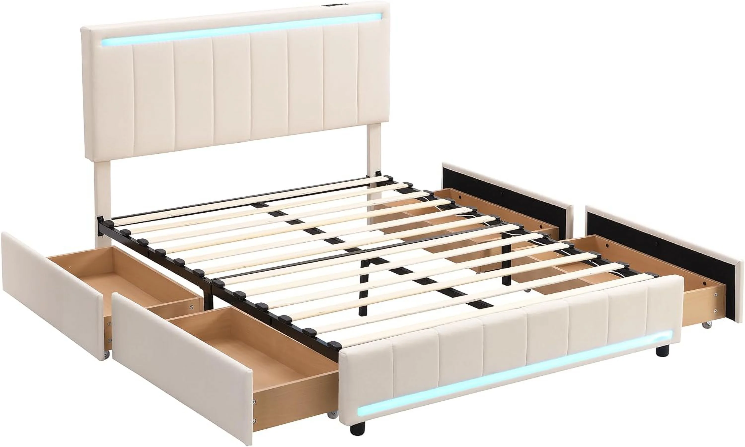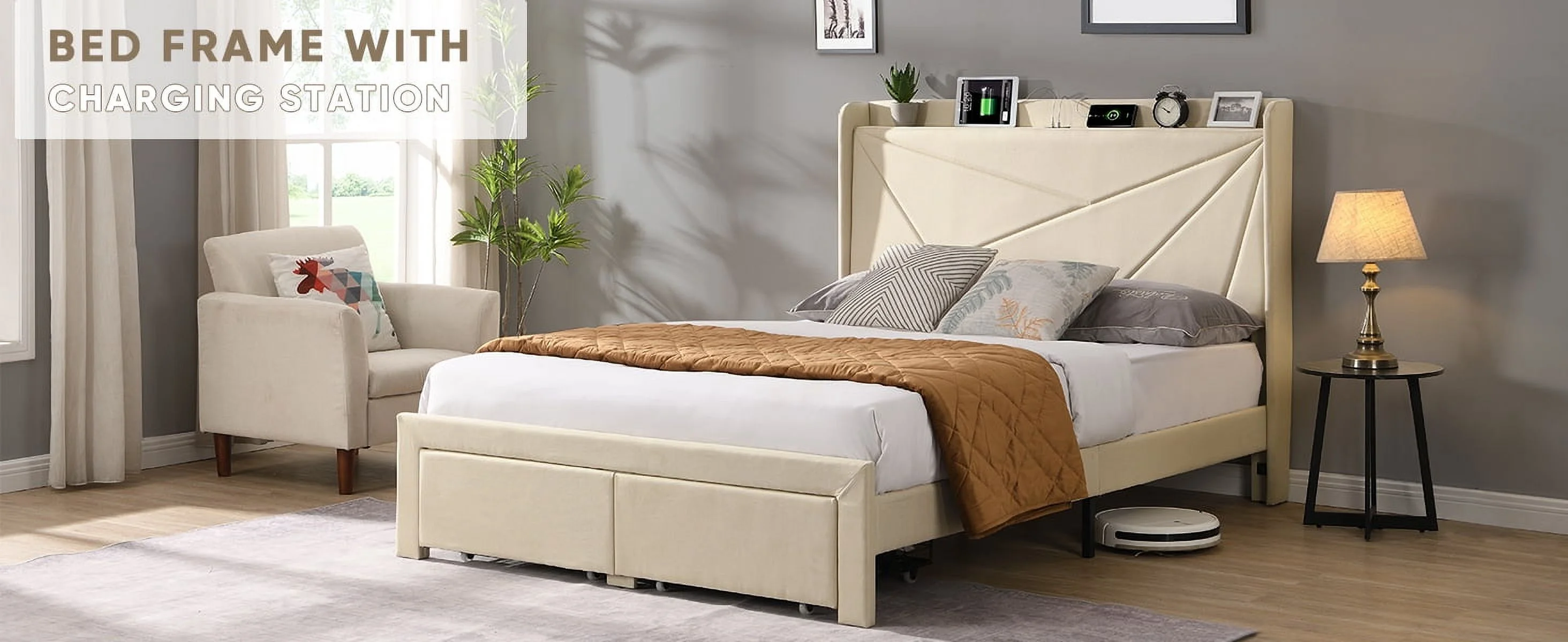 Upholstered Platform Queen Bed with Stud Trim Headboard and Footboard and 4 Drawers, Gray