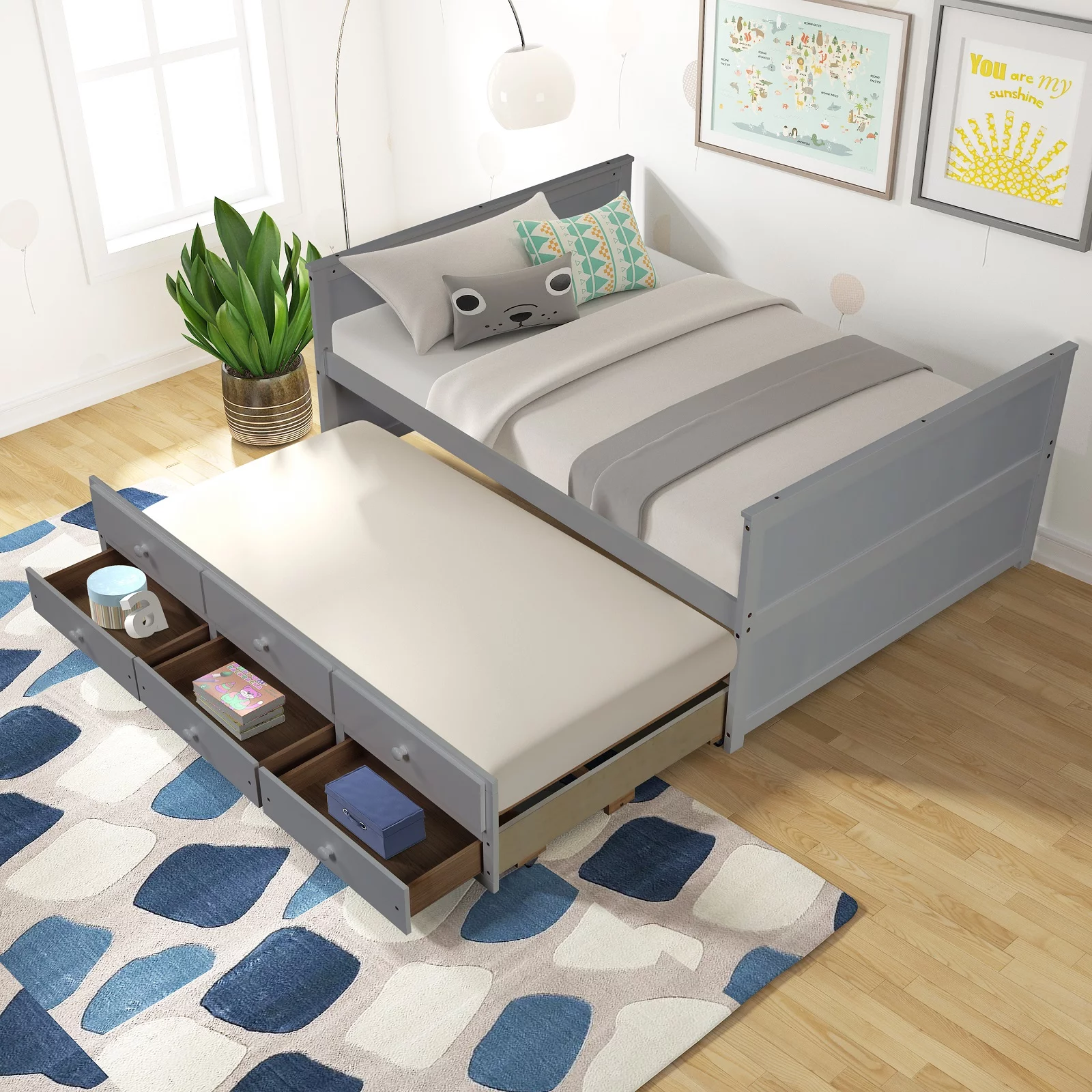 Wood Bed Captain's Bed Storage Full Daybed with Twin Size Trundle and Three Drawers Platform Bed Kids Bed