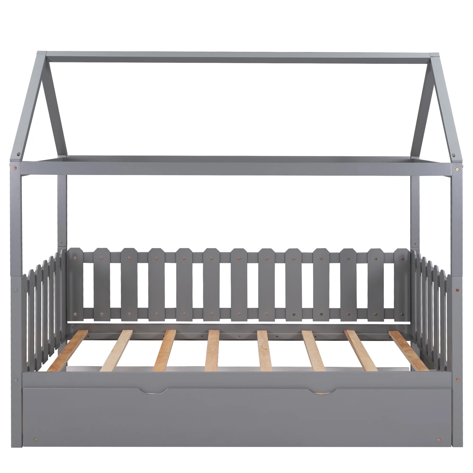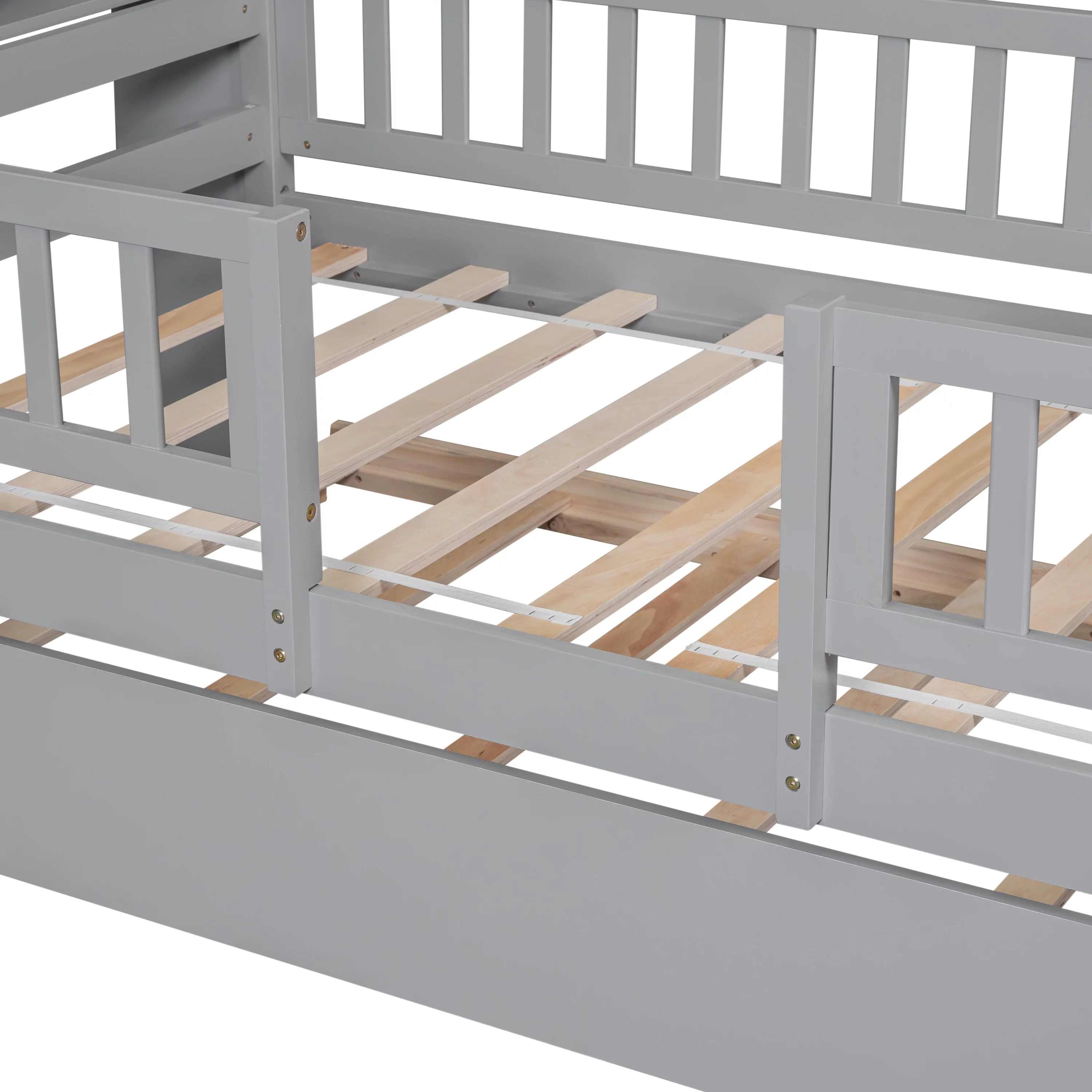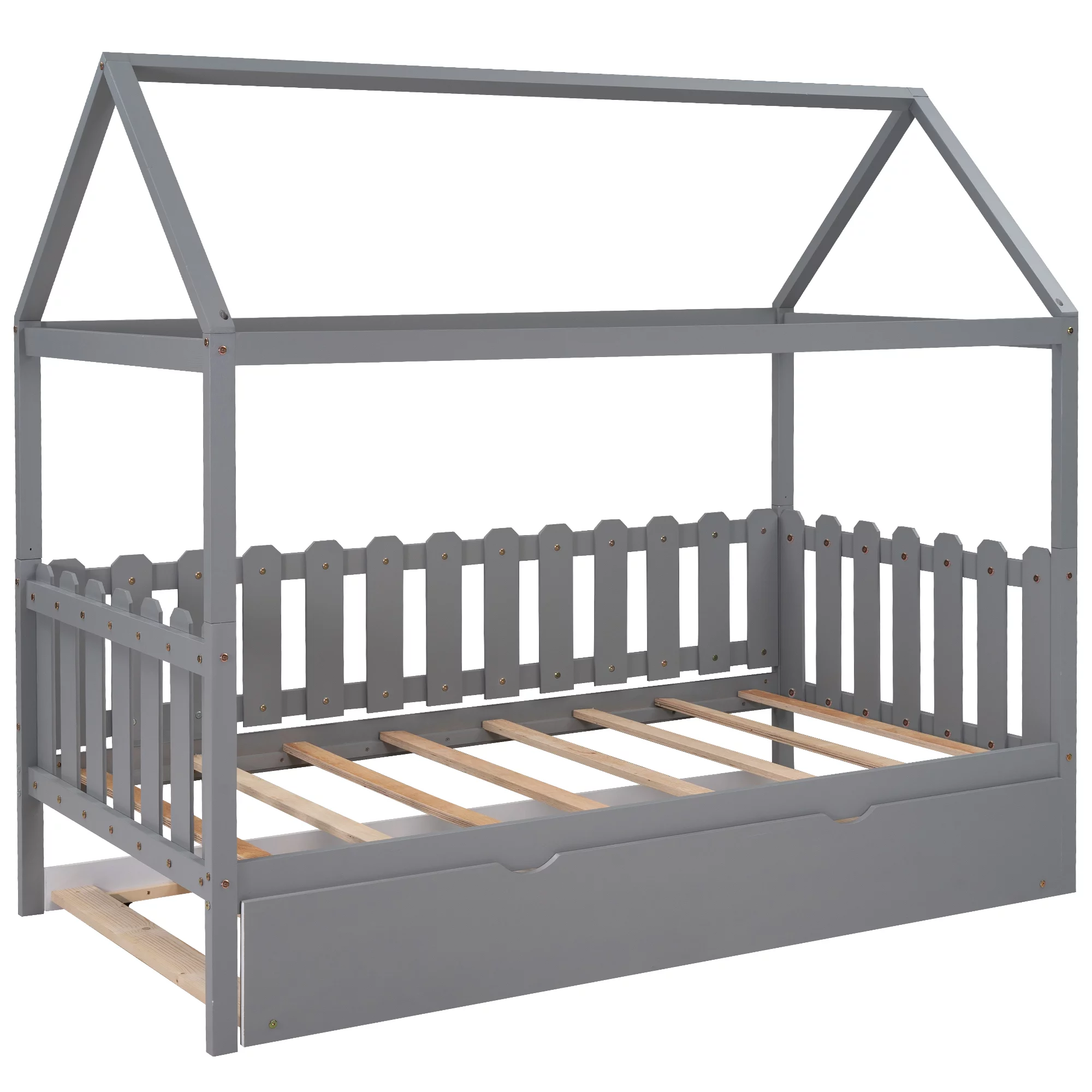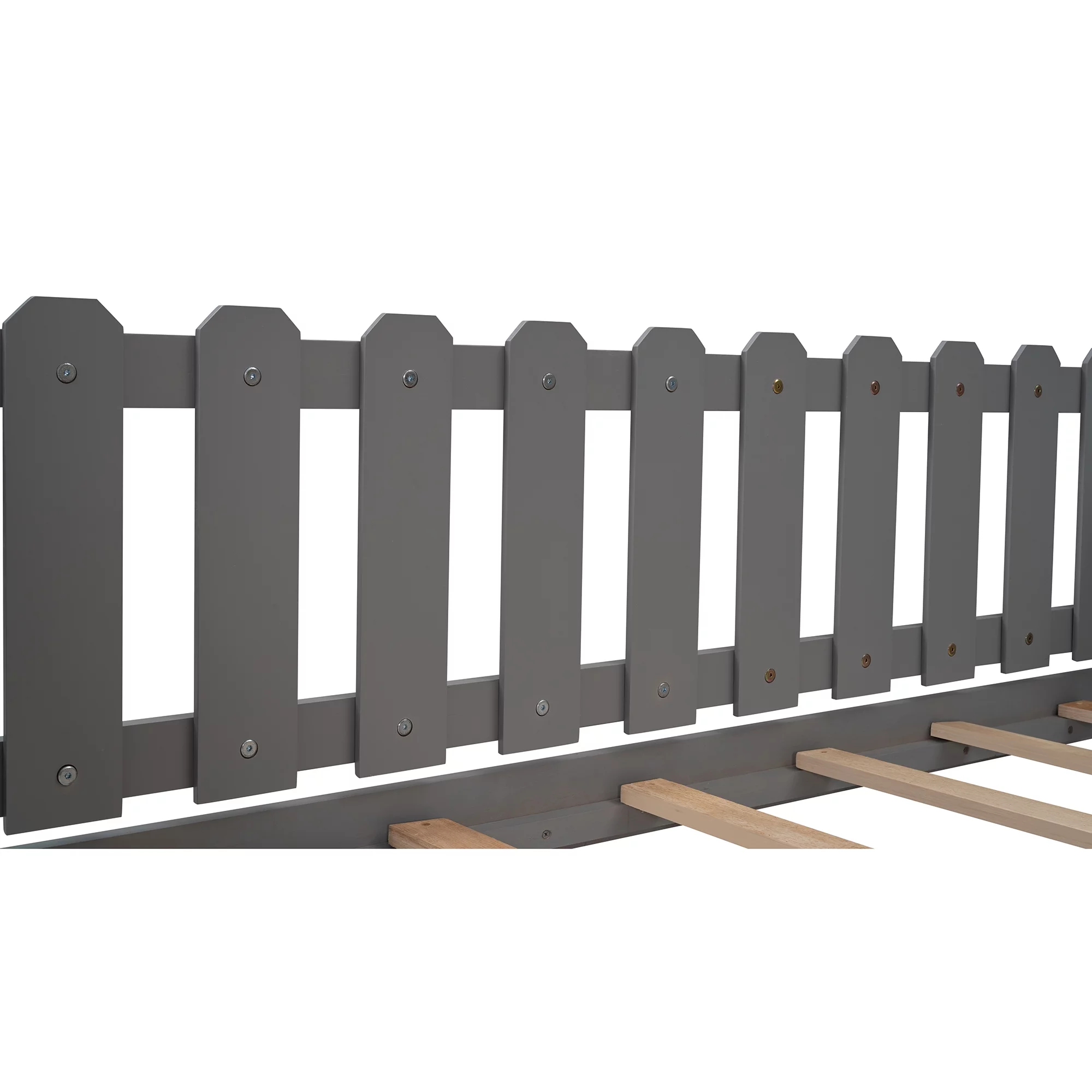Bed of drawers ,Twin Size House-Shaped Headboard with Fence Guardrails and Trundle ,Grey