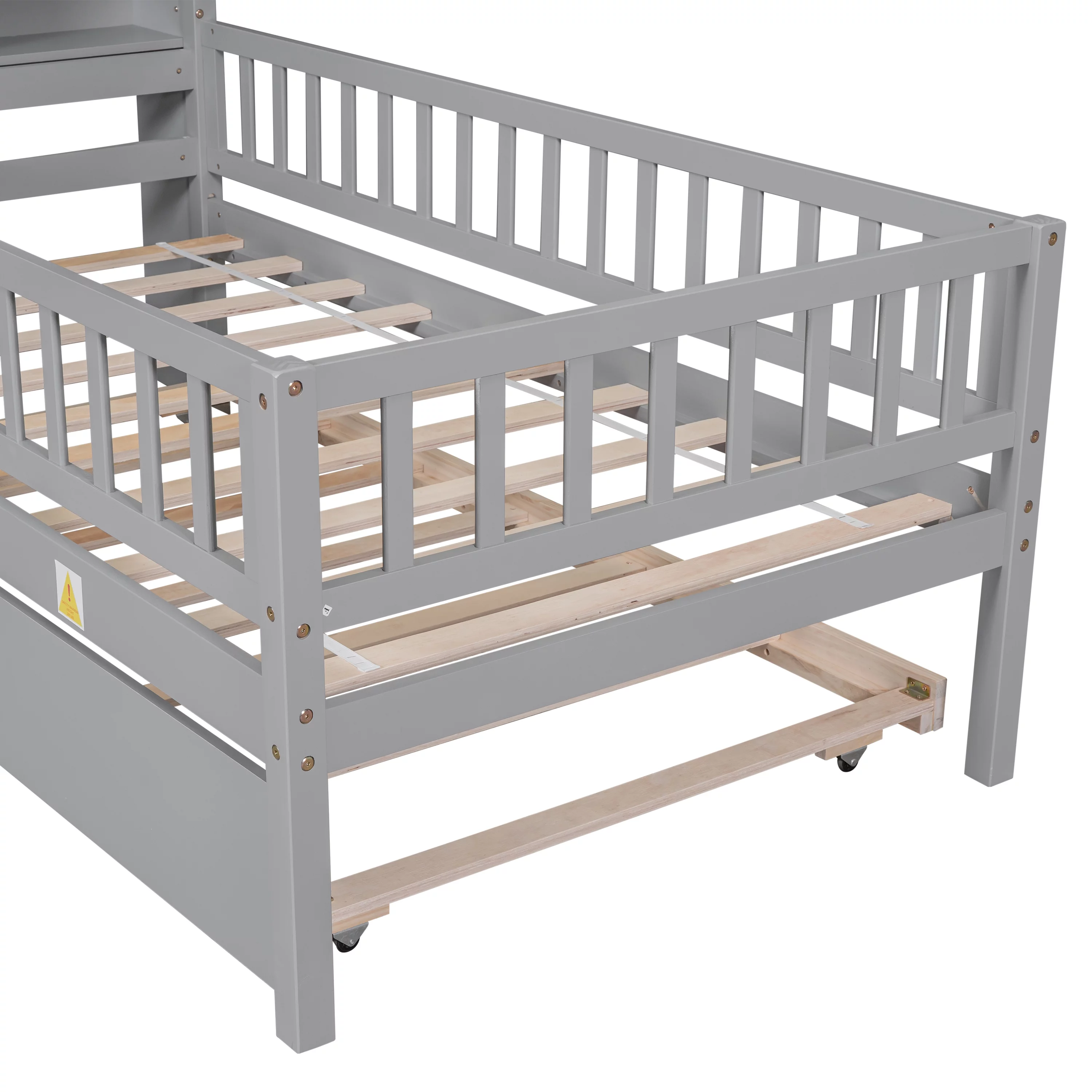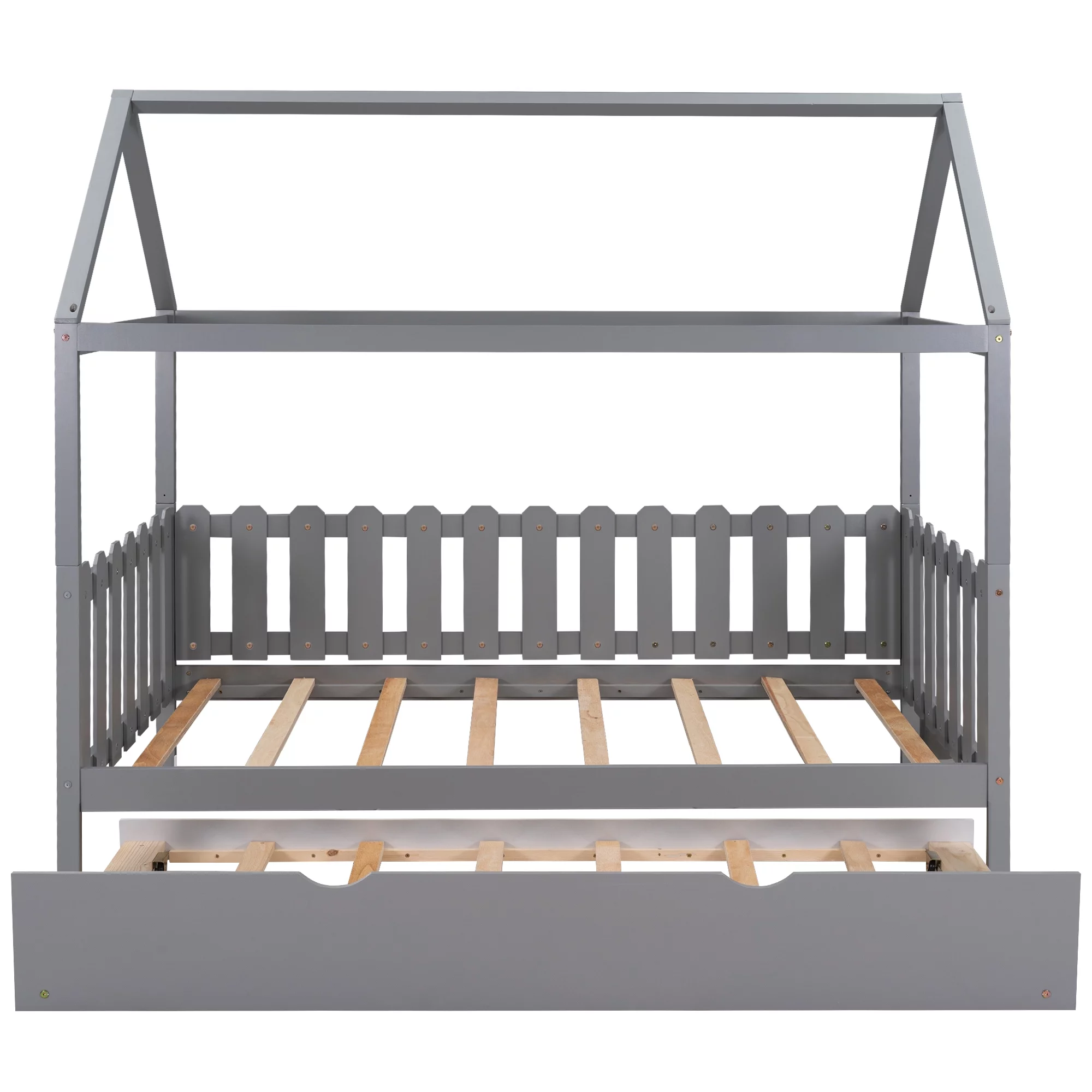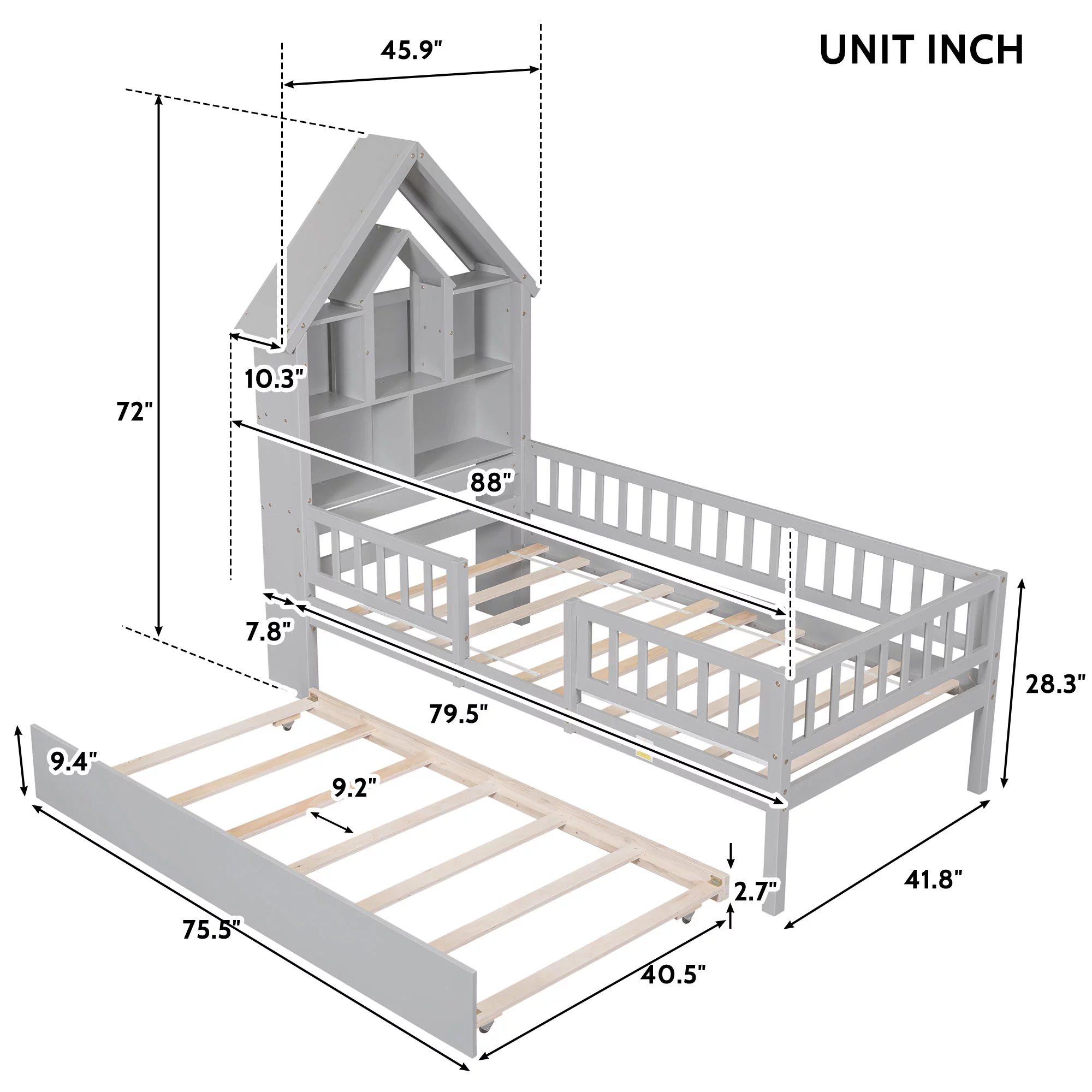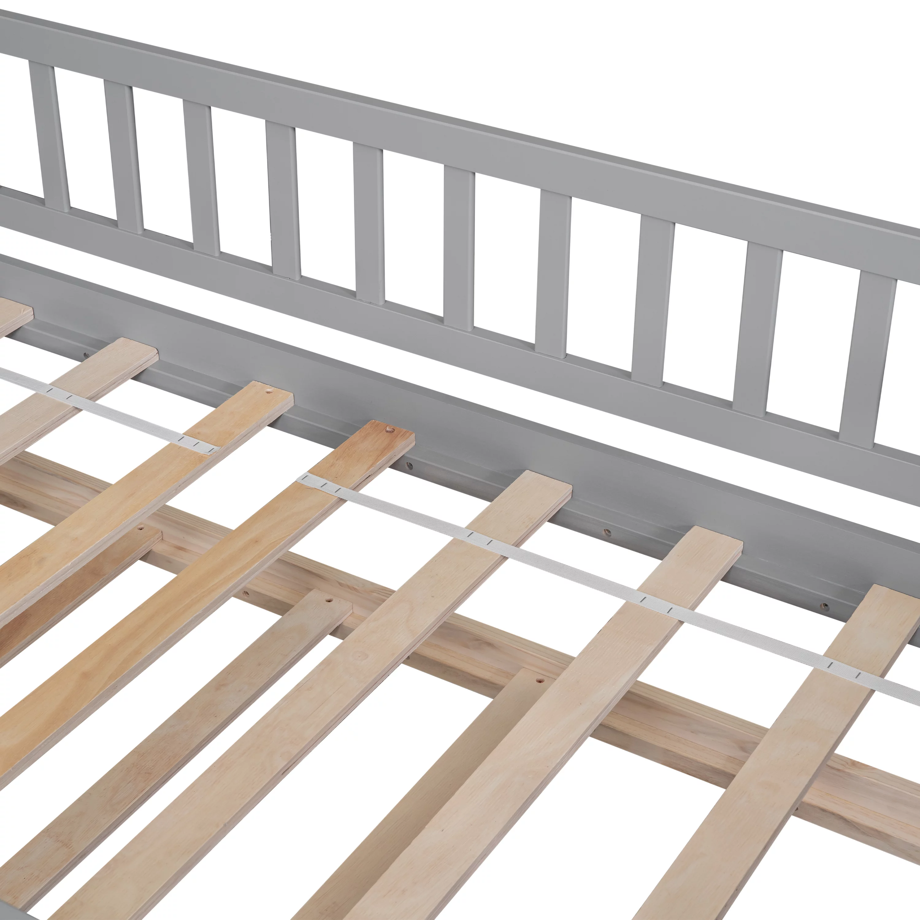 Bed of drawers ,Twin Size House-Shaped Headboard with Fence Guardrails and Trundle ,Grey