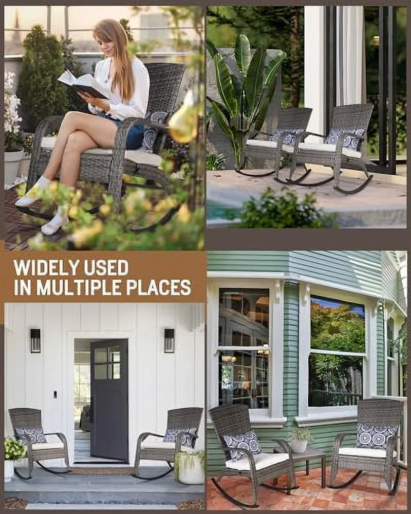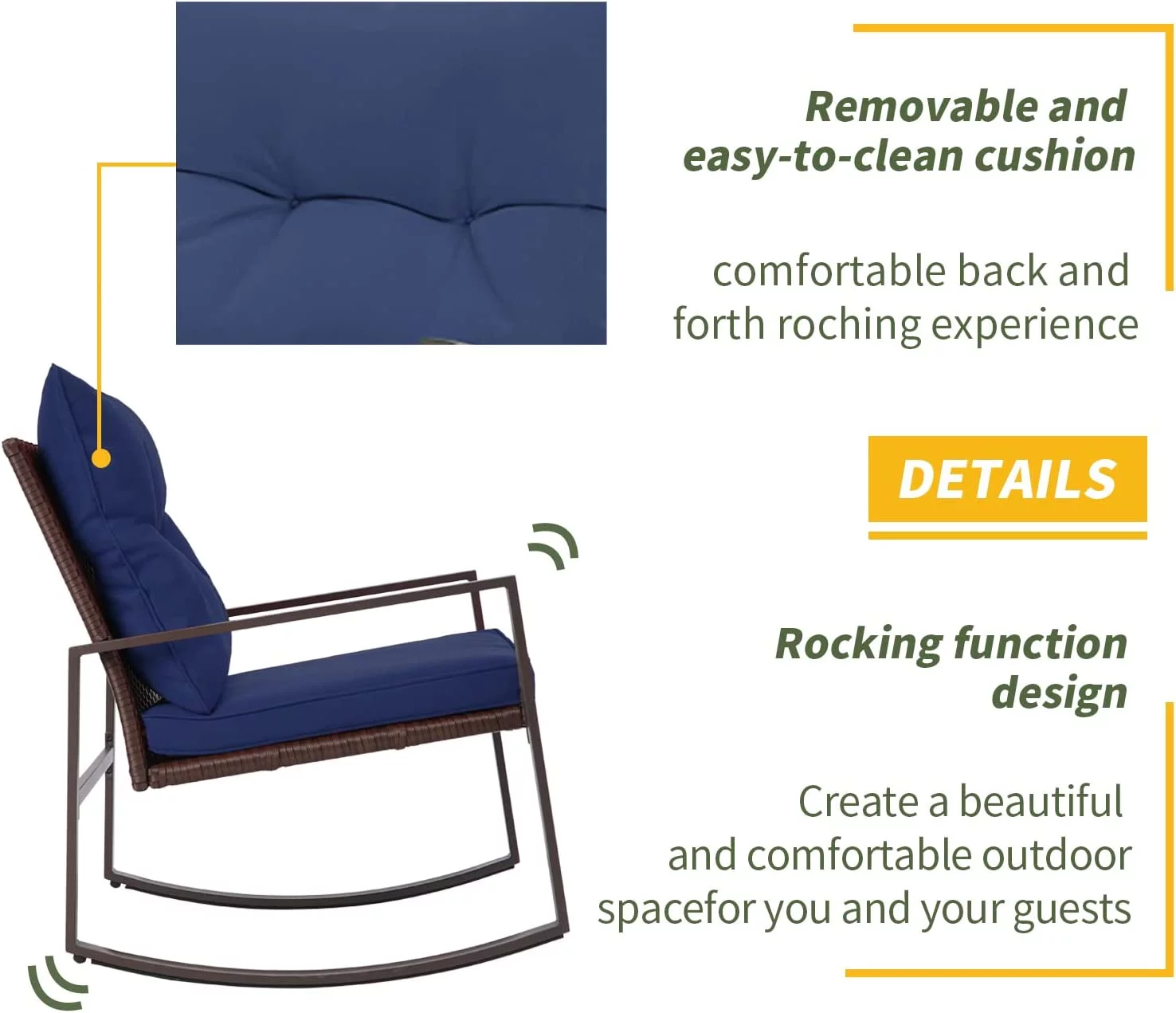 3 Piece Outdoor Rocking Bistro Set Brown Wicker Porch Chairs Conversation Sets with Glass Coffee Table Dark Grey