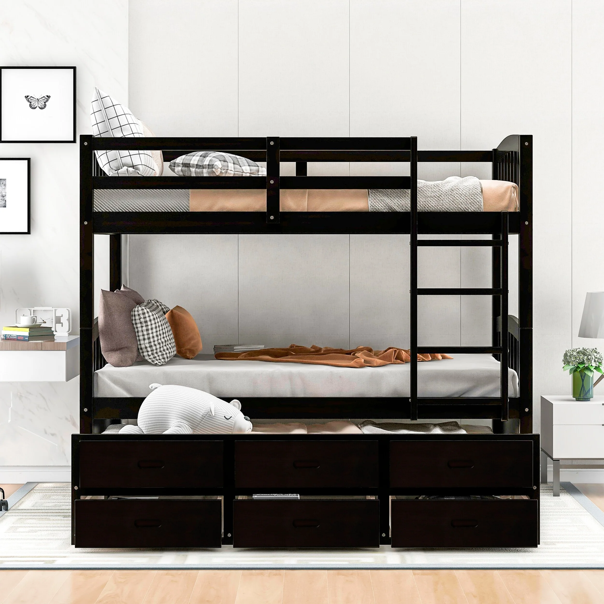 Home Adores Fille Twin over Twin Bunk Bed with Trundle and Drawers Espresso Espresso Finish