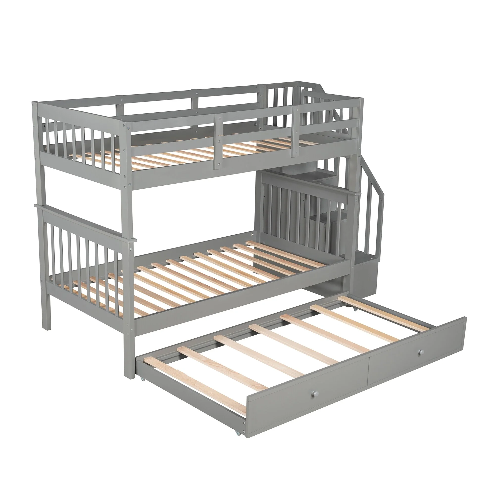 Twin over Twin/Full Bunk Bed with Twin Trundle, 3 Open Compartments and 4 Drawers Grey