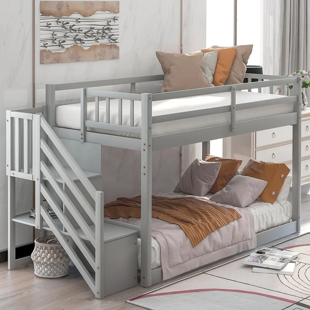 Stylish Wood Full Size Convertible Bunk Bed with Storage Staircase and Drawers Grey - Full