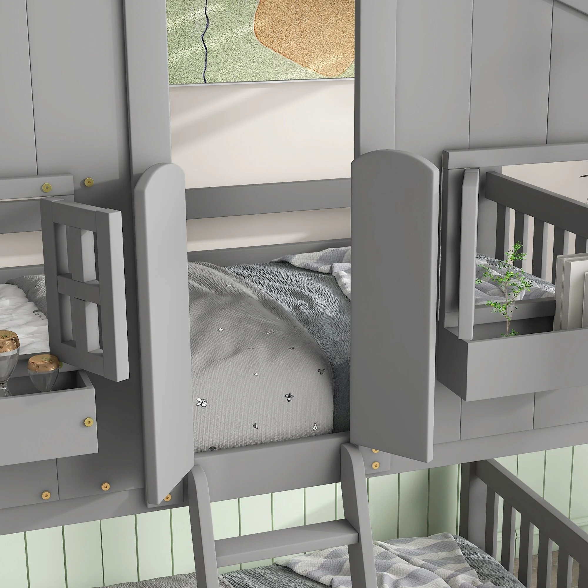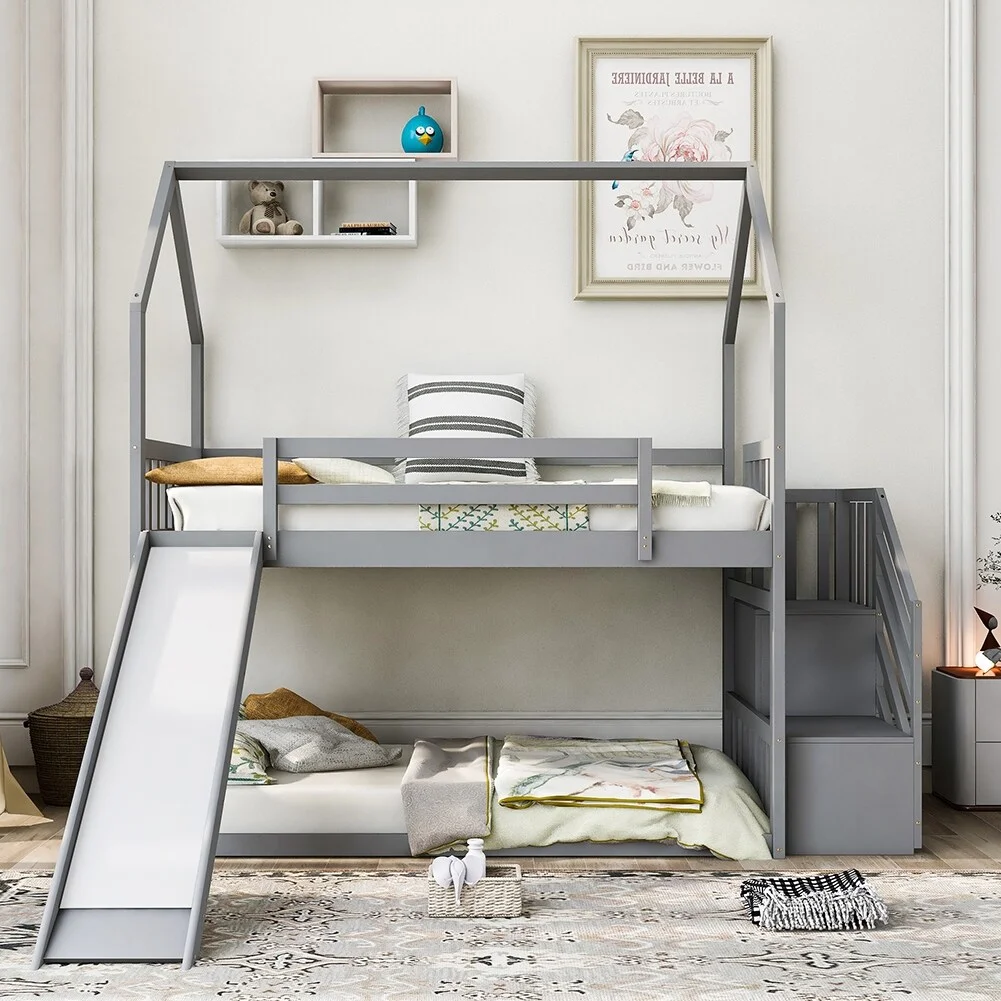 Pine Twin over Twin House Bunk Bed with Roof, Window, Window Box, Door, with Safety Guardrails and Ladder Gray