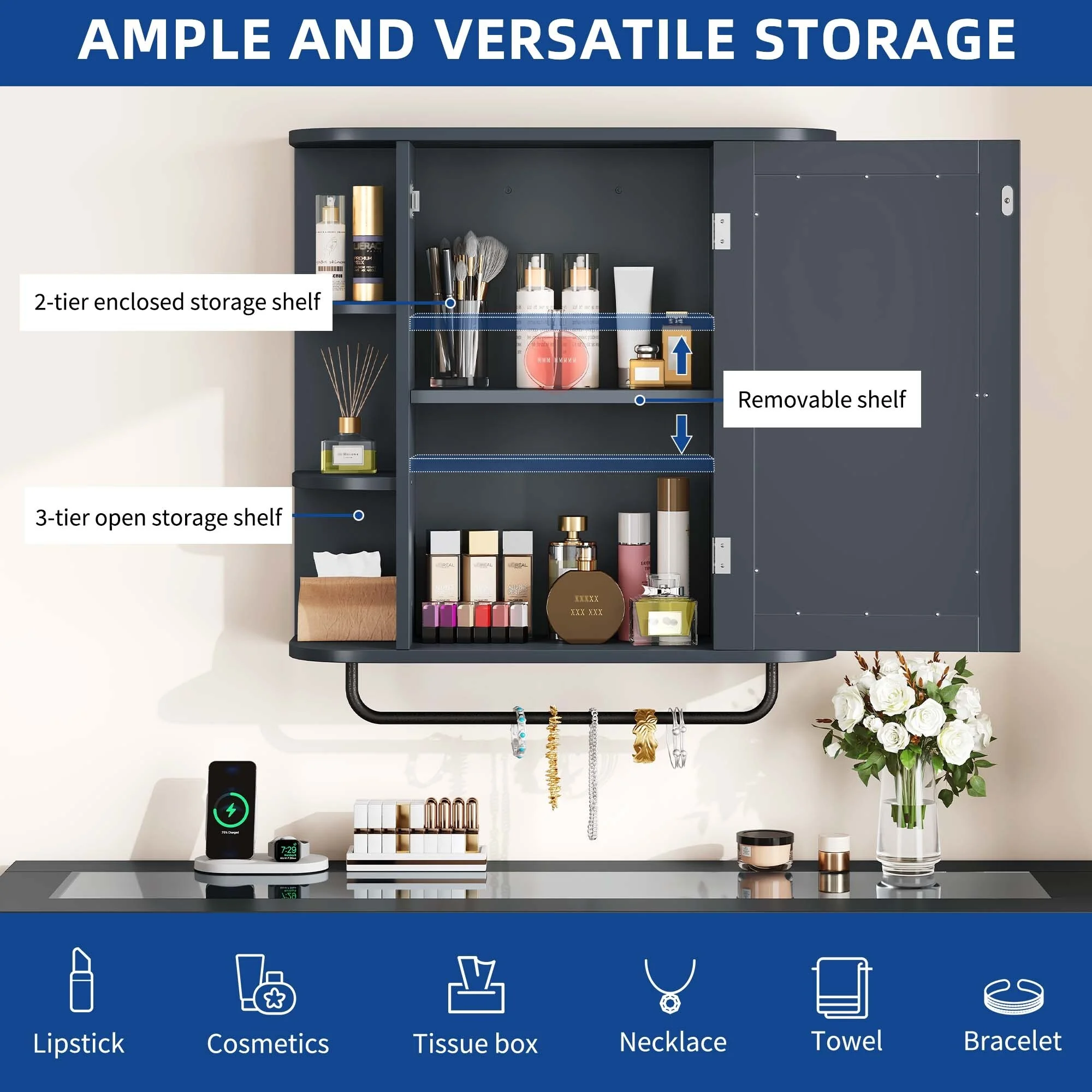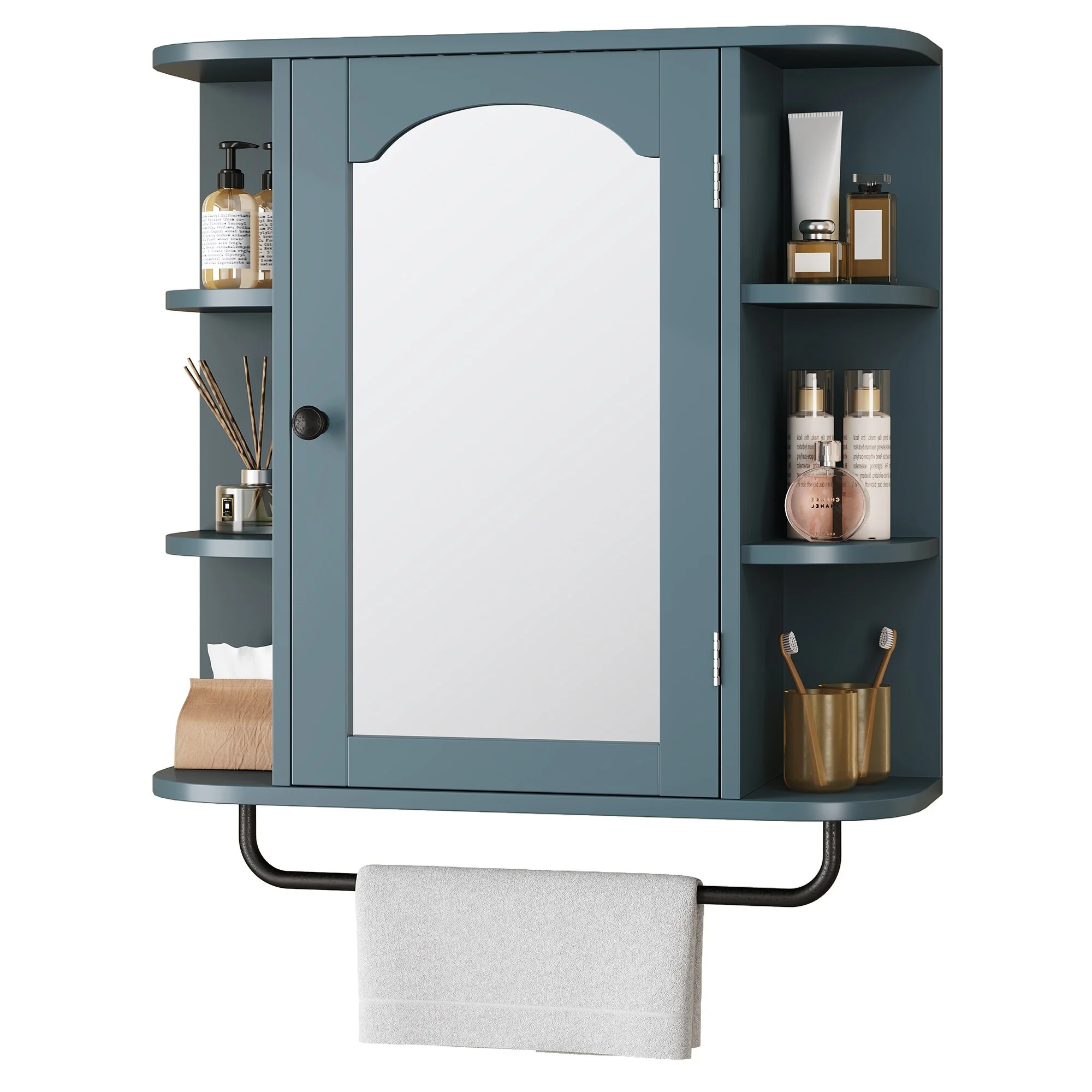 WedealFu Inc Modern Wall Bathroom Storage Medicine Cabinet with Adjustable Shelves and Towel Rack Blue