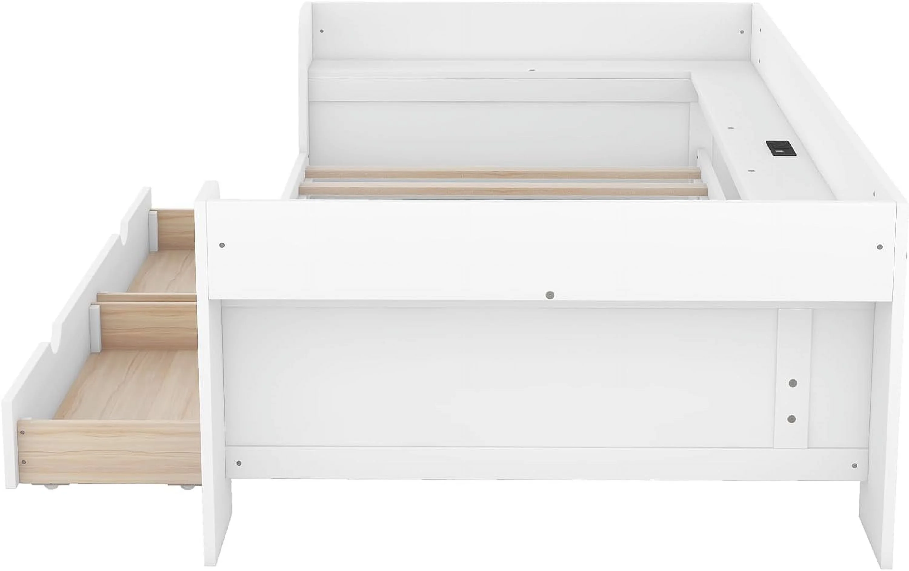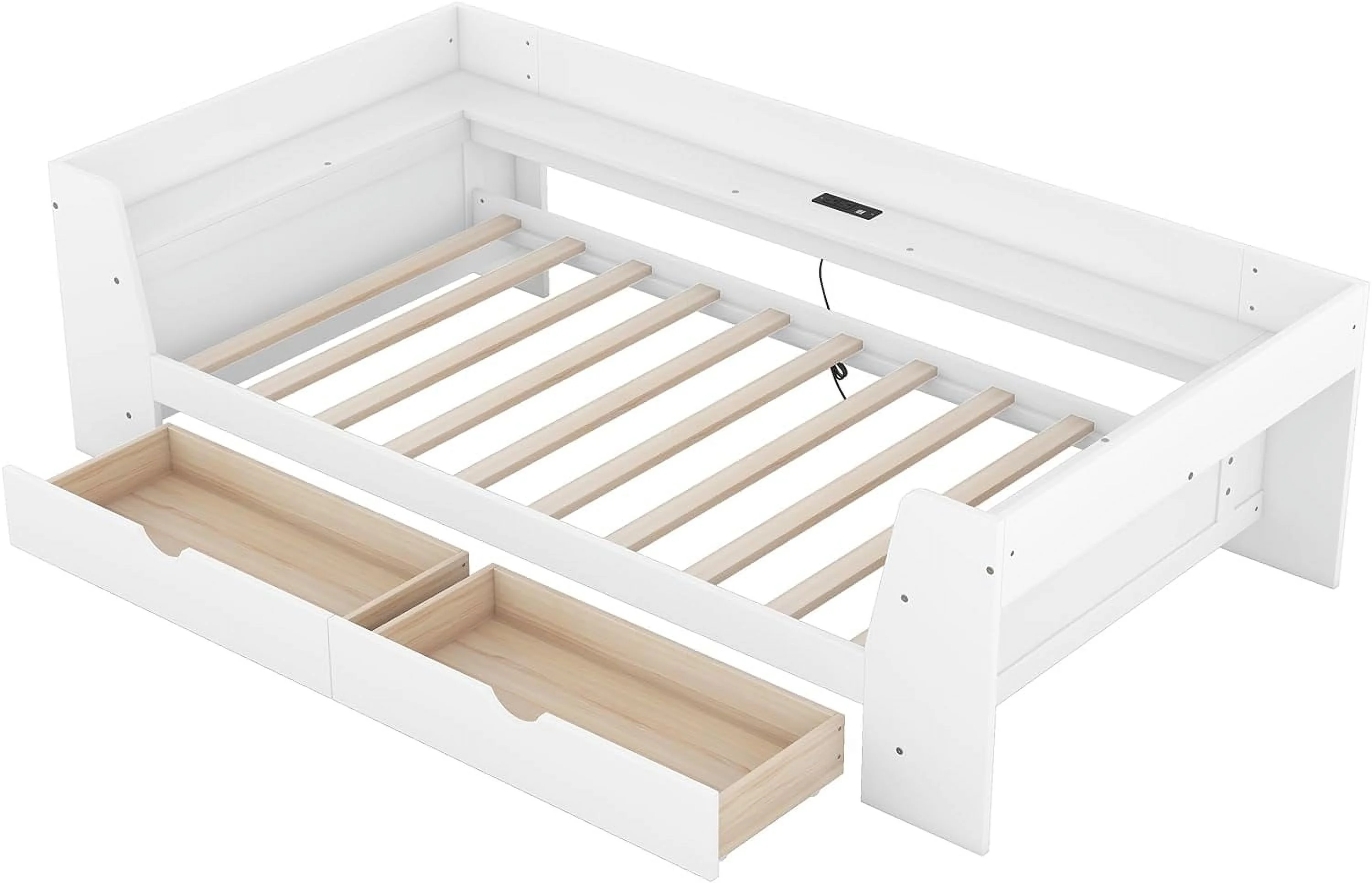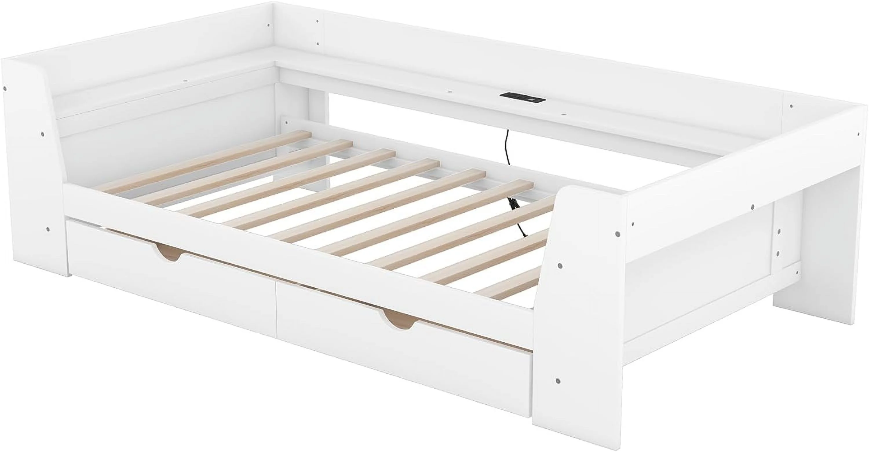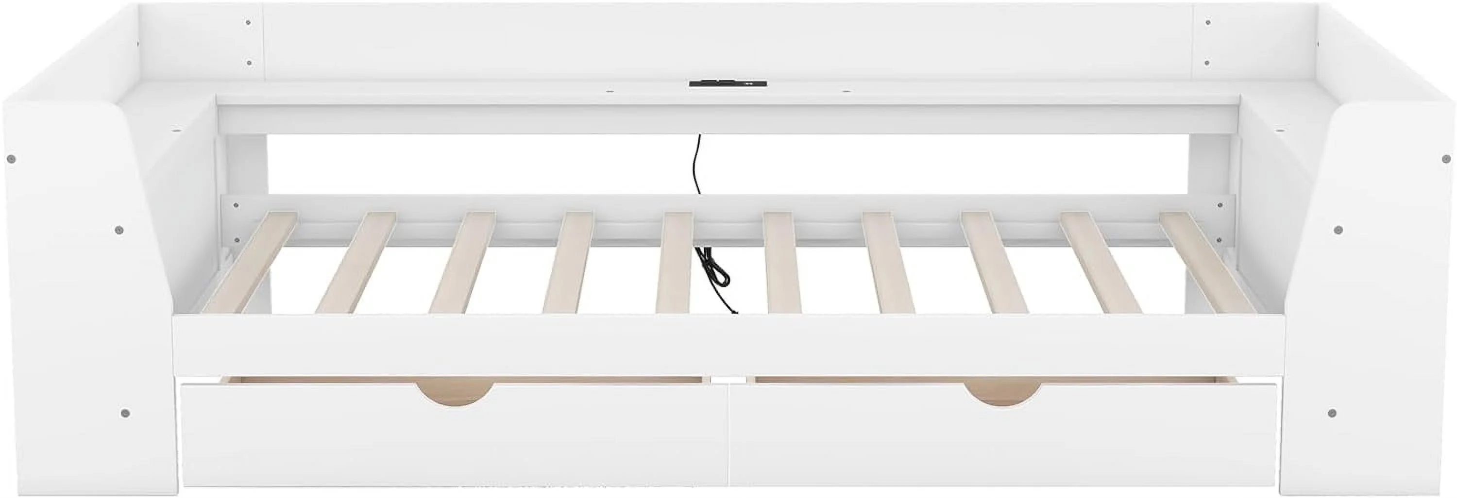 Day Beds Size, Daybed With 2 Storage Drawers And Shelves,Wooden Daybed With Built-In Charging Station,White