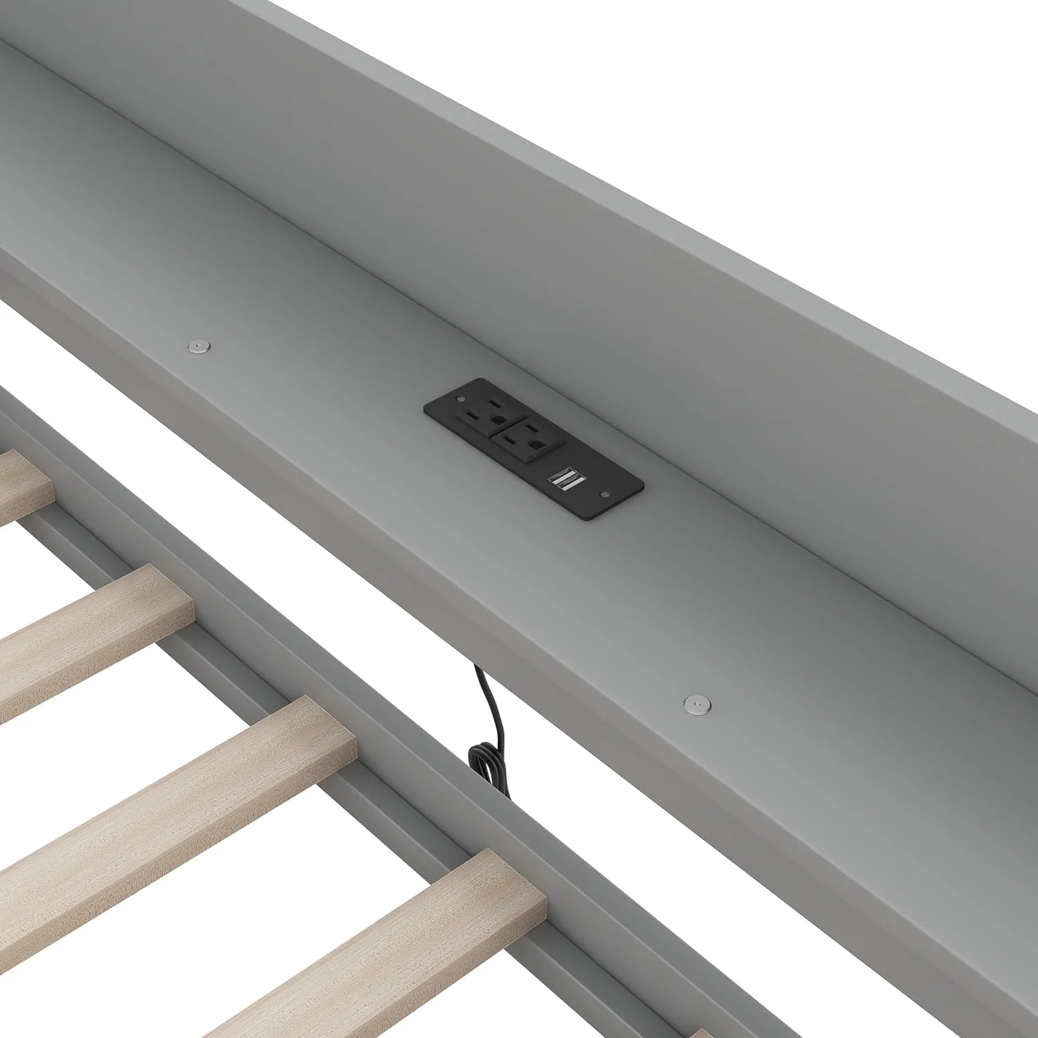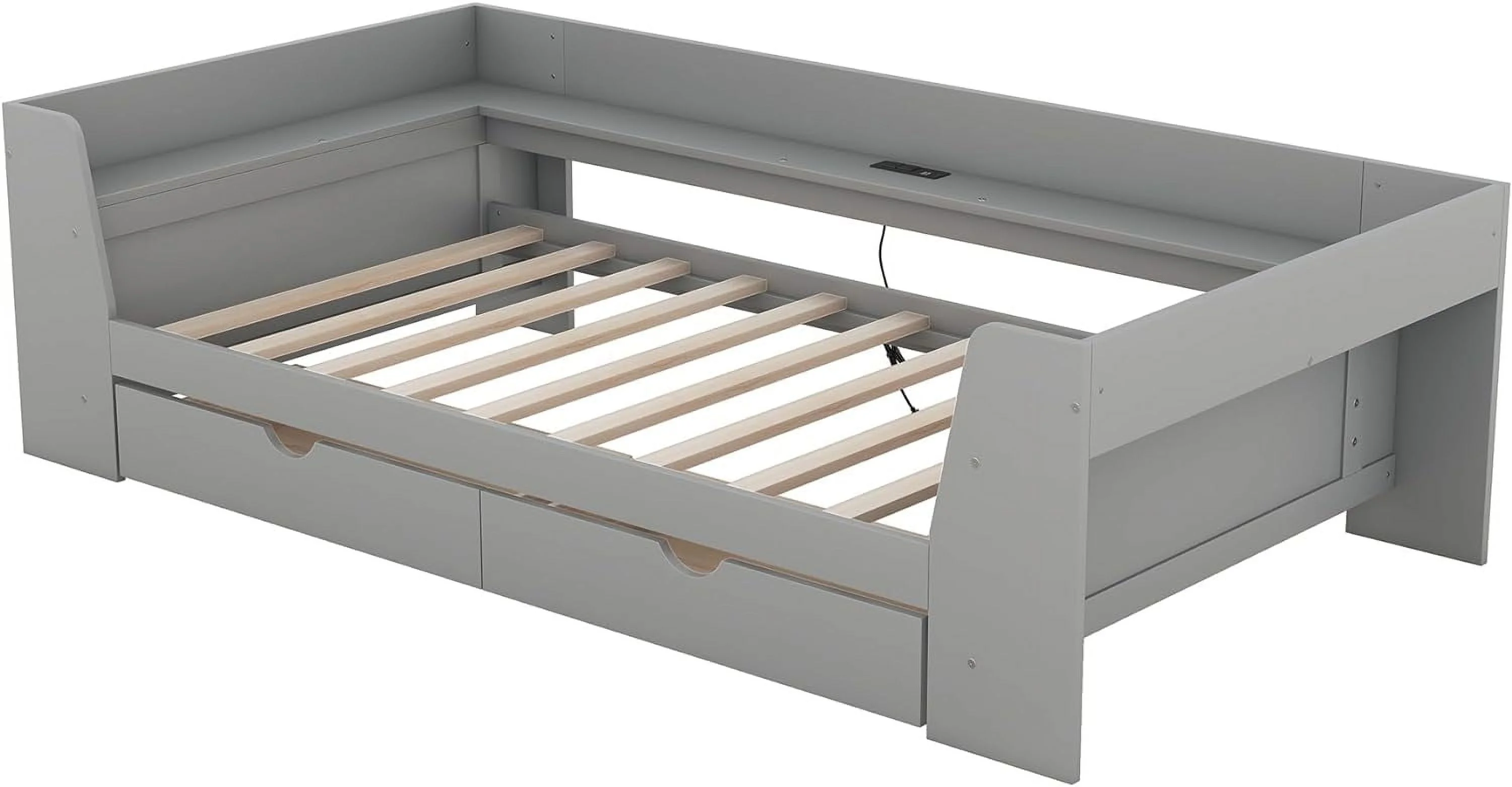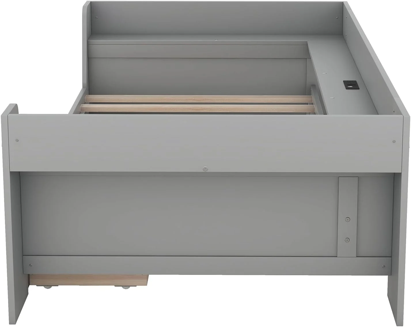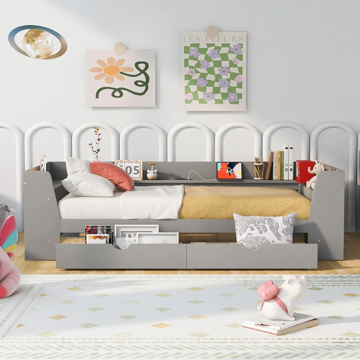 Size Daybed, Wood Daybed With Drawers, Shelves And Built-In Charging Station, Gray