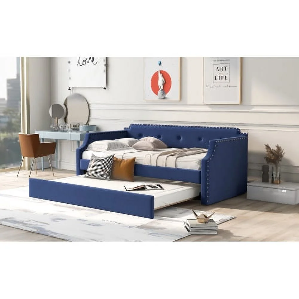 Buumin Upholstered Daybed with Trundle, Wood Slat Support,Upholstered Frame Sofa Bed , Twin,Blue