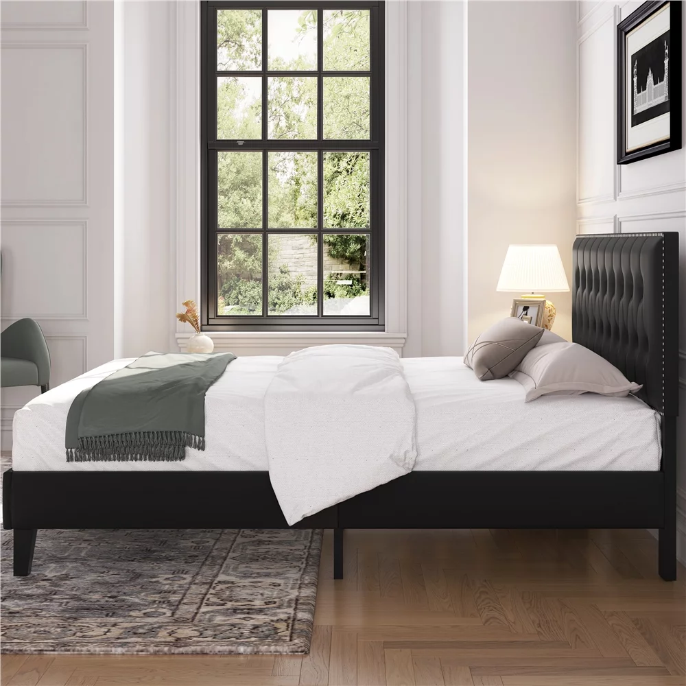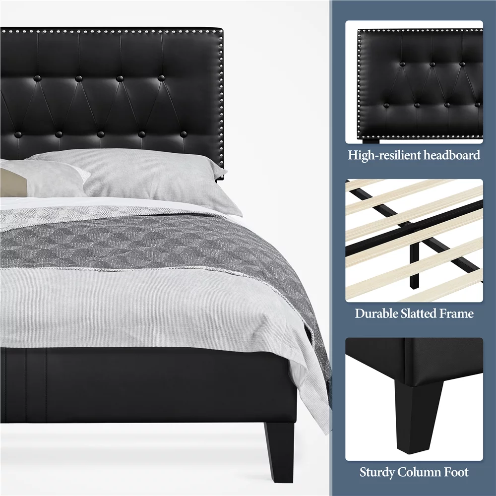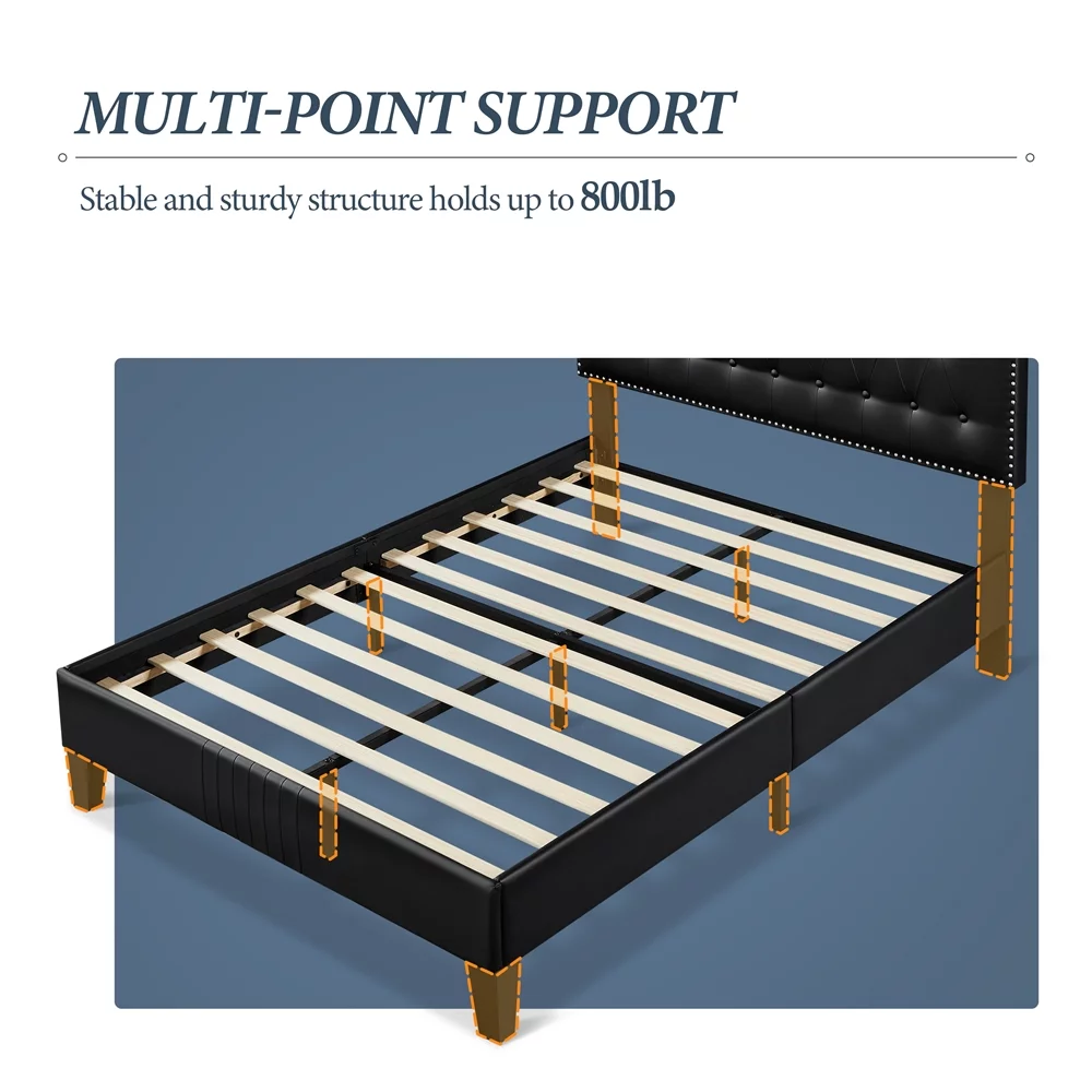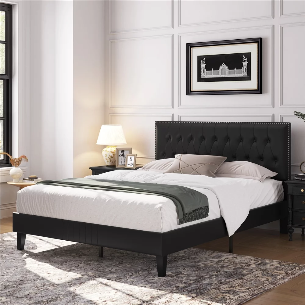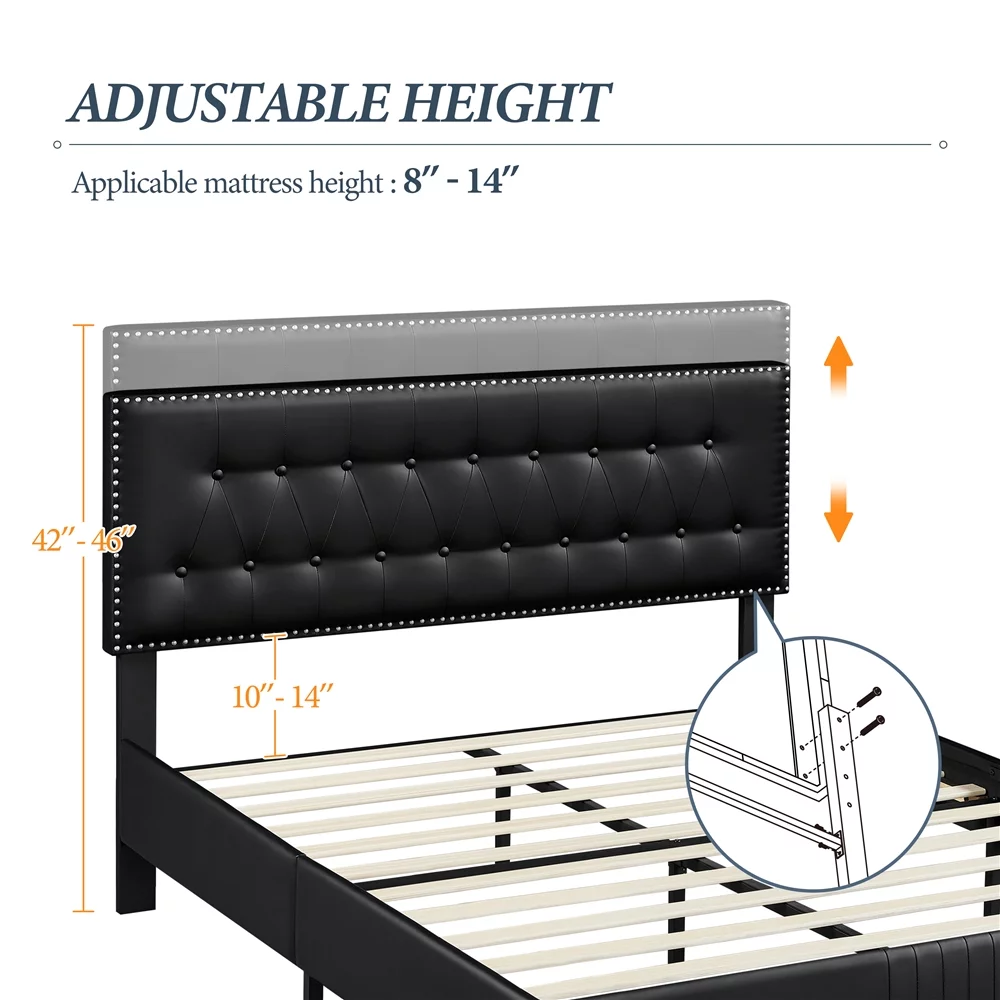 Yaheetech Upholstered Bed Frame with Adjustable Headboard, Queen Size, Black