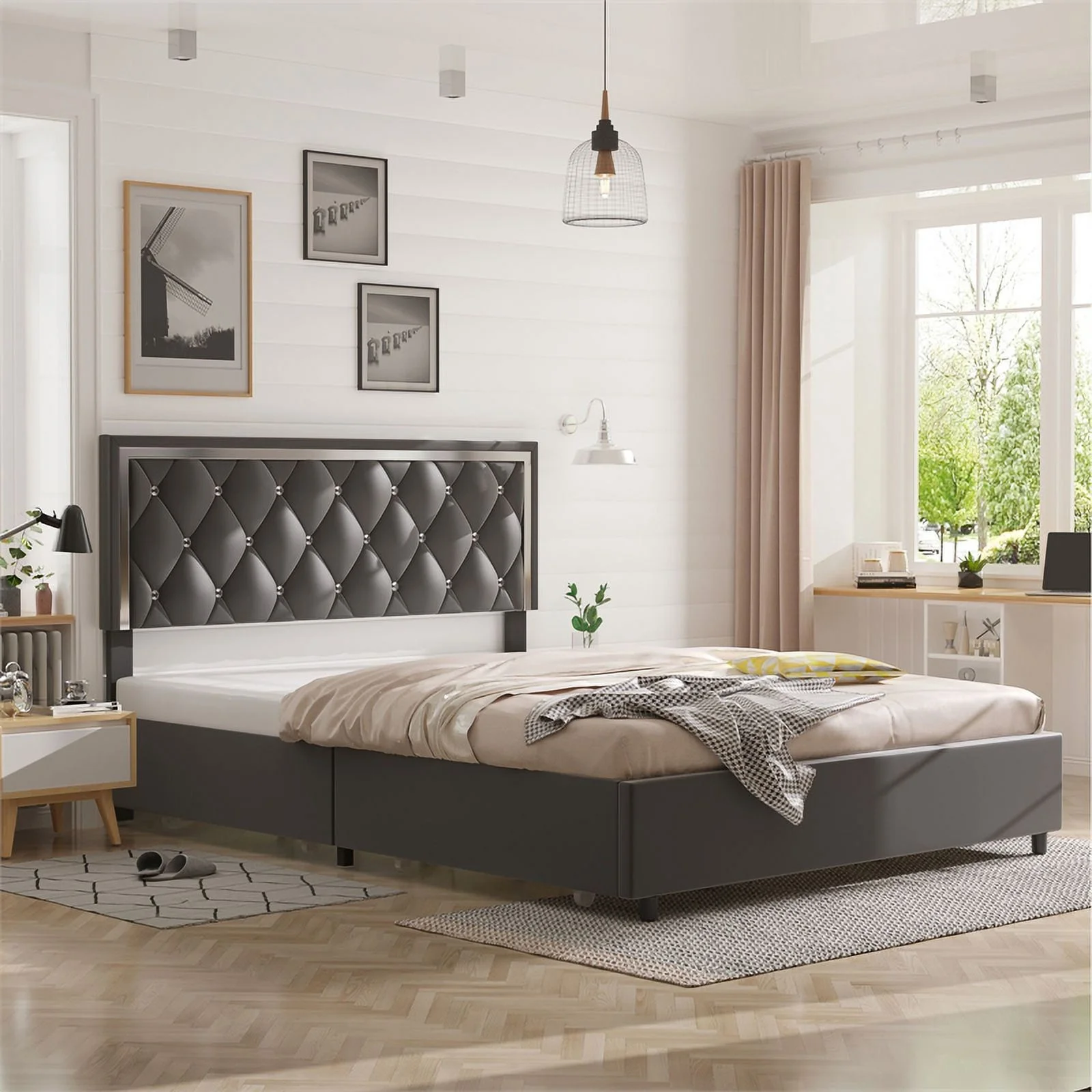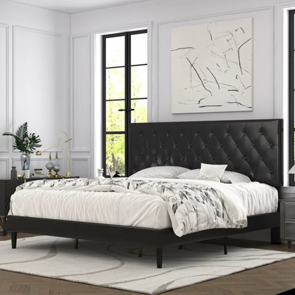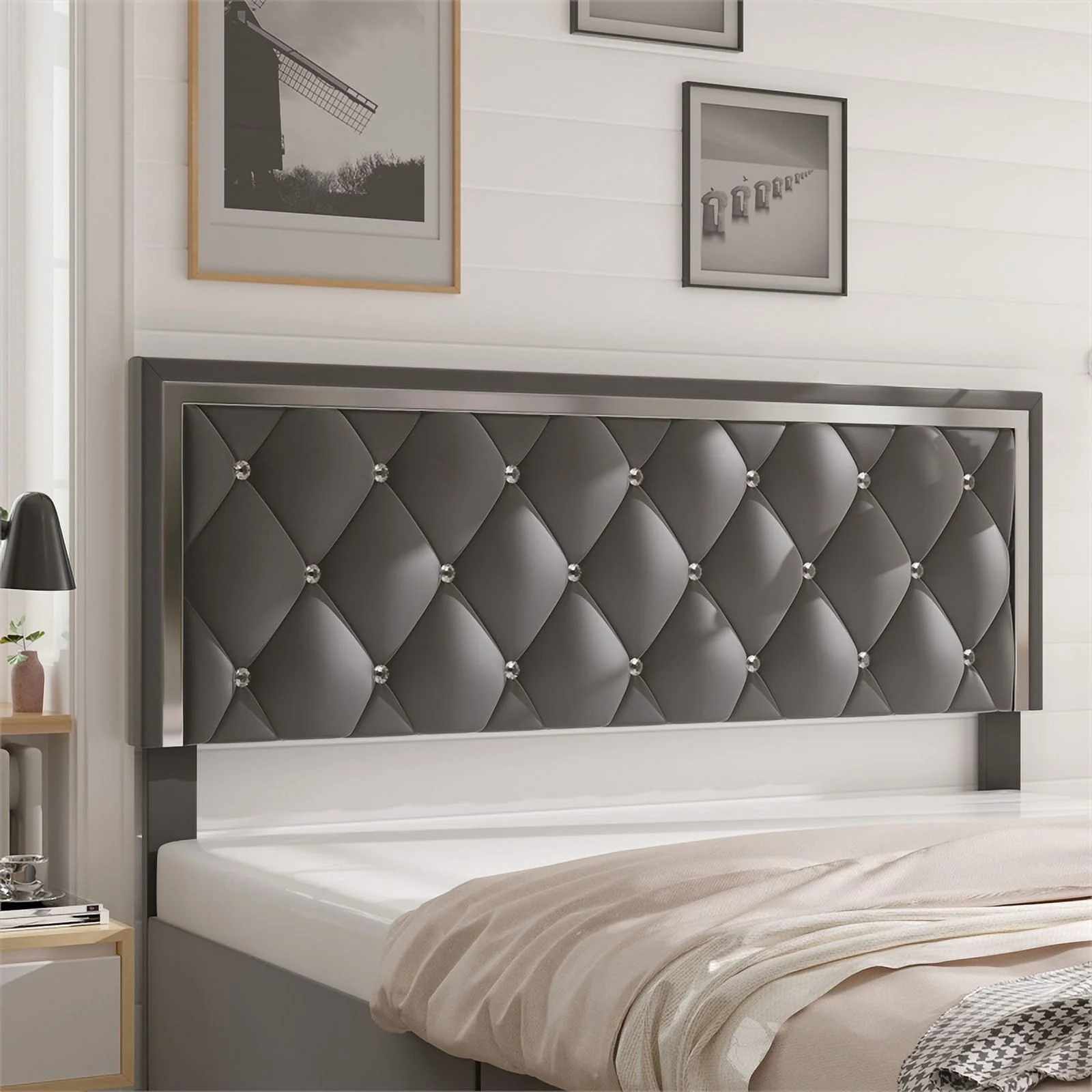 Benjara Mars King Size Platform Bed, Tufted Fabric Upholstered Headboard, Gray