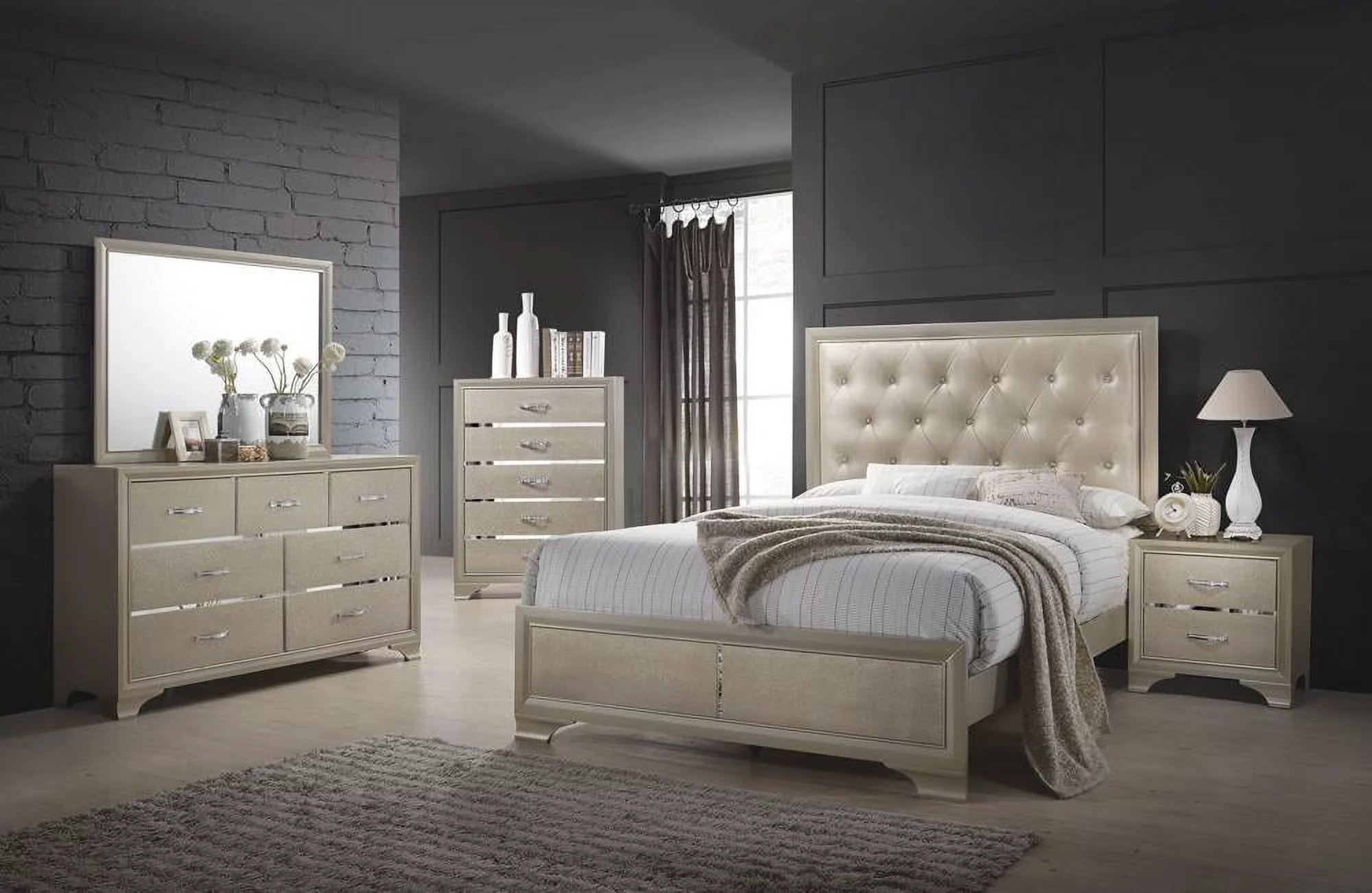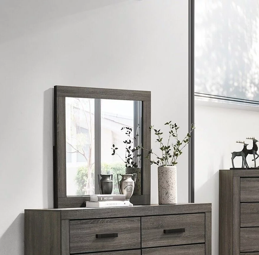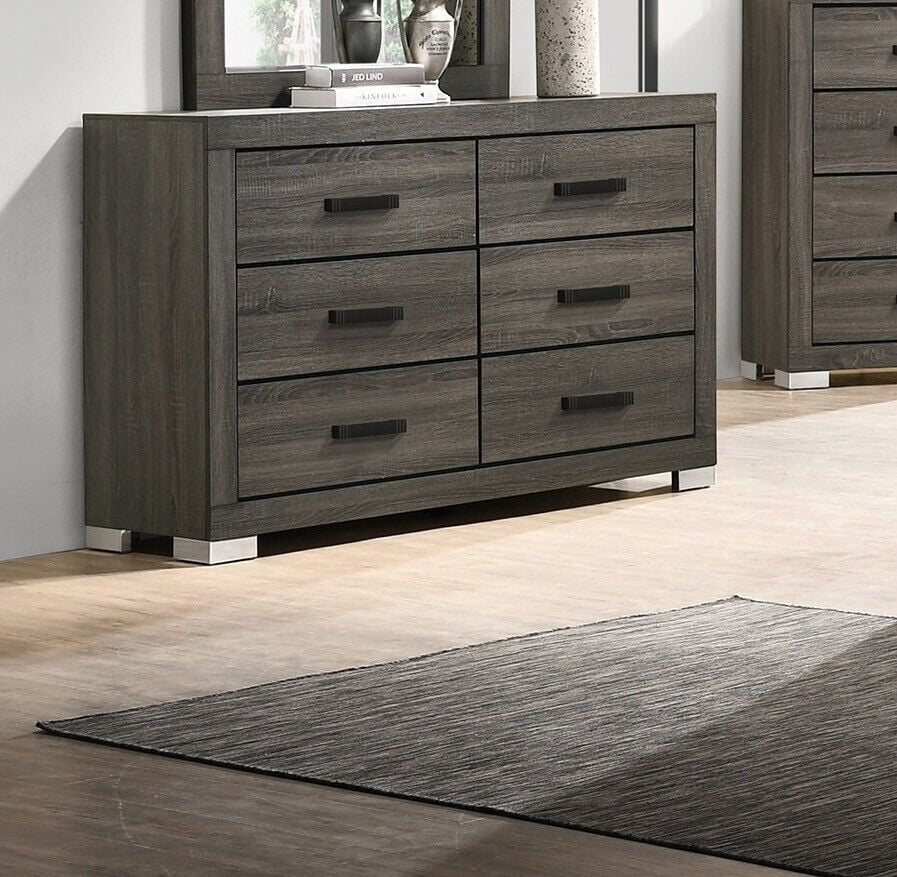 Queen Size Bed Dresser Mirror Chest 2x Nightstands 6pc Bedroom Wooden Furniture Transitional Contemporary Lines Design HB