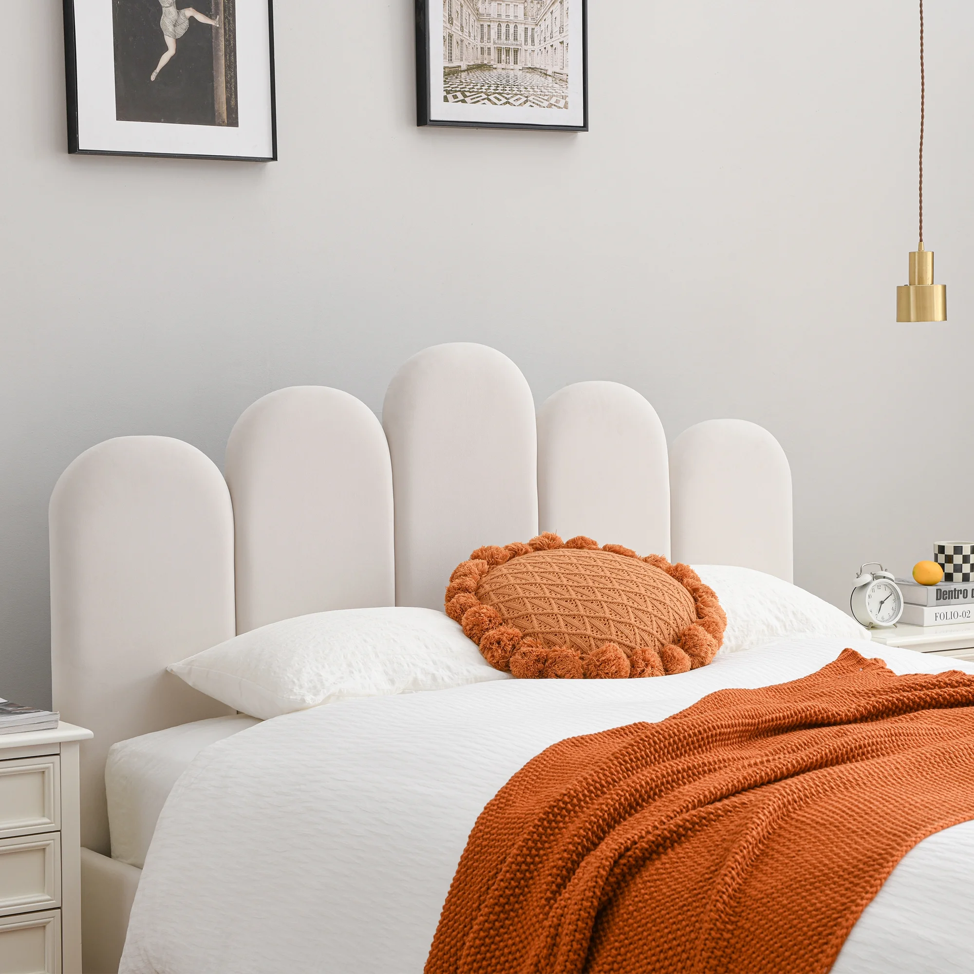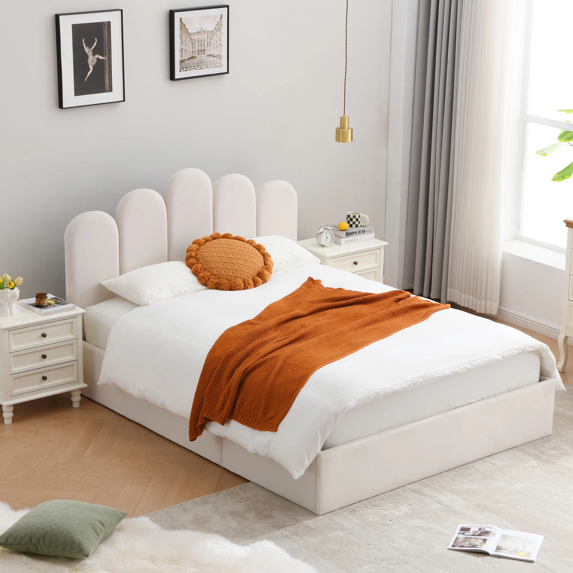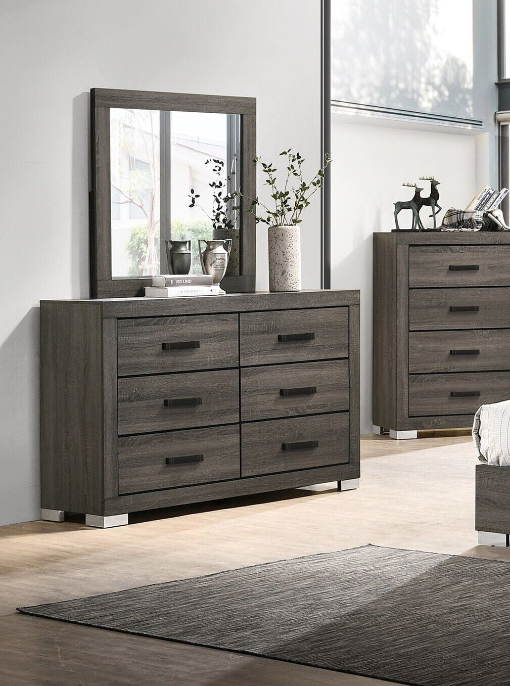 Queen Size Bed Dresser Mirror Chest 2x Nightstands 6pc Bedroom Wooden Furniture Transitional Contemporary Lines Design HB