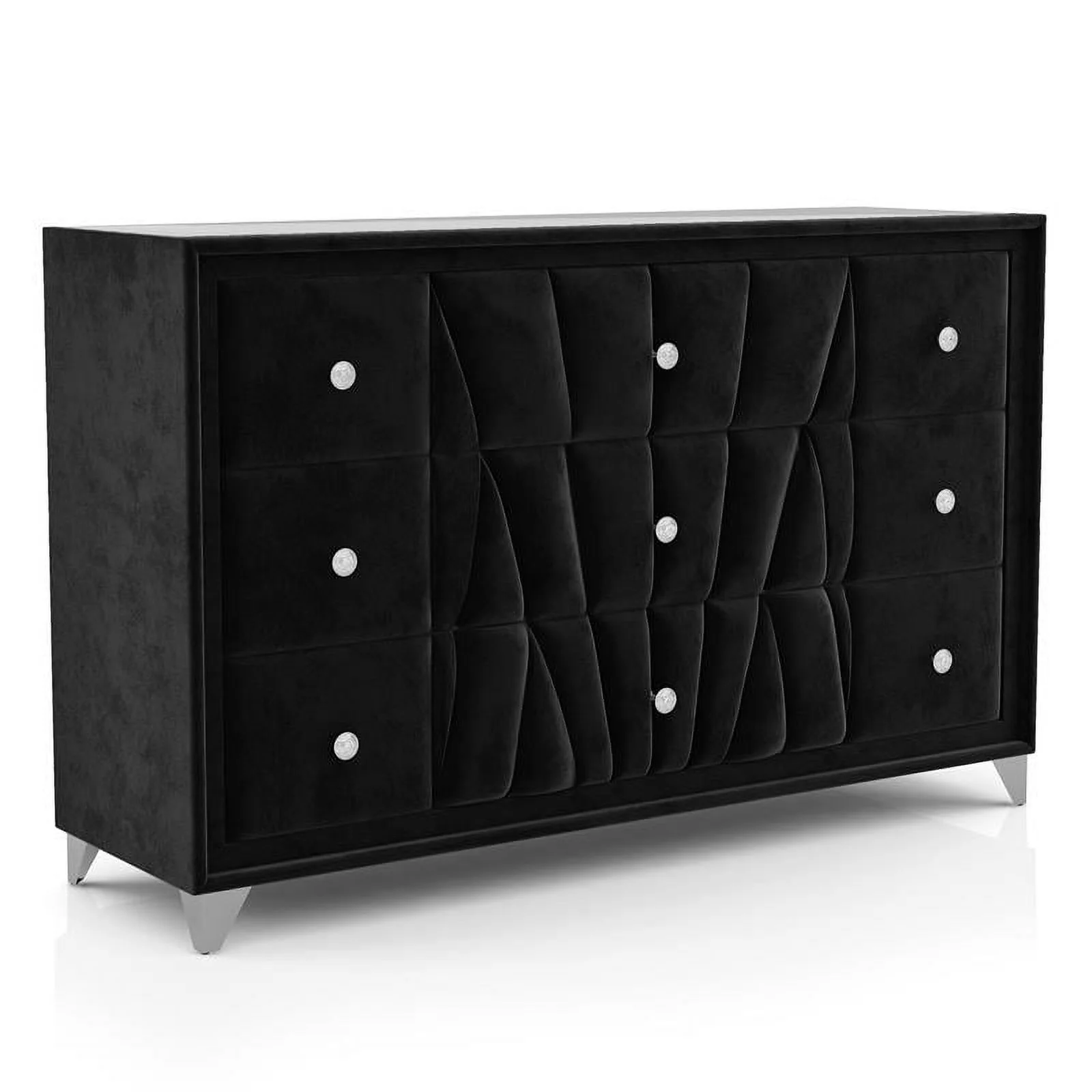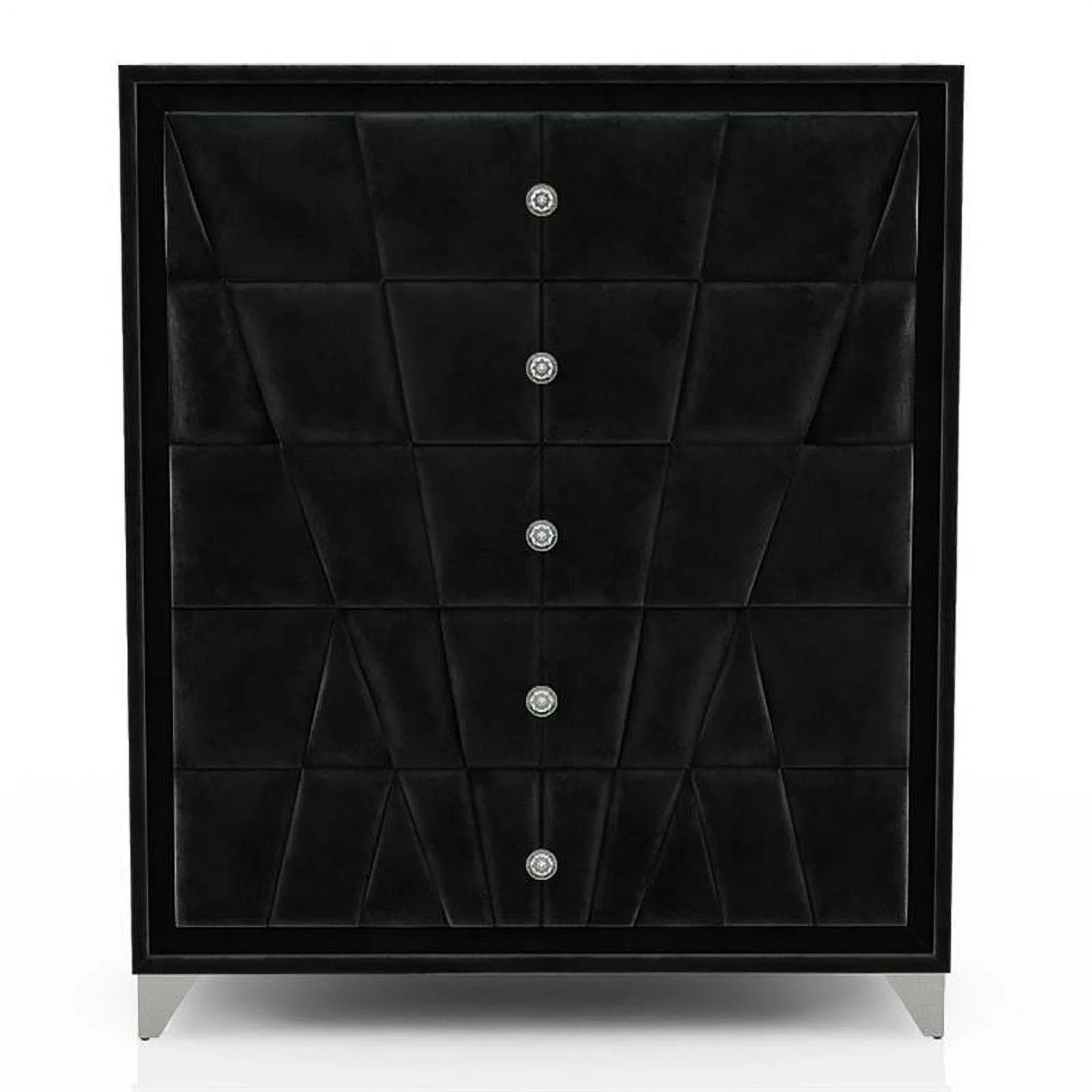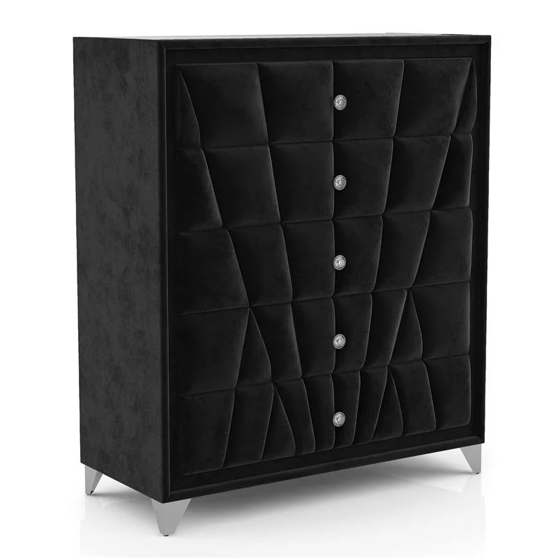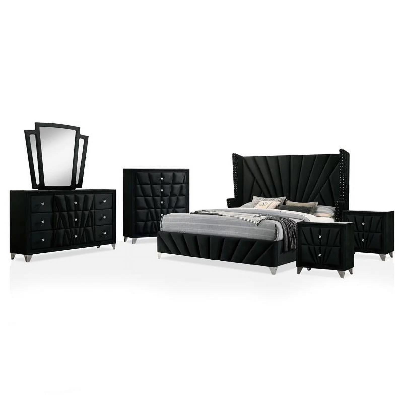 FOA Sakan 6pc Black Fabric Bed Set-Queen+2 Nightstands+Chest+Dresser+Mirror