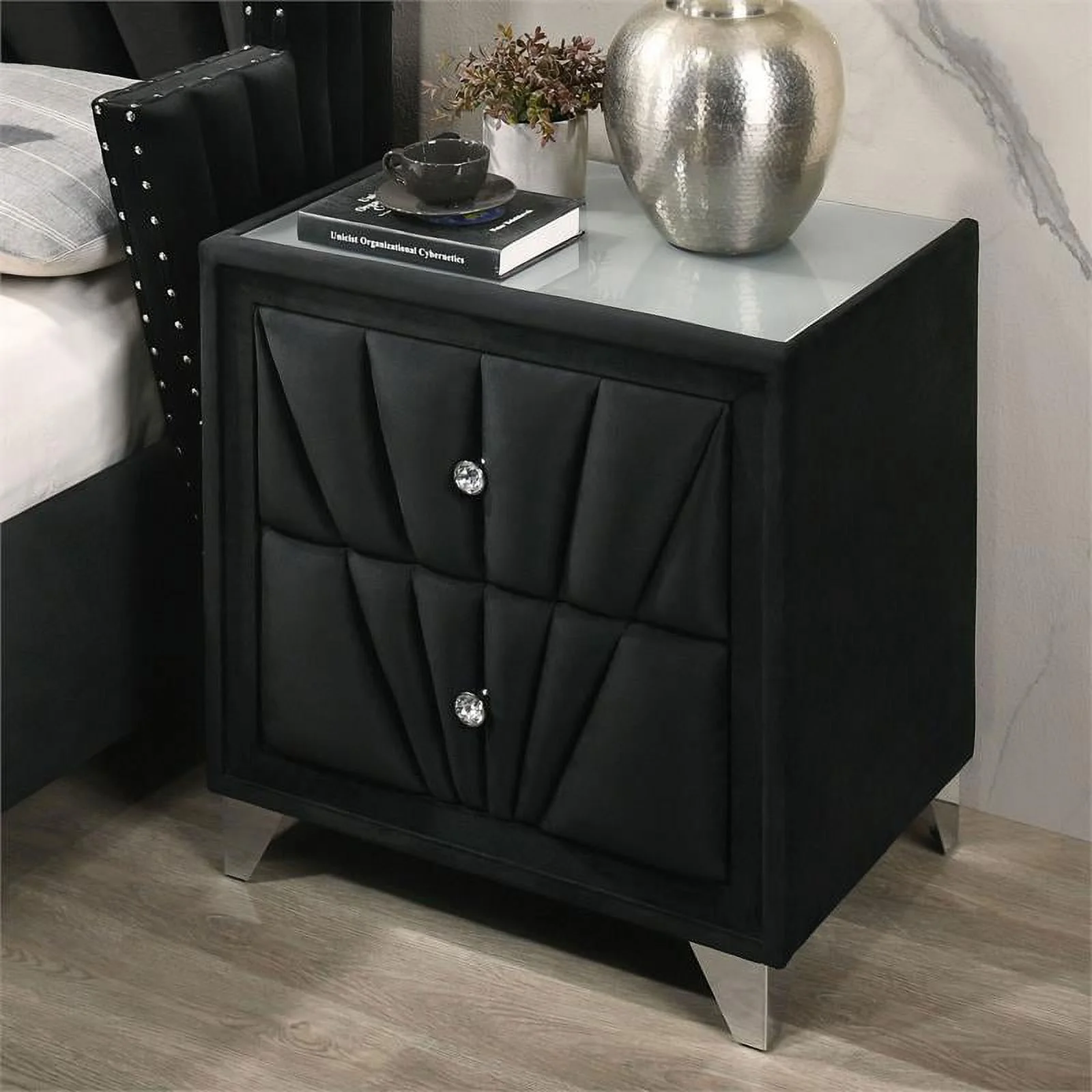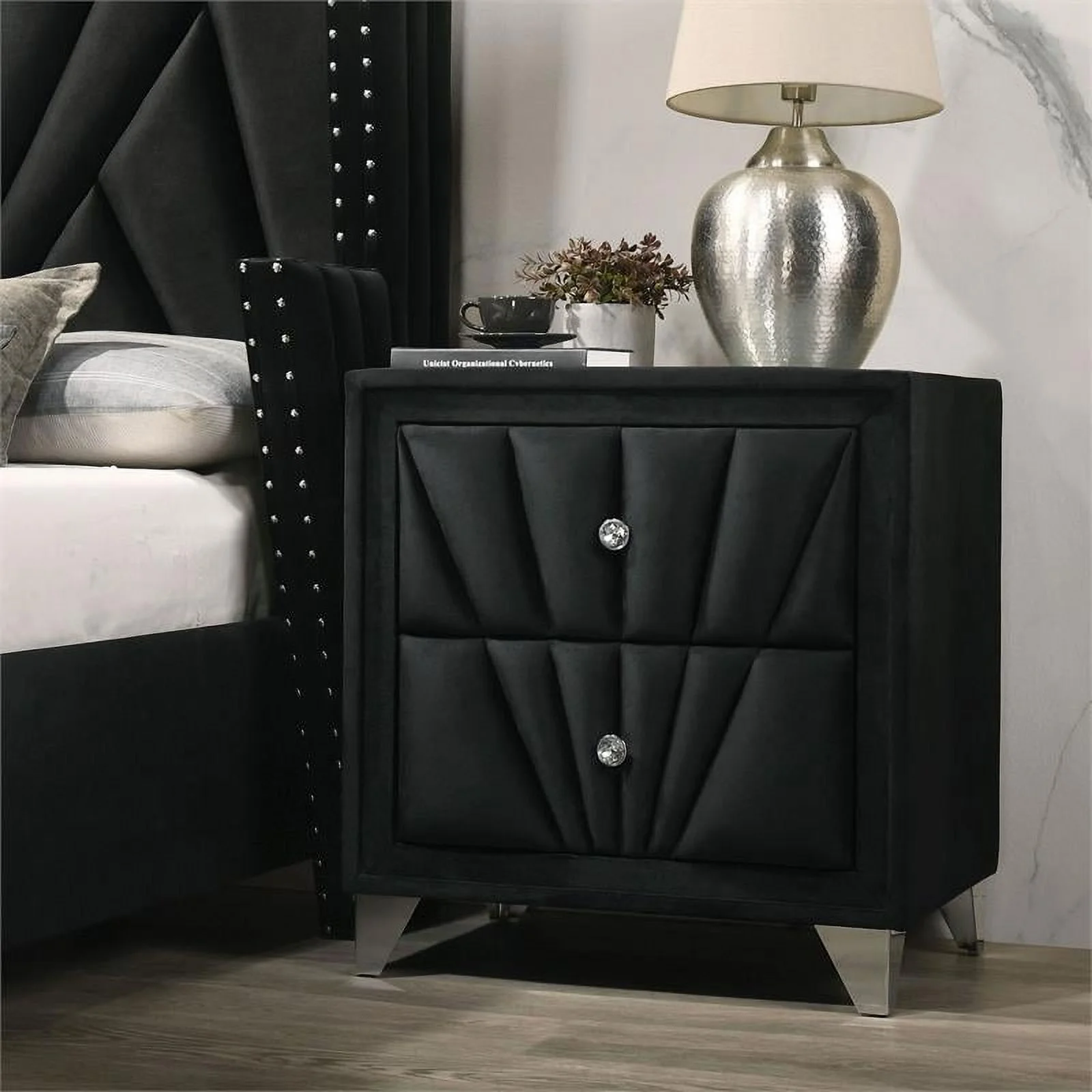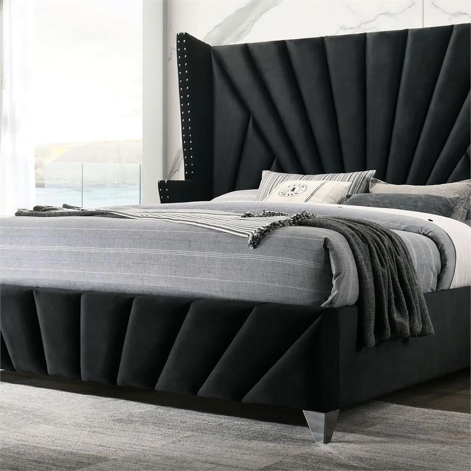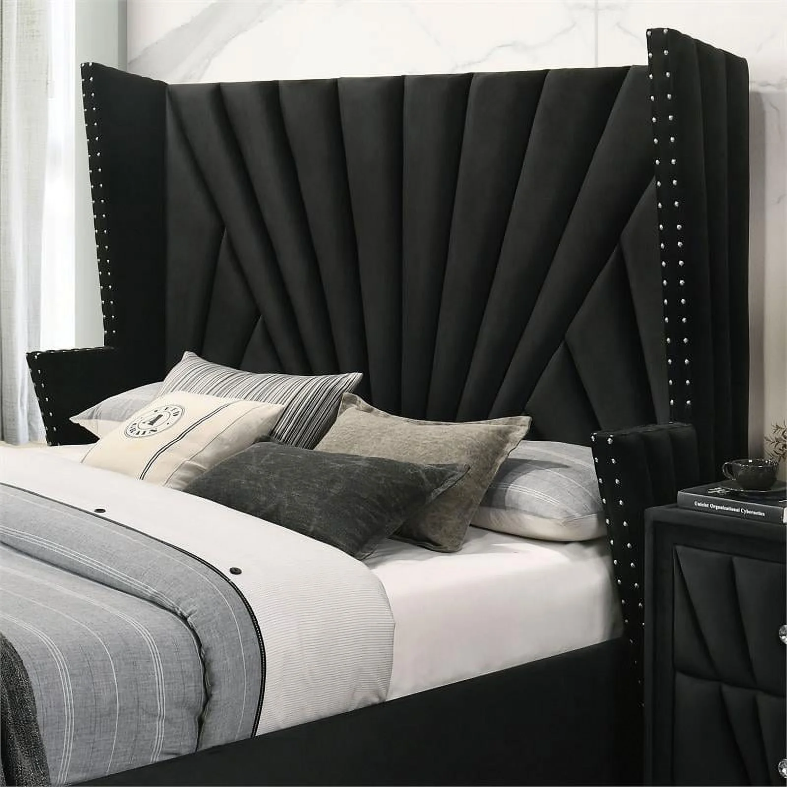 FOA Sakan 6pc Black Fabric Bed Set-Queen+2 Nightstands+Chest+Dresser+Mirror