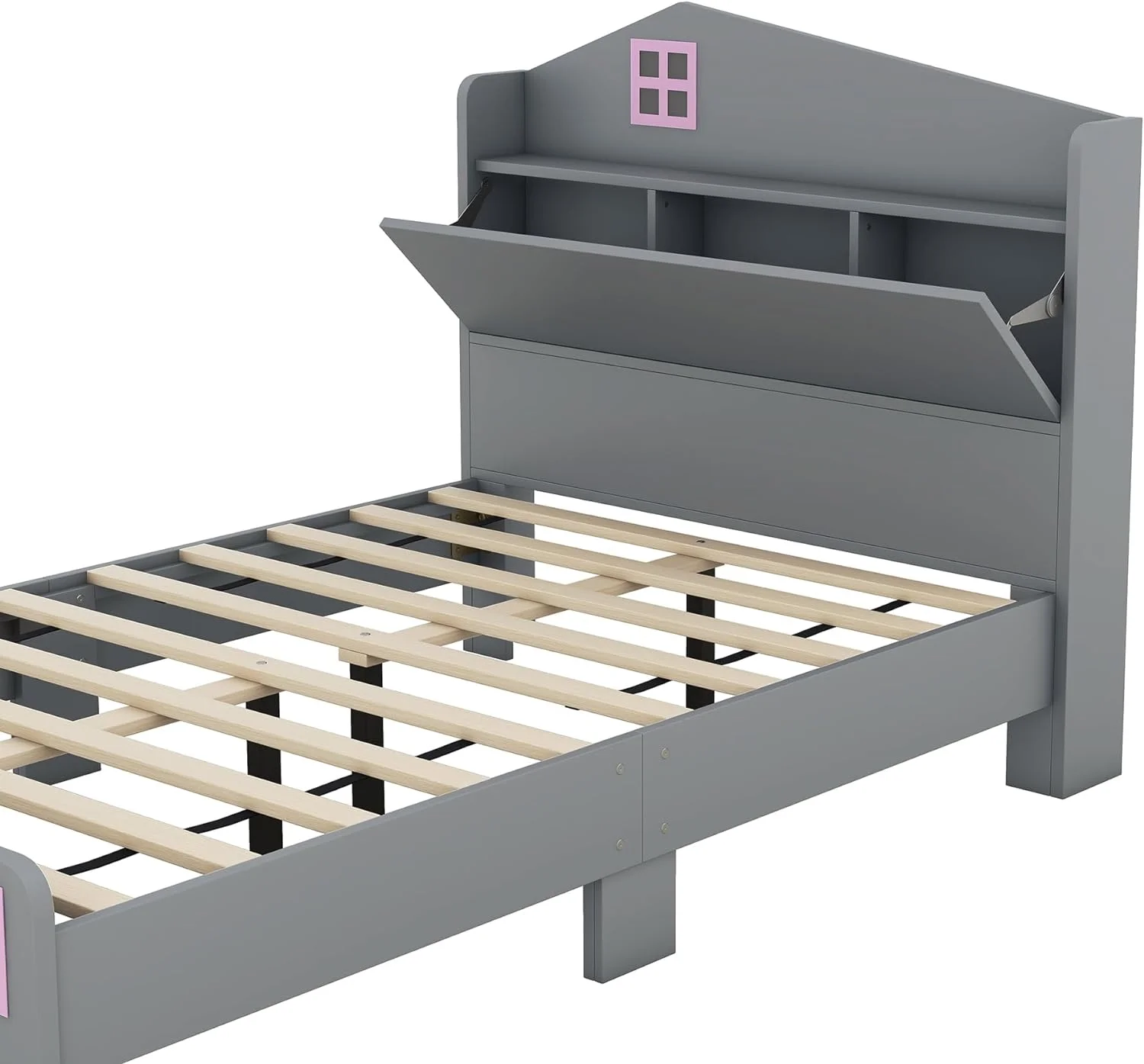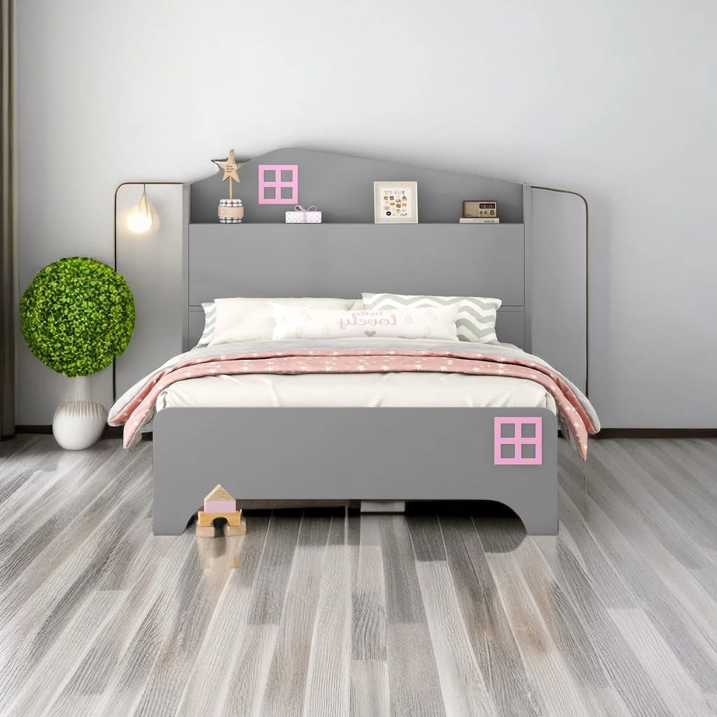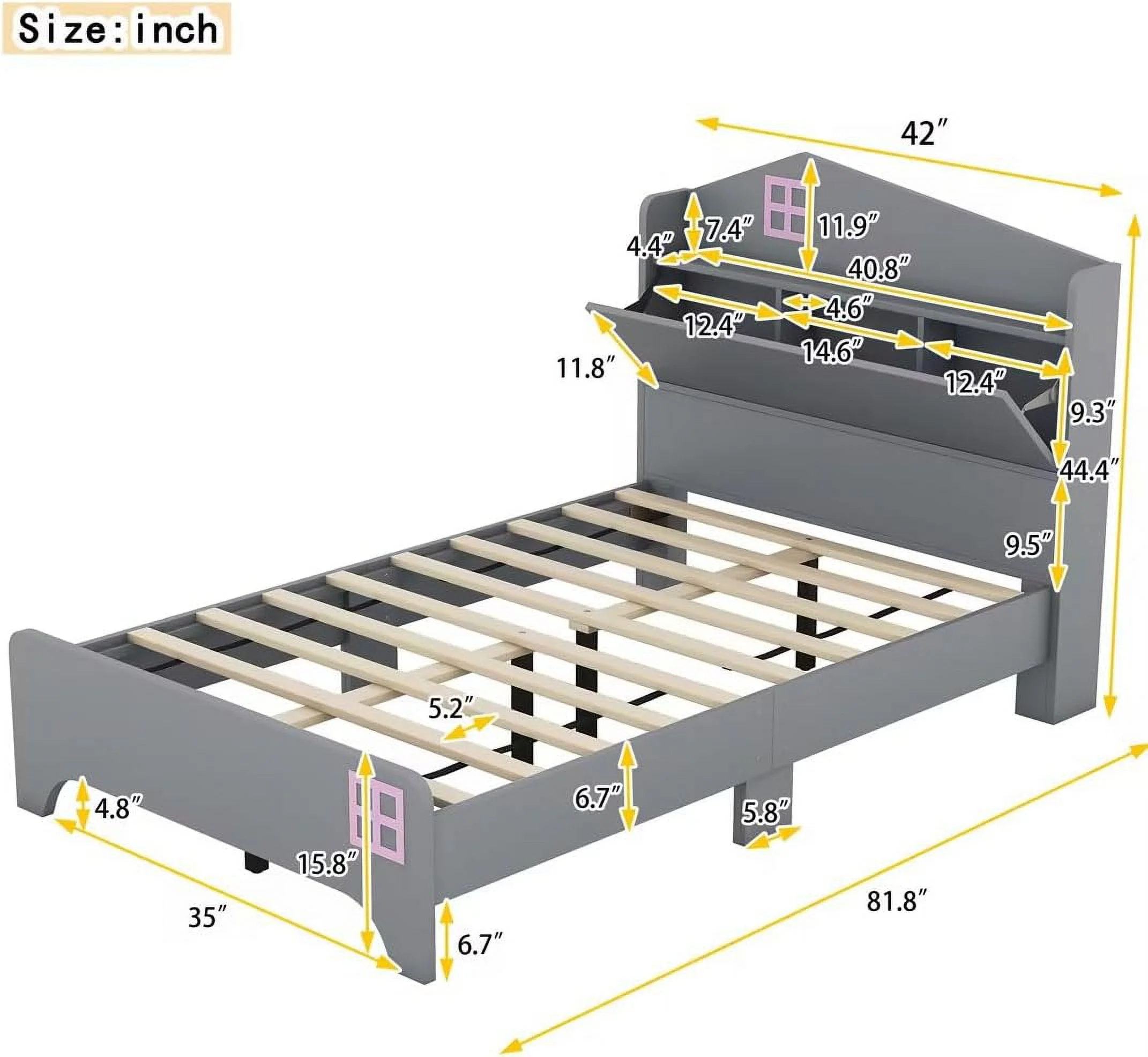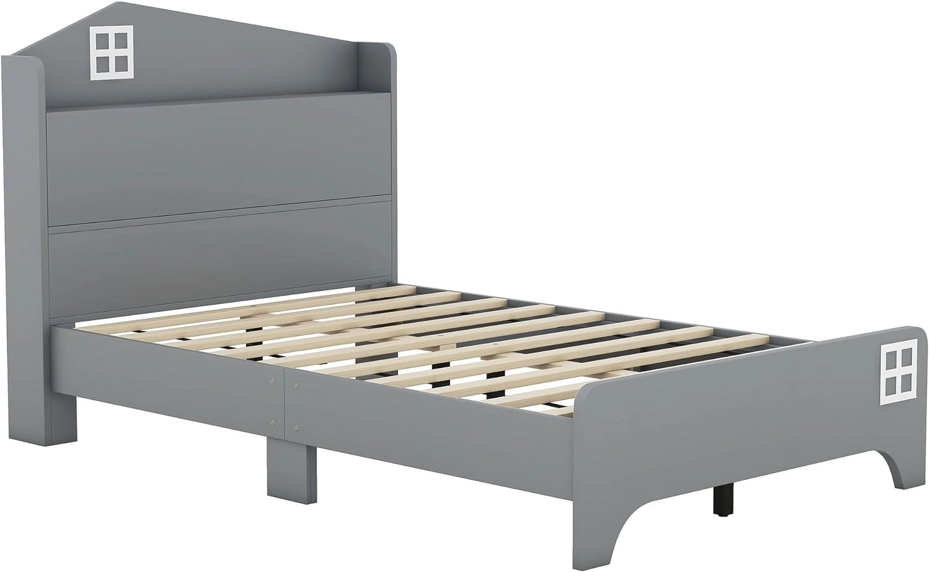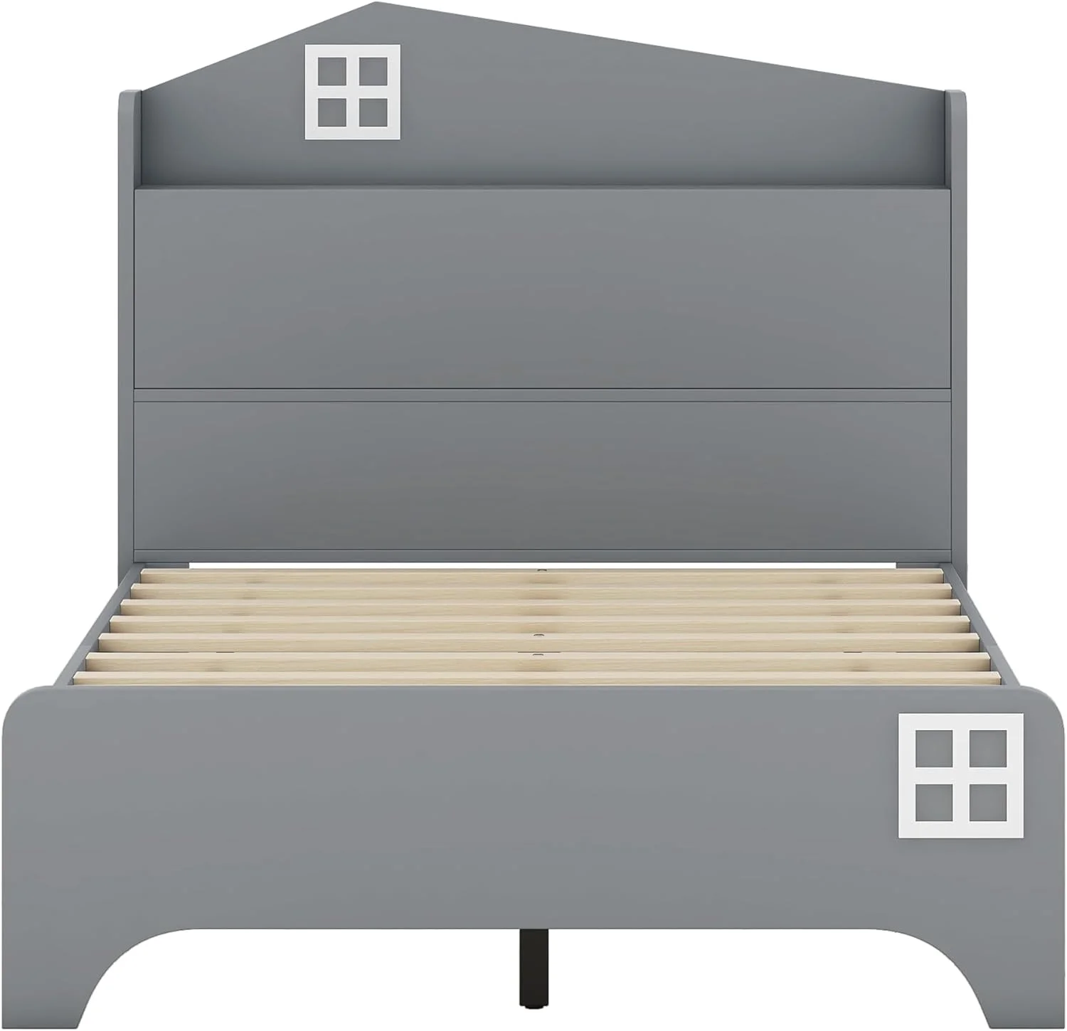 Wooden Twin Size House Bed with Storage Headboard,Kids Bed with Storage Shelf