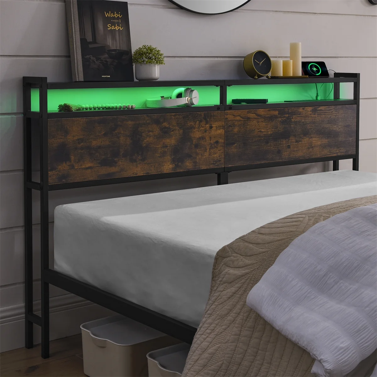 Queen Size Bed Frame, Storage Headboard with Charging Station, No Box Spring Needed, Easy Assembly