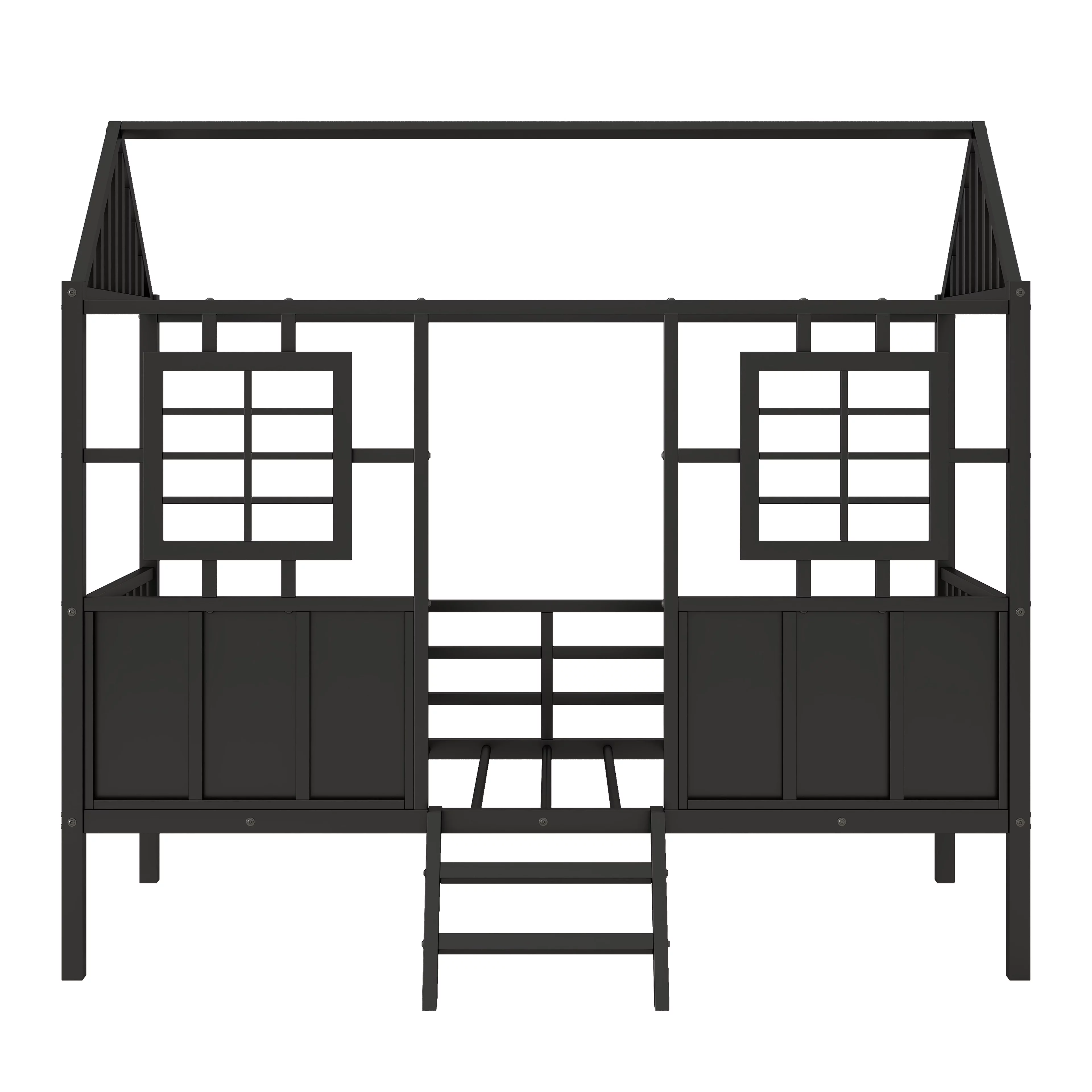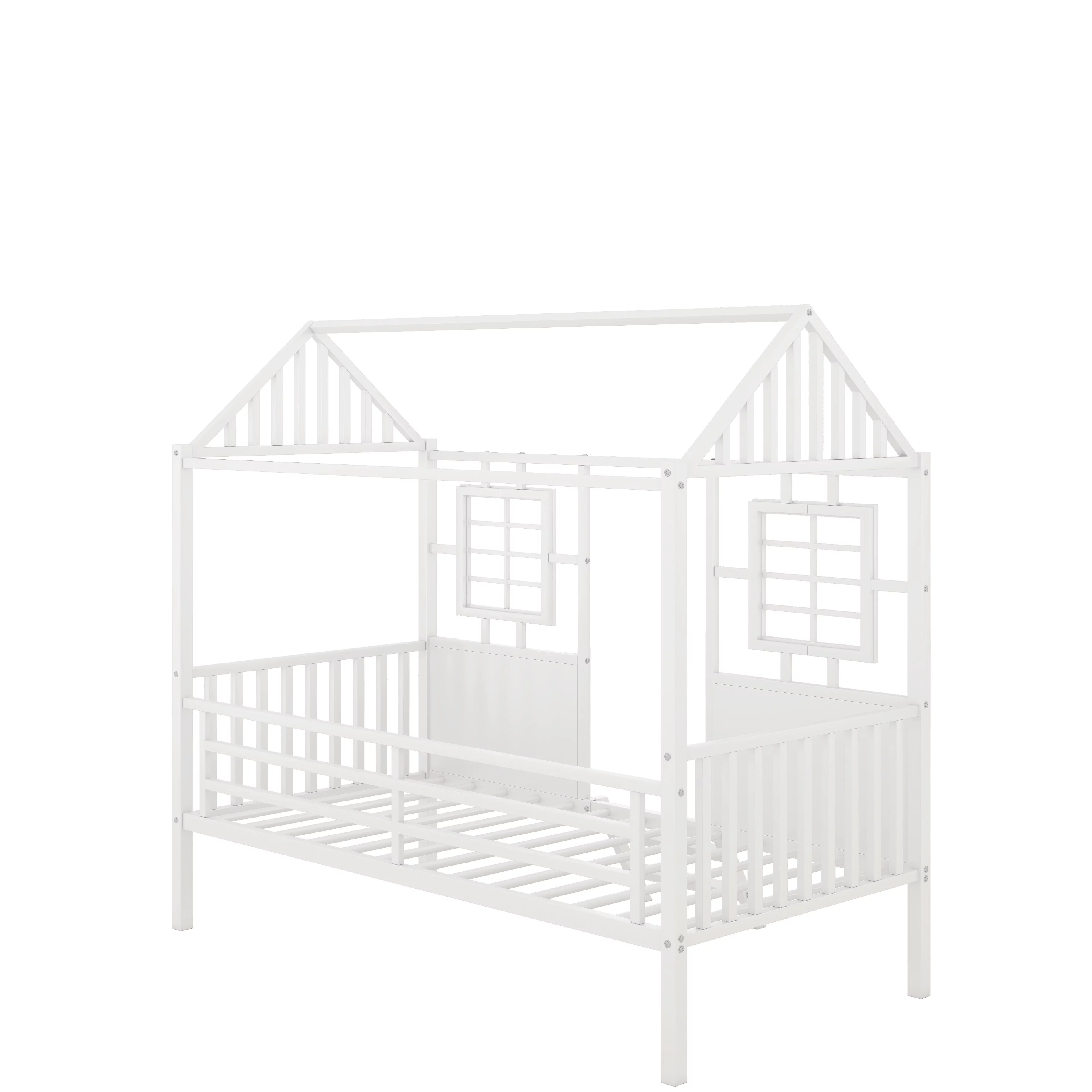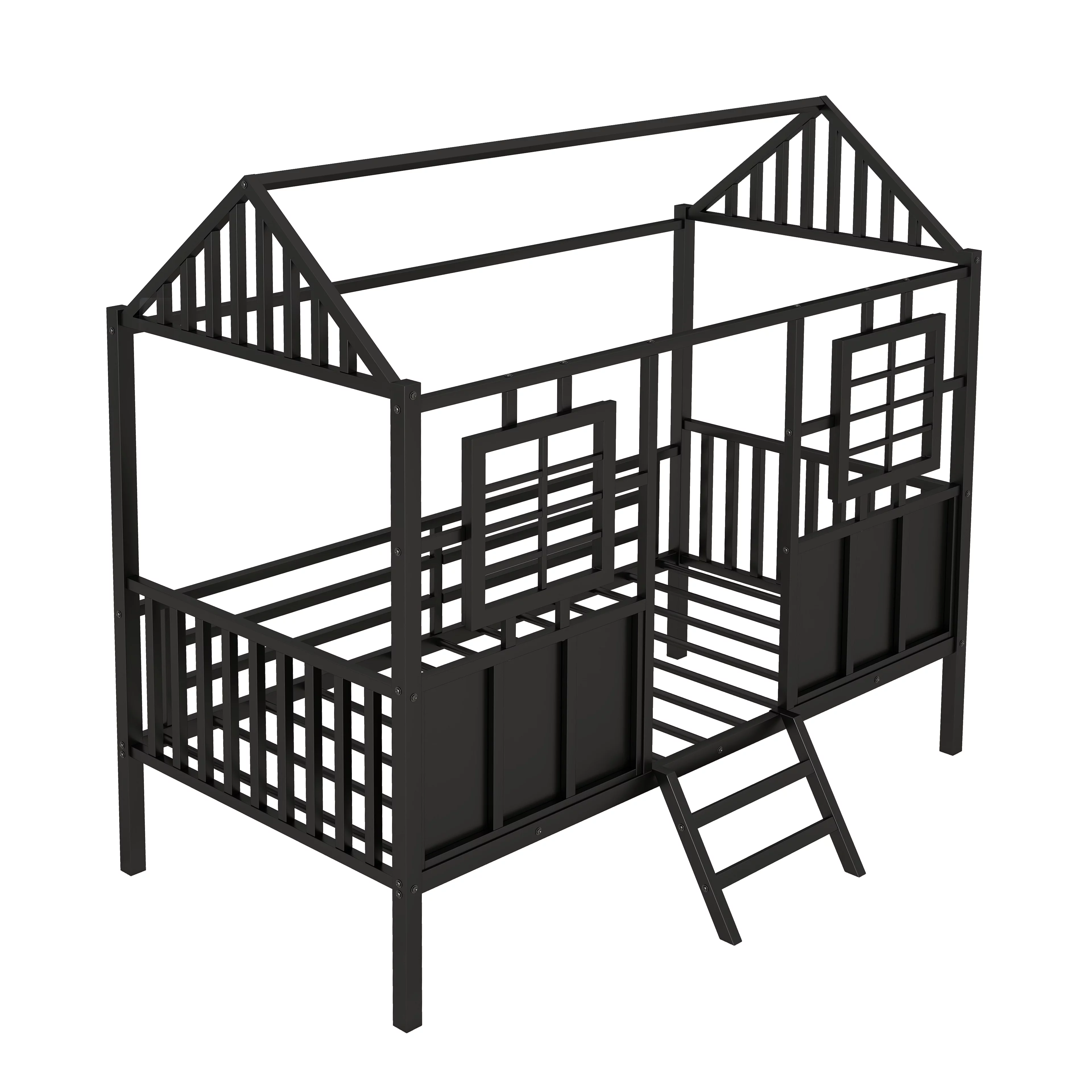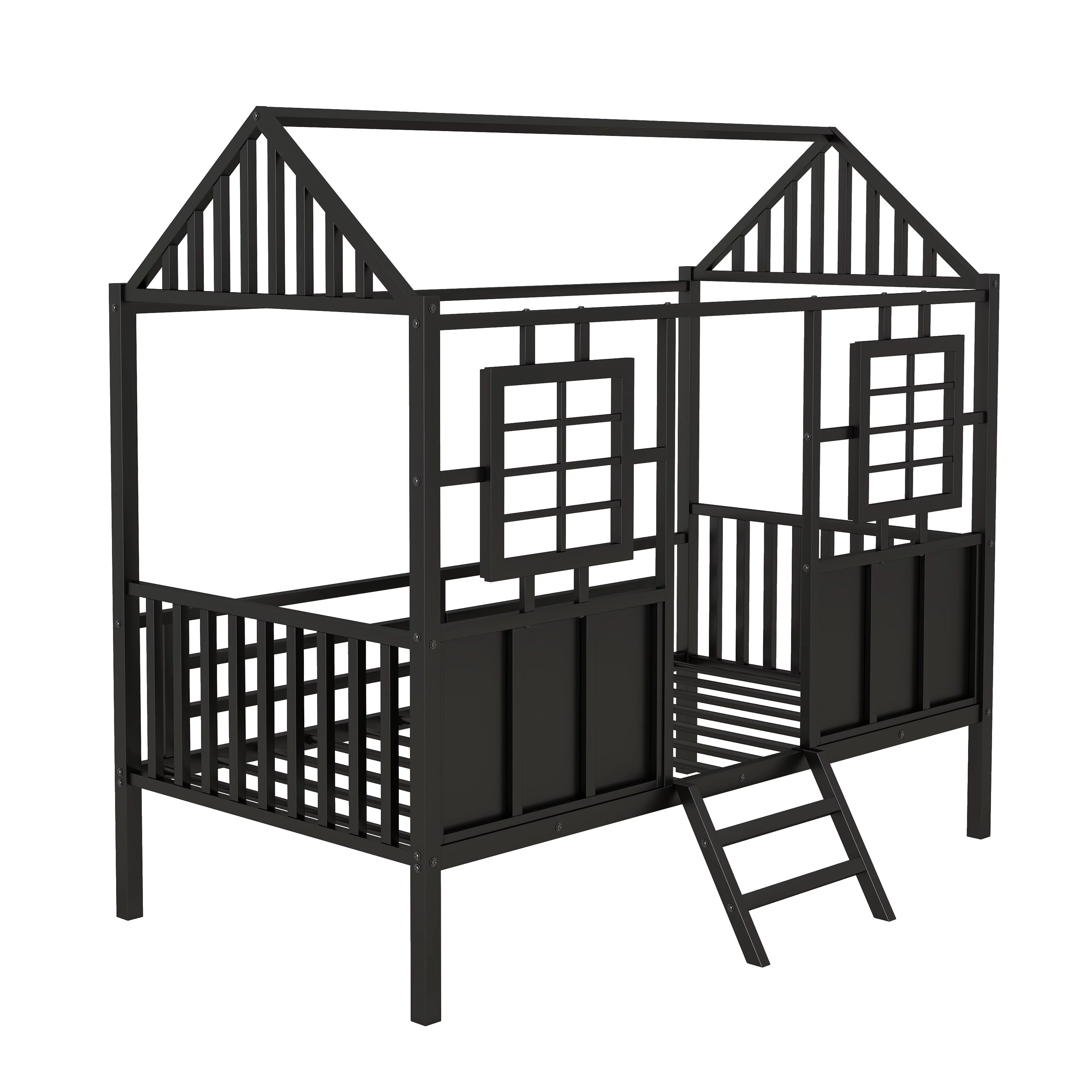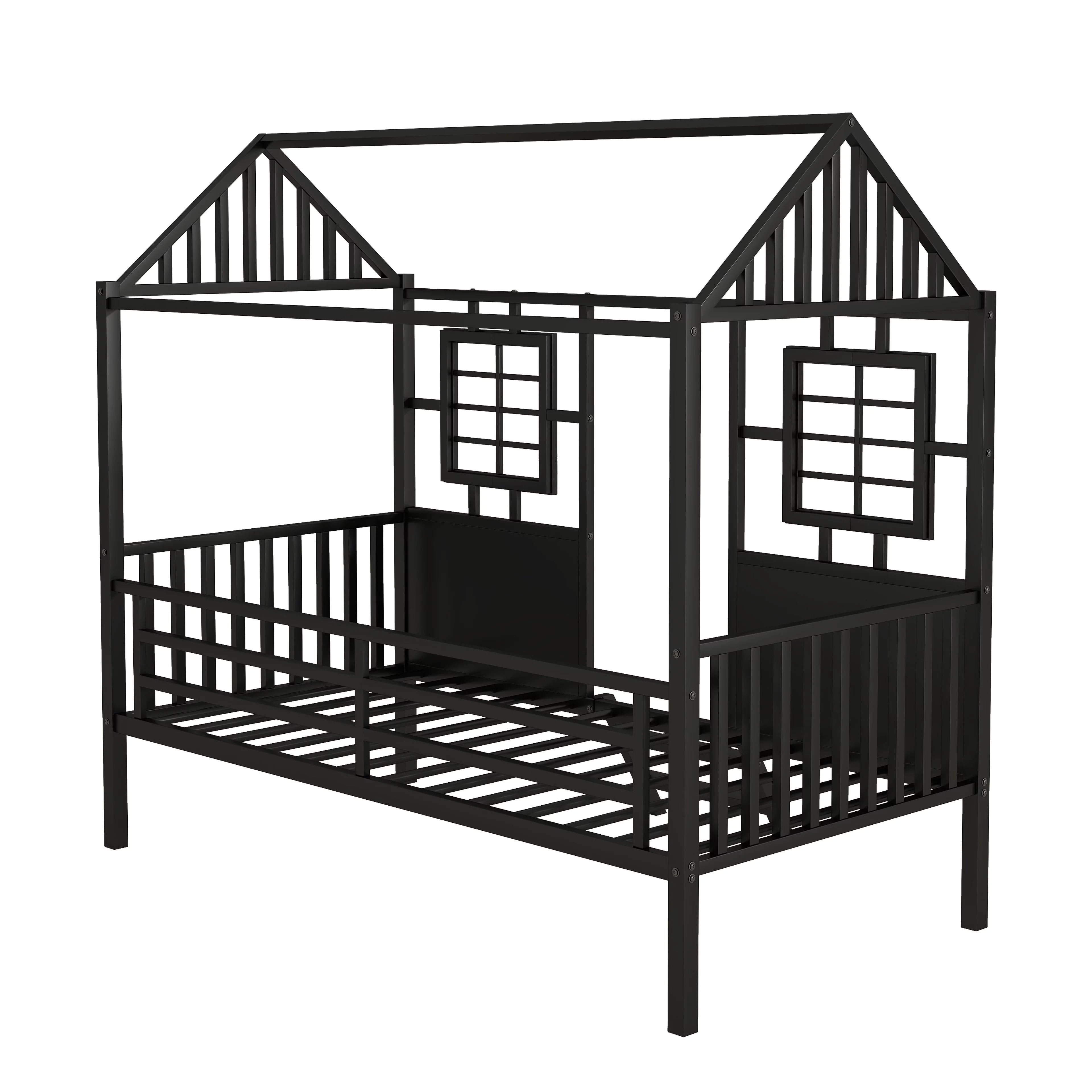 Twin Size House Kids, Low Roof and Window, Loft Girls Boys,Playhouse Bed Frame, Black Metal
