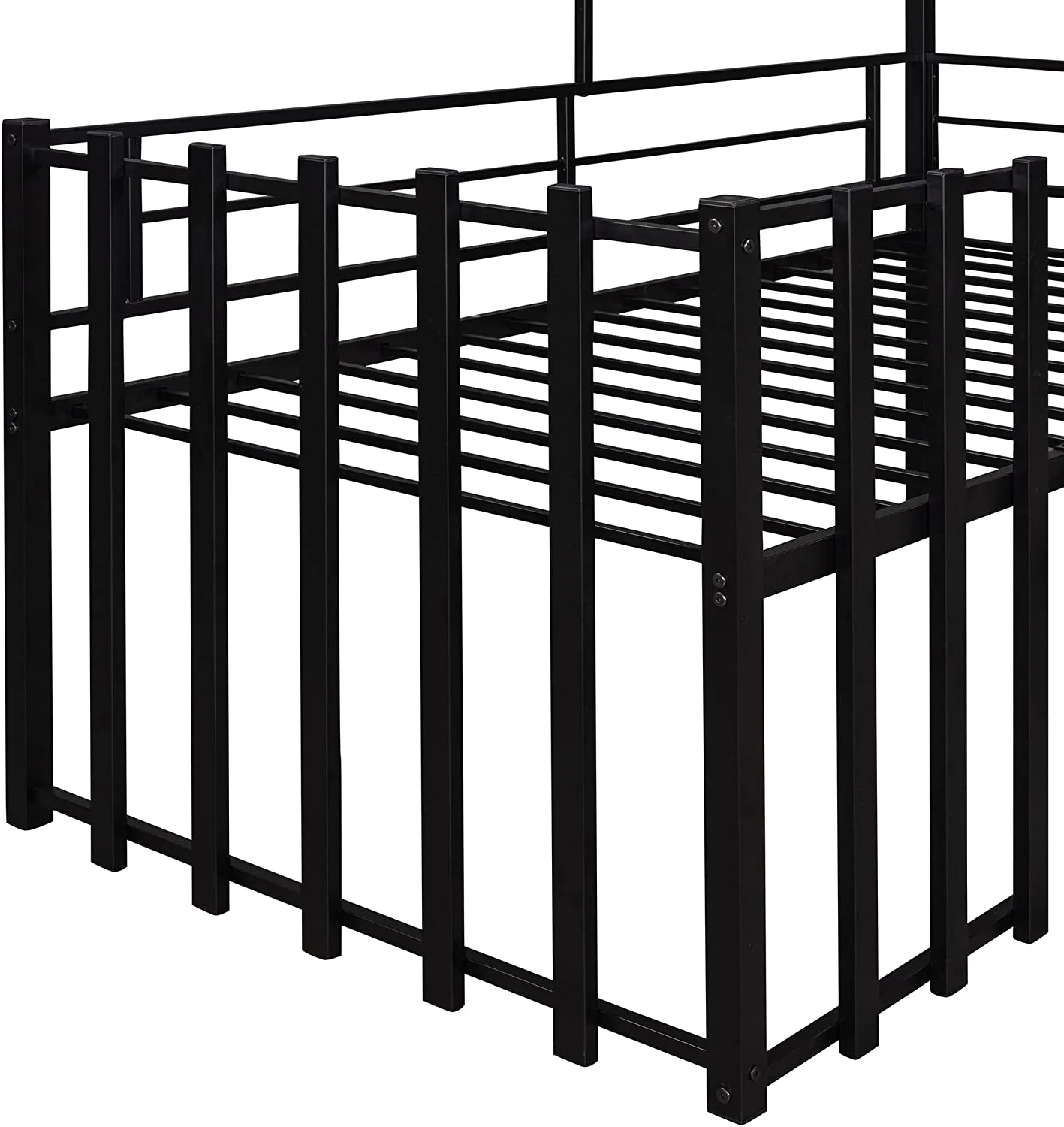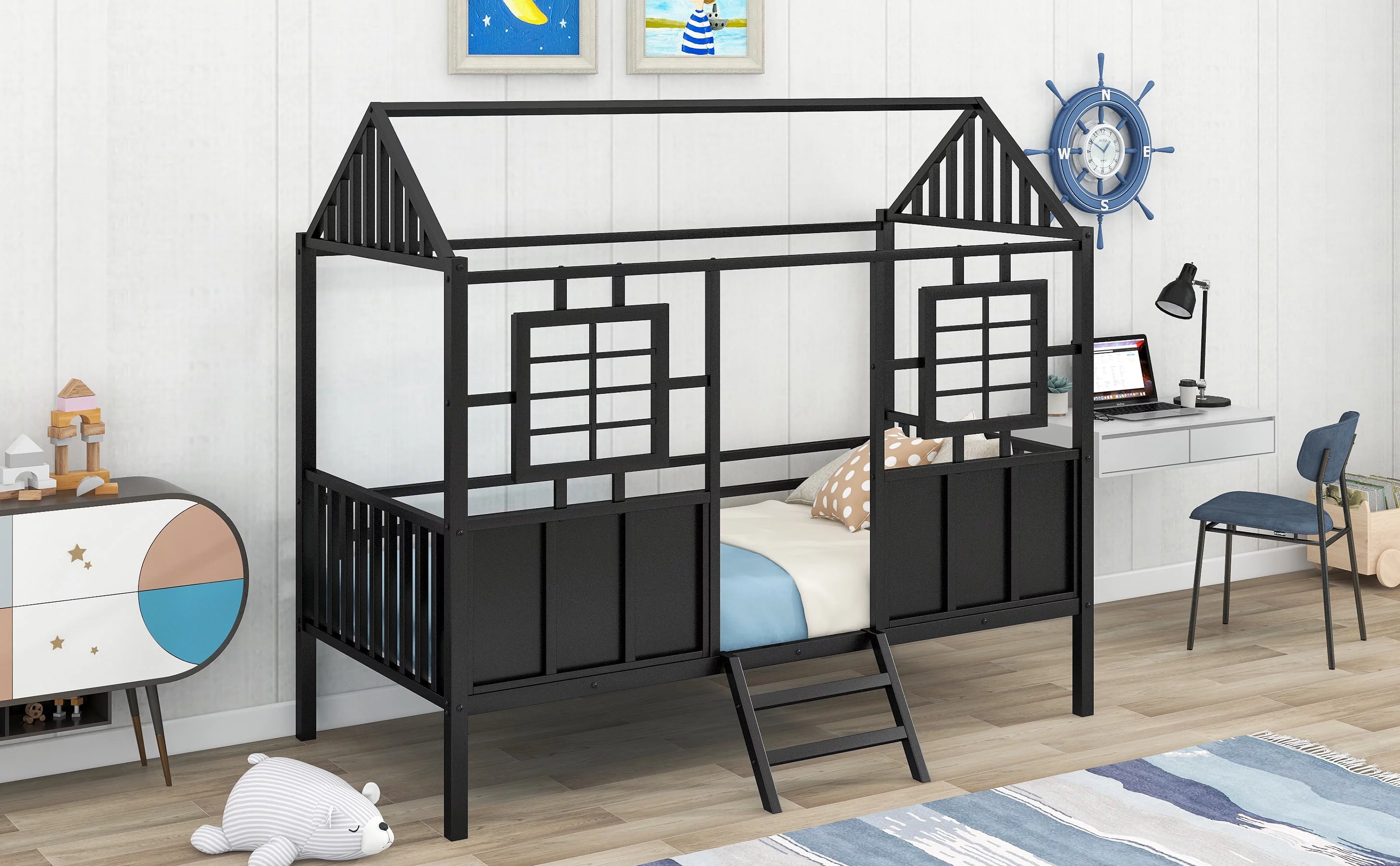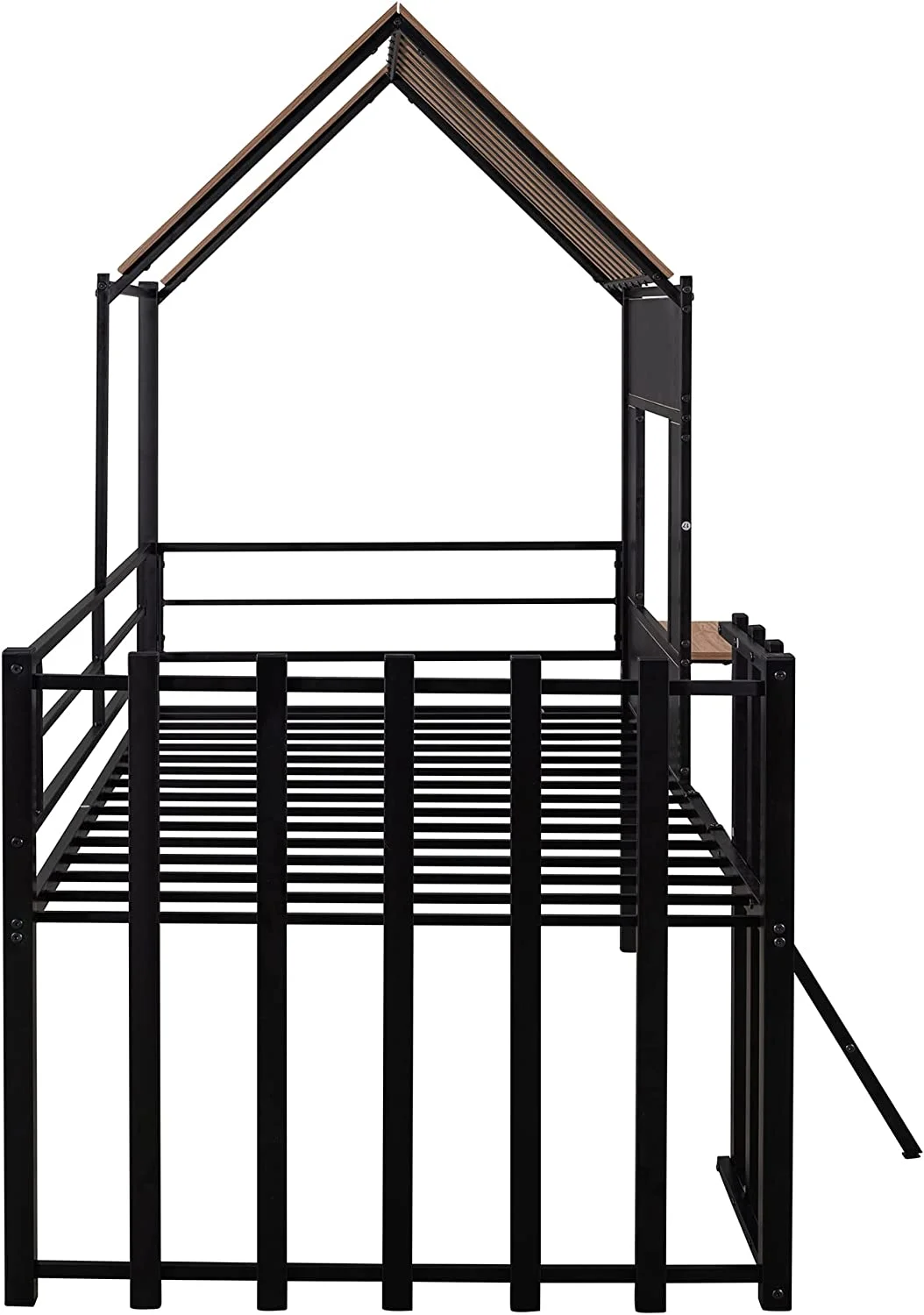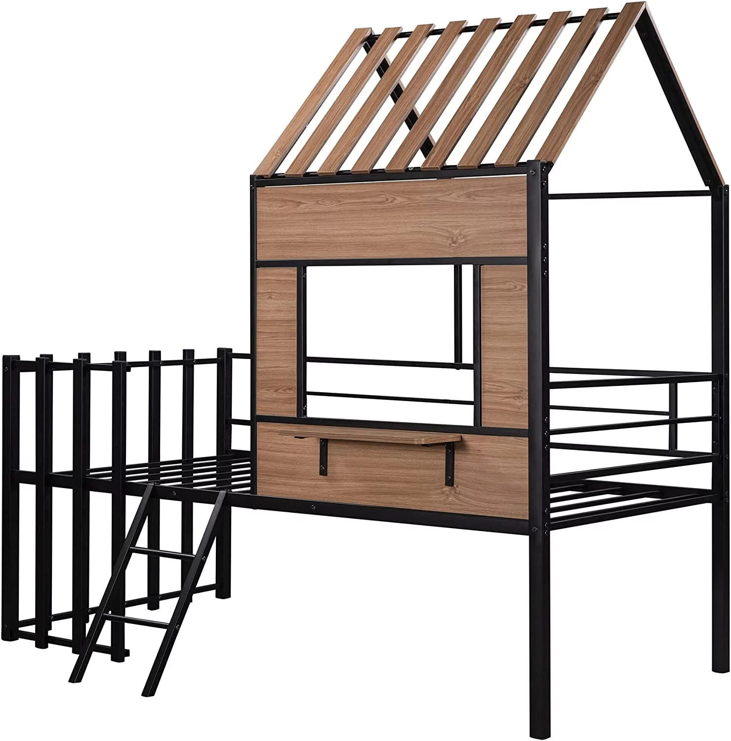 Twin Size House Kids, Low Roof and Window, Loft Girls Boys,Playhouse Bed Frame, Black Metal