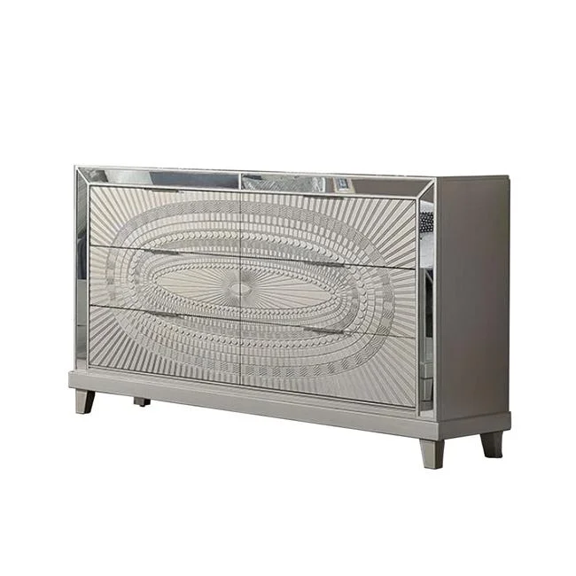 66 in. Pok Beveled Mirror Trim 6 Drawer Wide Dresser Chest, Champagne