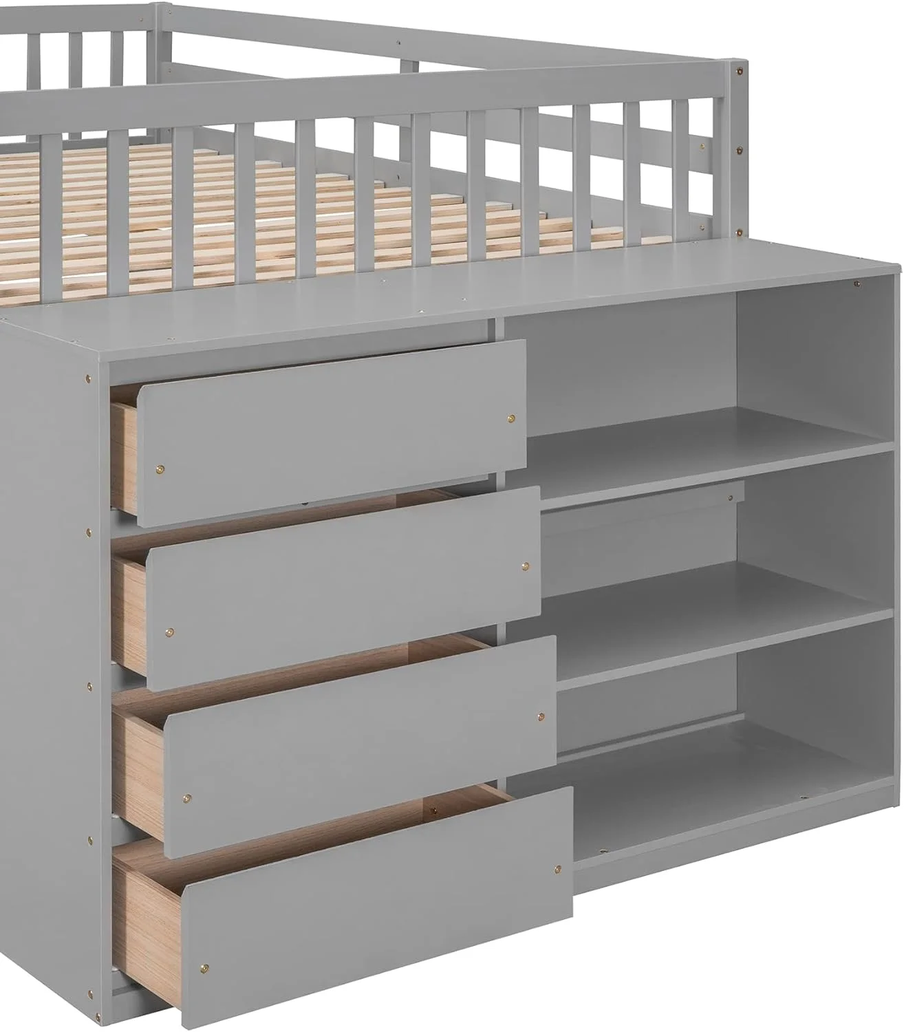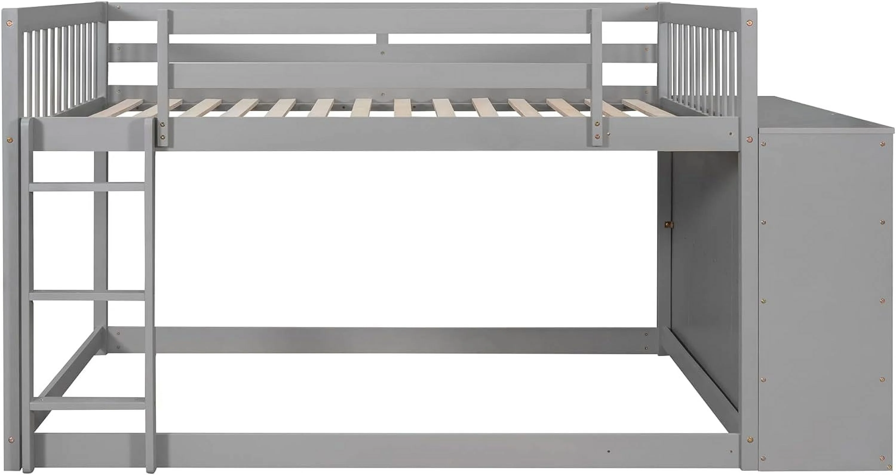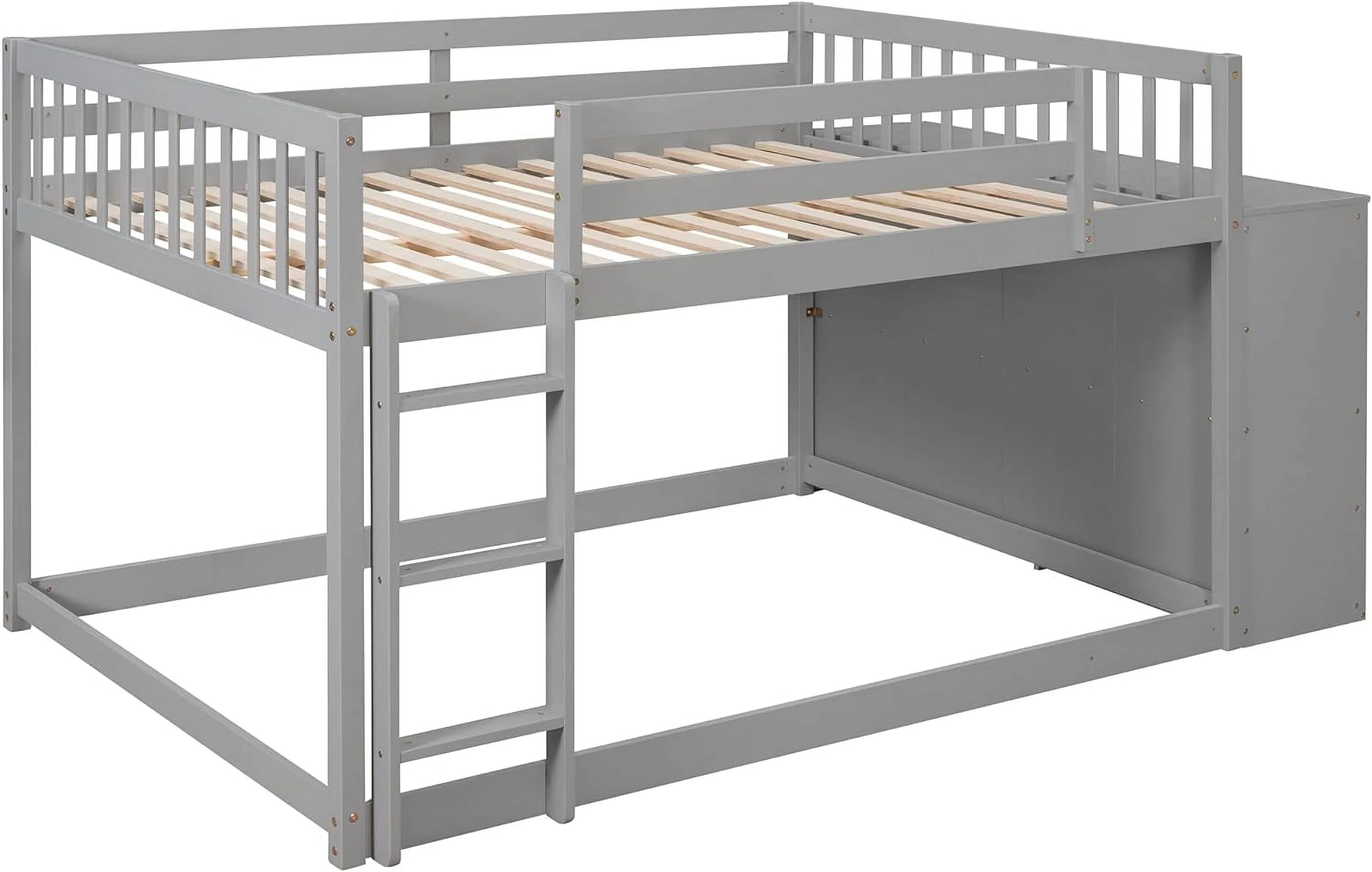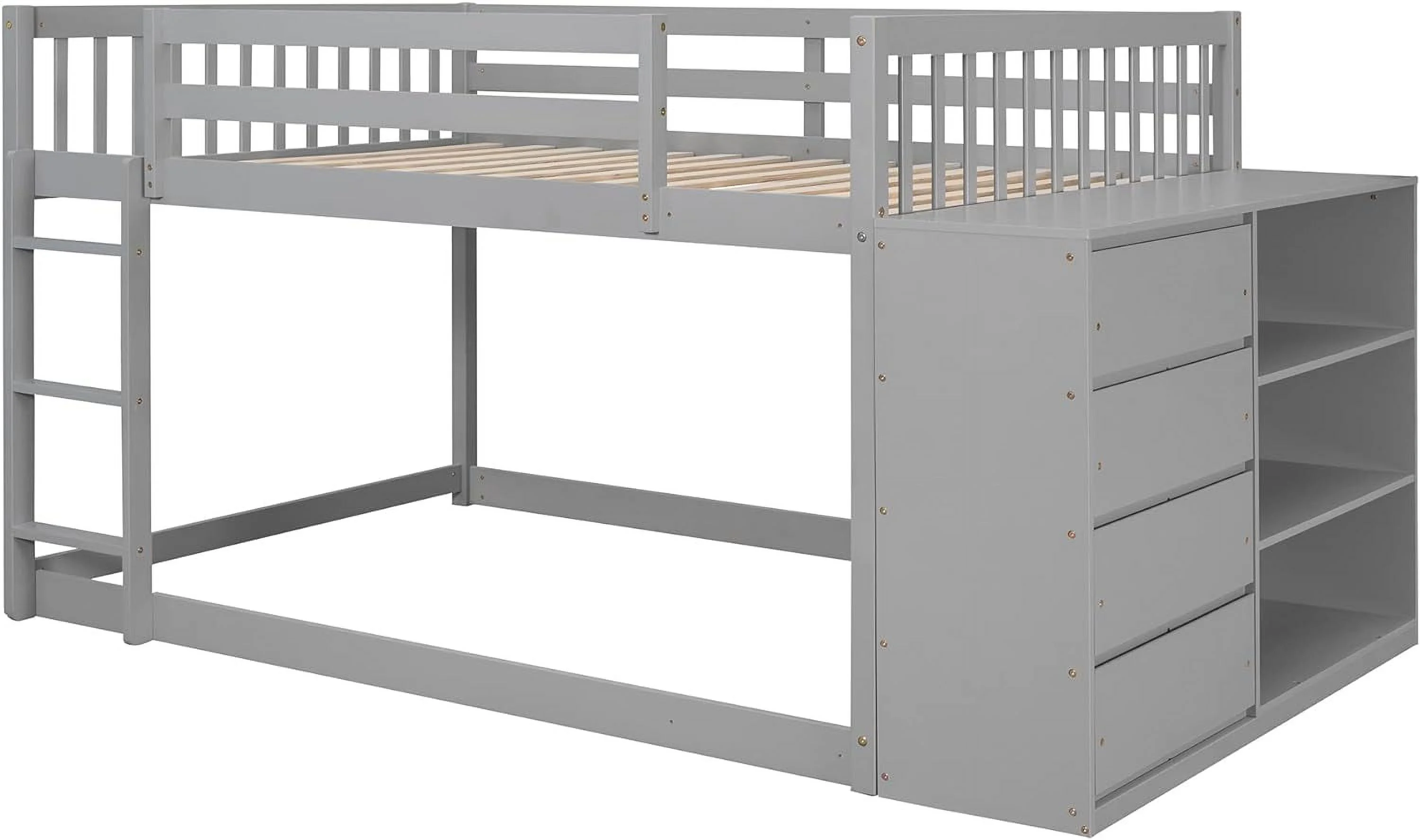 Full Over Full Buk Beds Wih Removable Sorage Cabies,Woode Floor Buk Bed Wih 4 Drawers Ad 3 Shelves,Low Lof Bed For Kids,ees,Aduls (Gray)