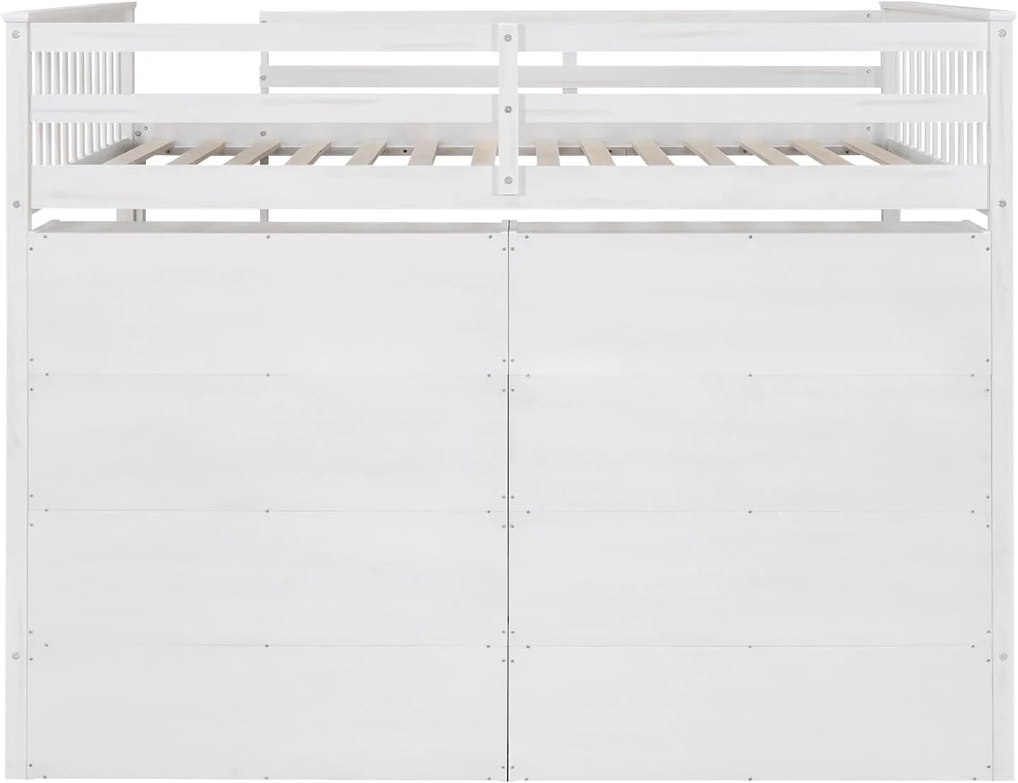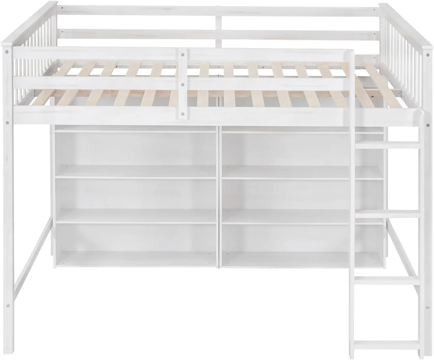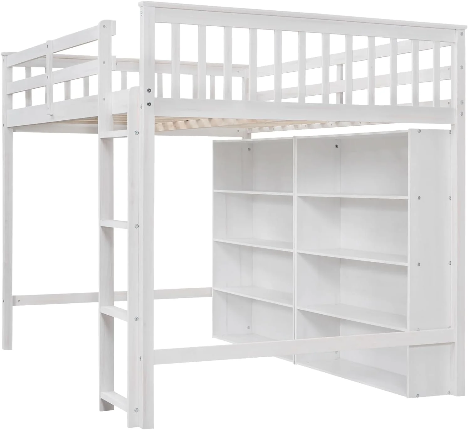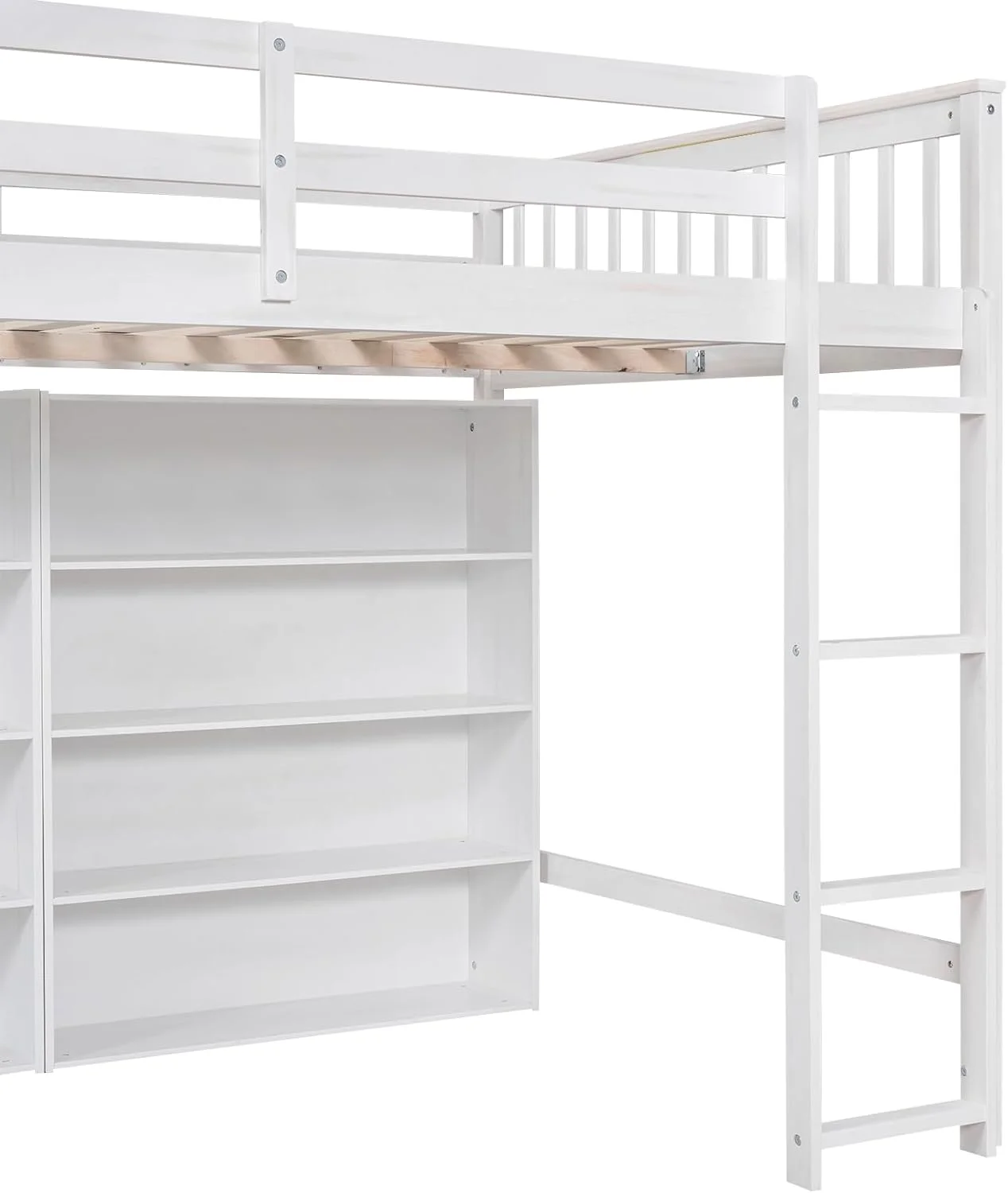 Loft Bed With Desk, With Drawer And Cabinet, Wood For Kids With Bookcase Shelves For Dorm, Boys & Girls Teens Adults, White