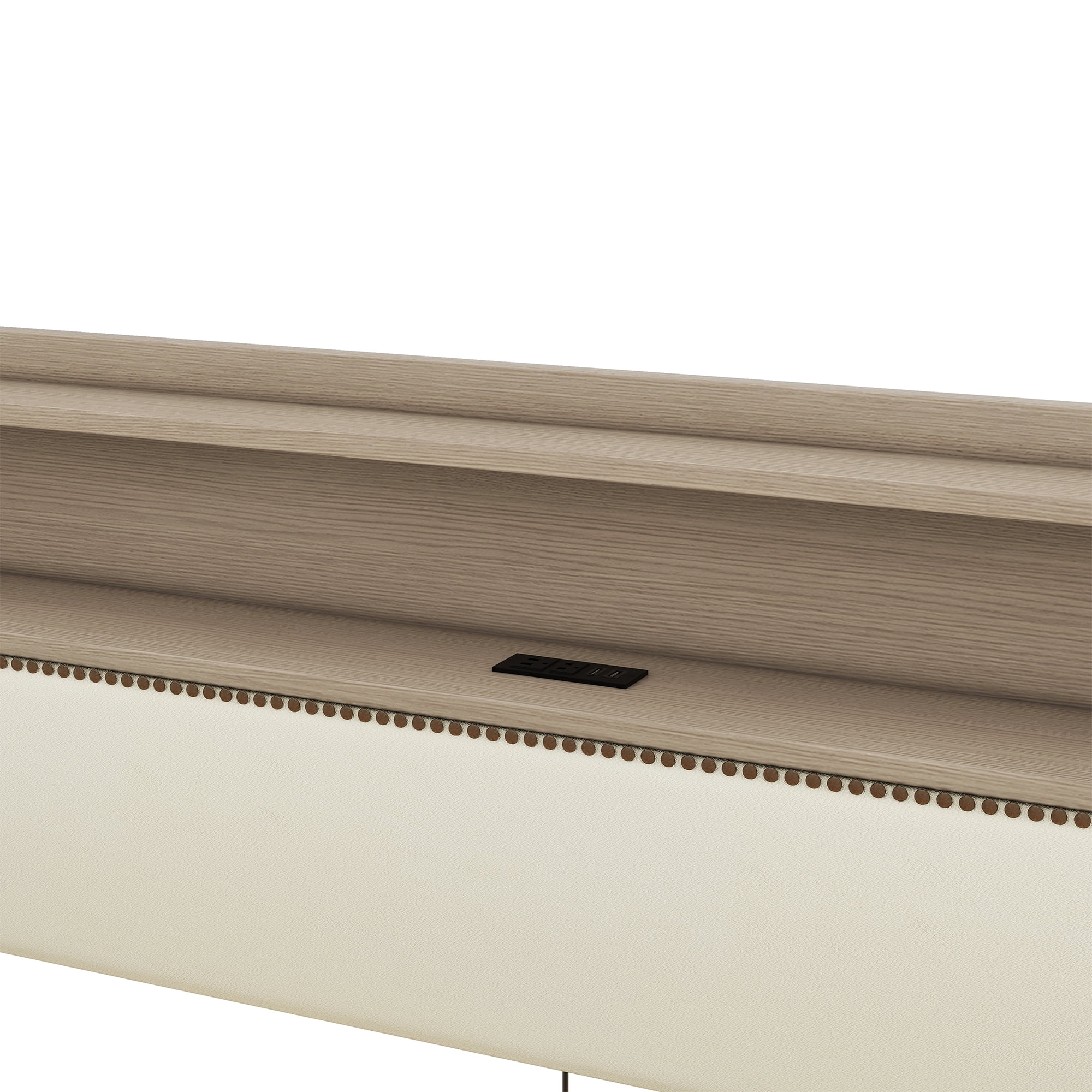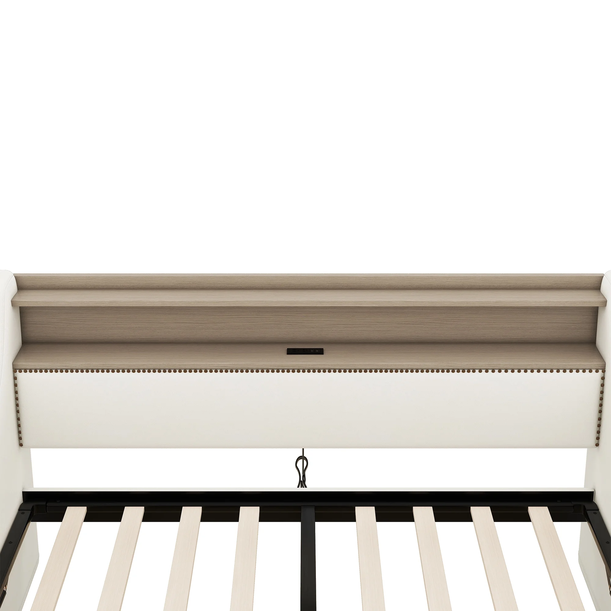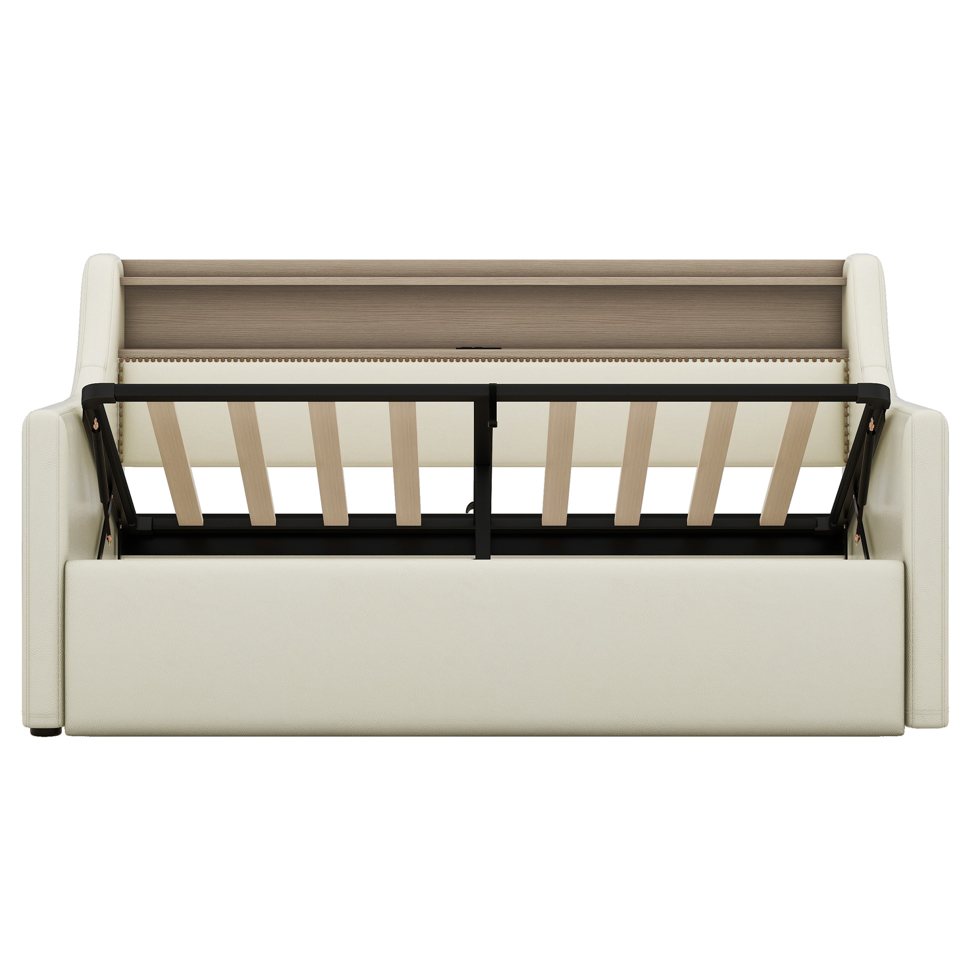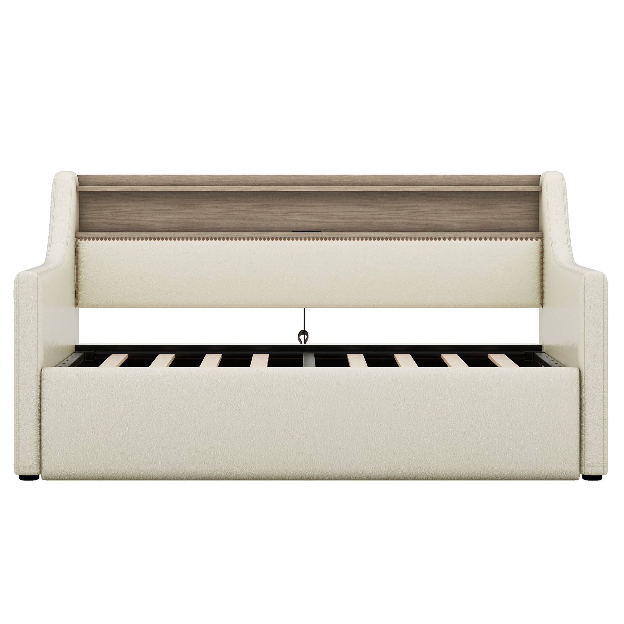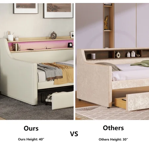 Twin Size Daybed with Storage Drawers, Upholstered Daybed with Charging Station and LED Lights, Beige