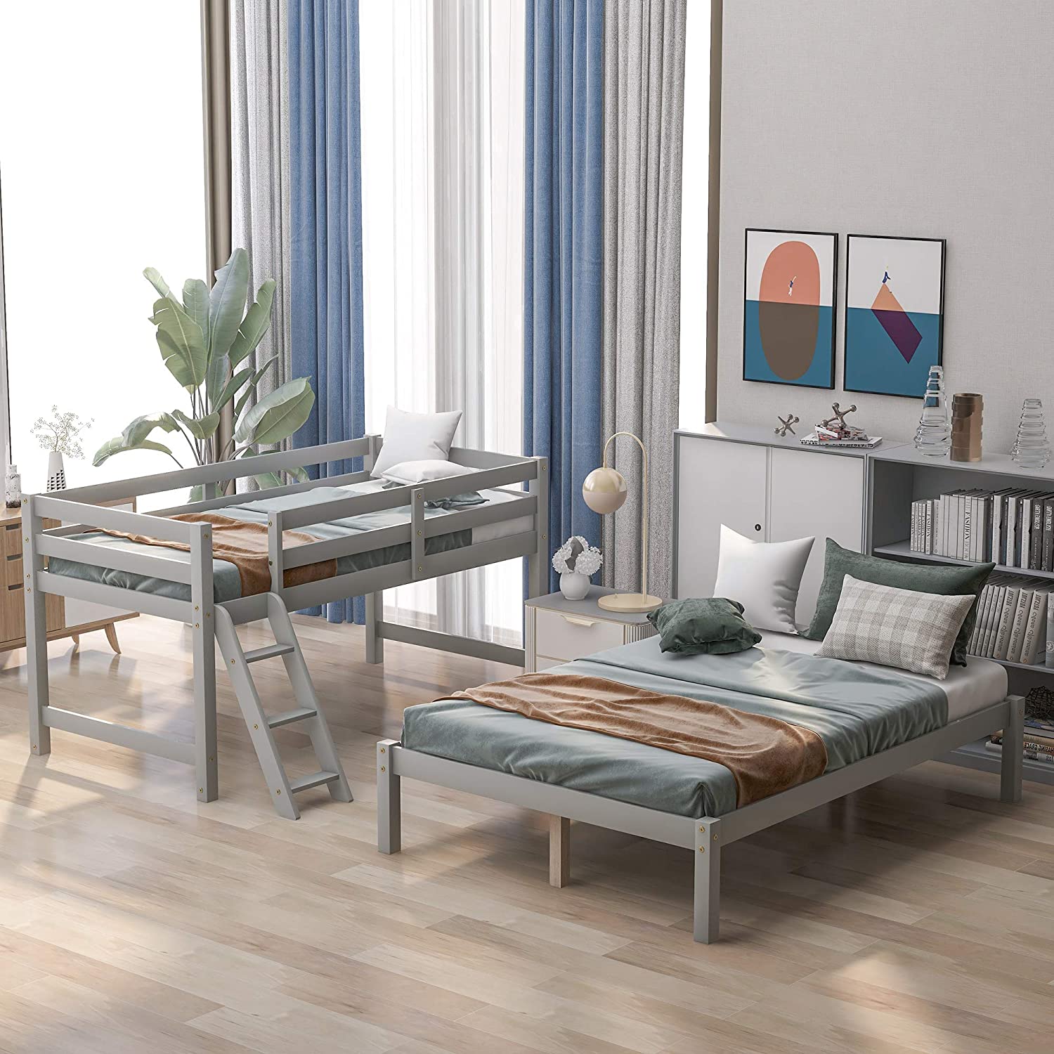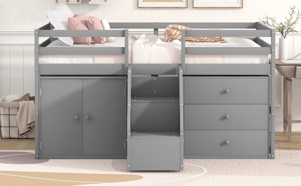 CoSoTower Full Size Functional Loft Bed with Cabinets and Drawers, Hanging Clothes at The Back of The Staircase, Gray