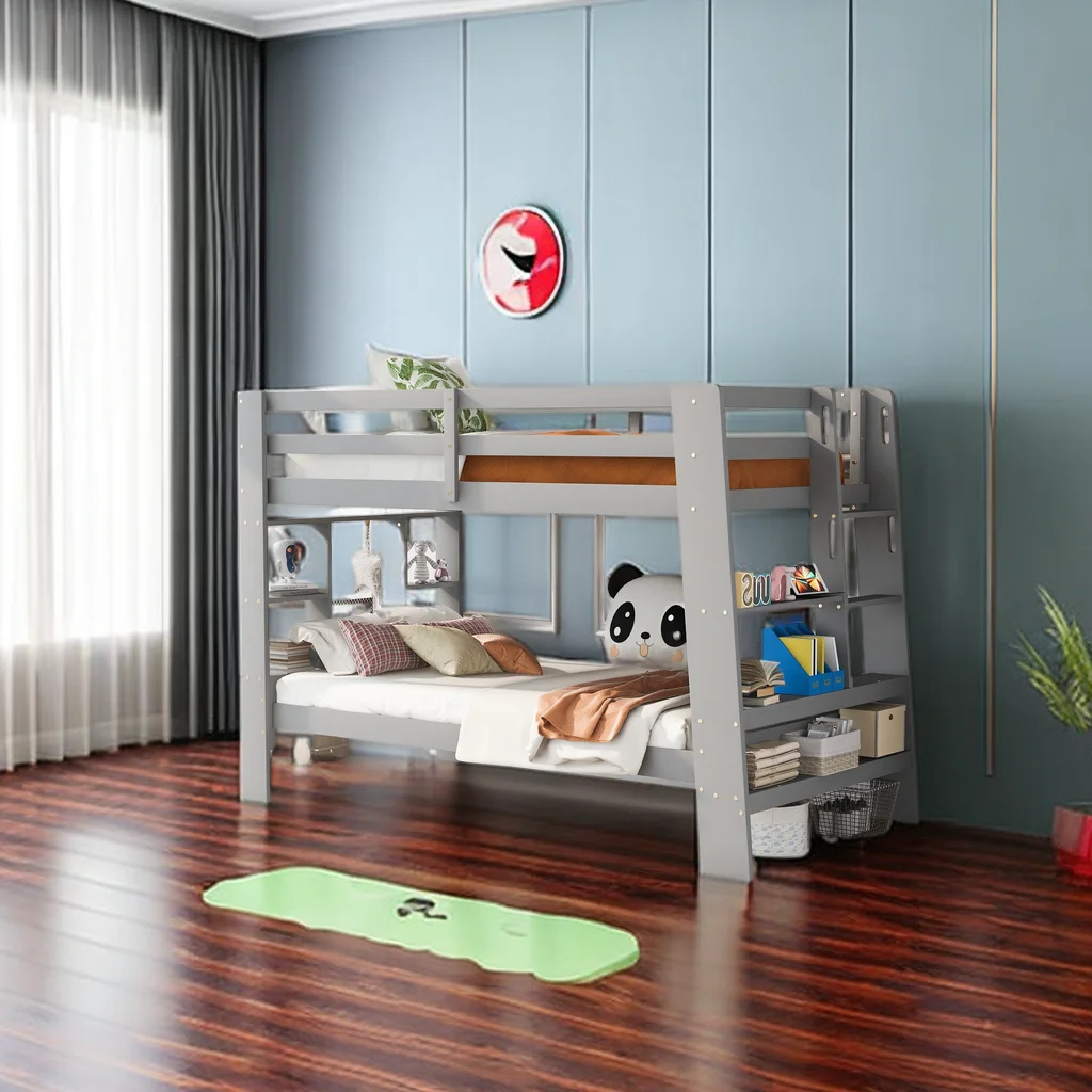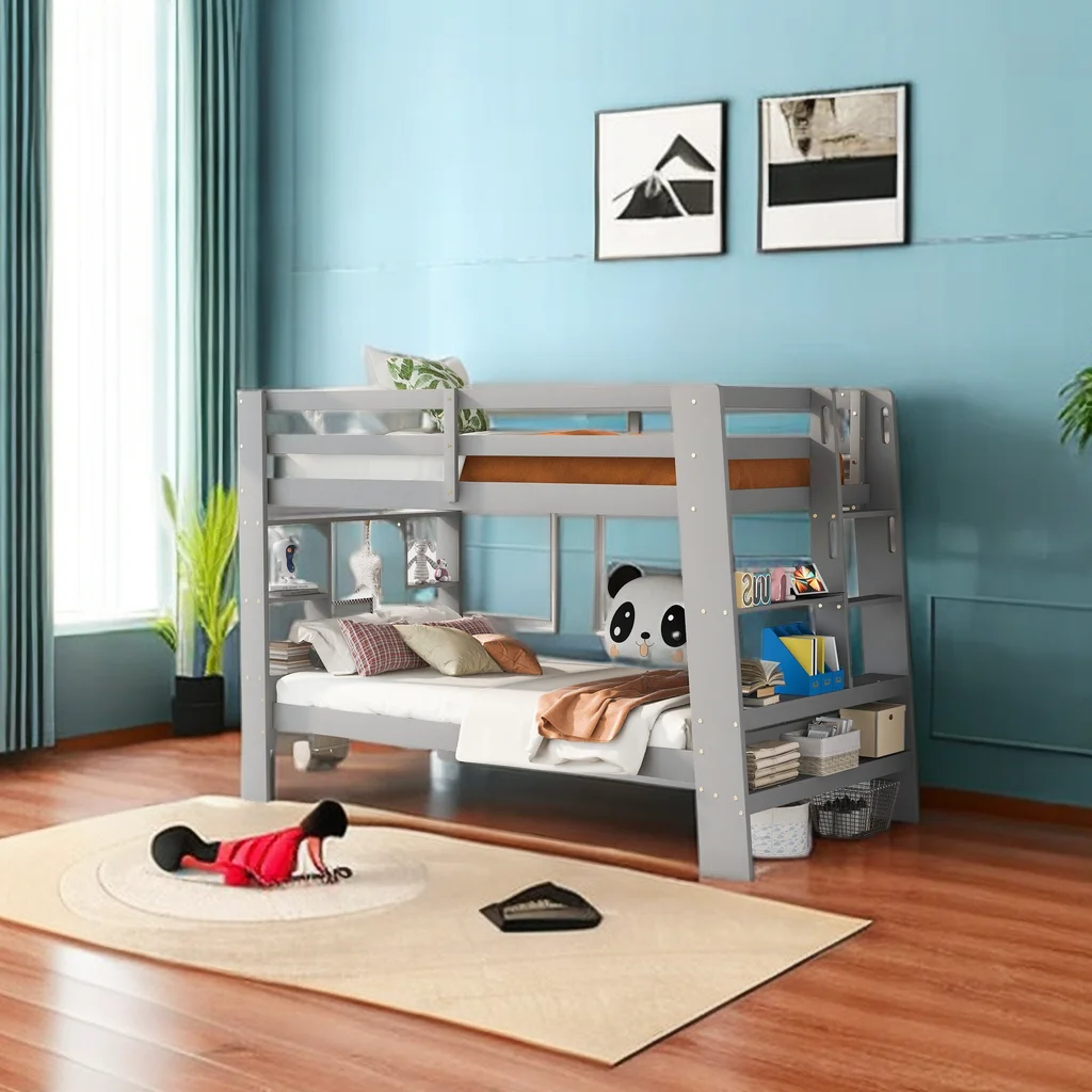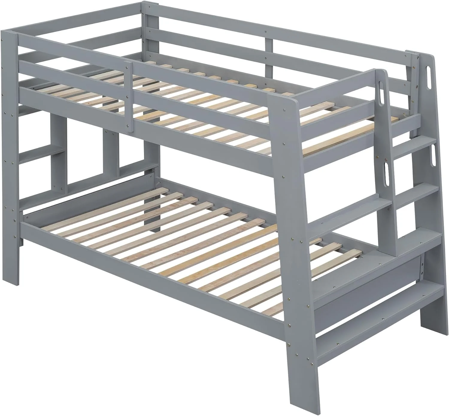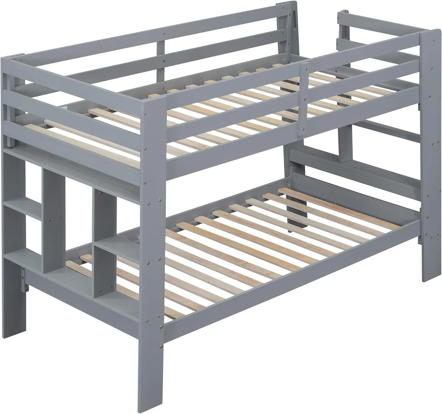 Twin Over Twin Bunk Bed with Shelves and Built-in Ladder,Safety Guardrail