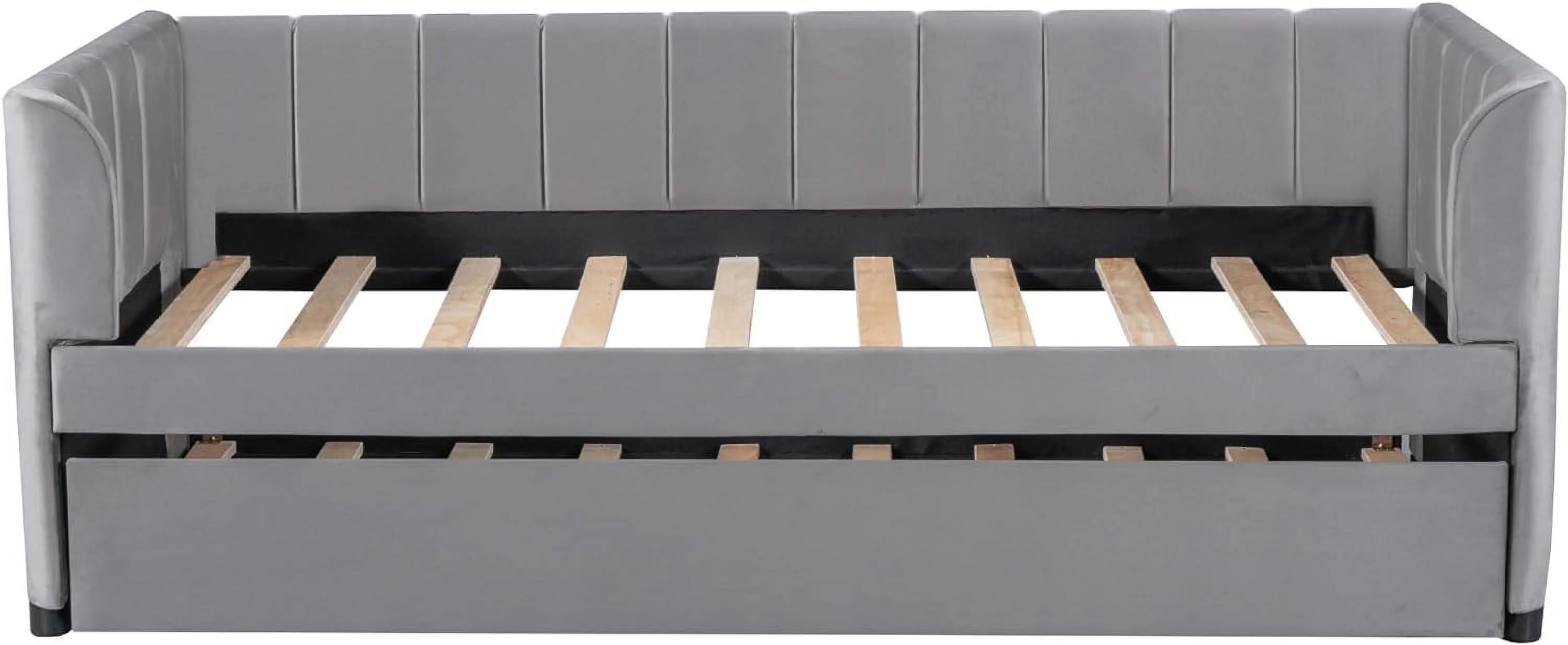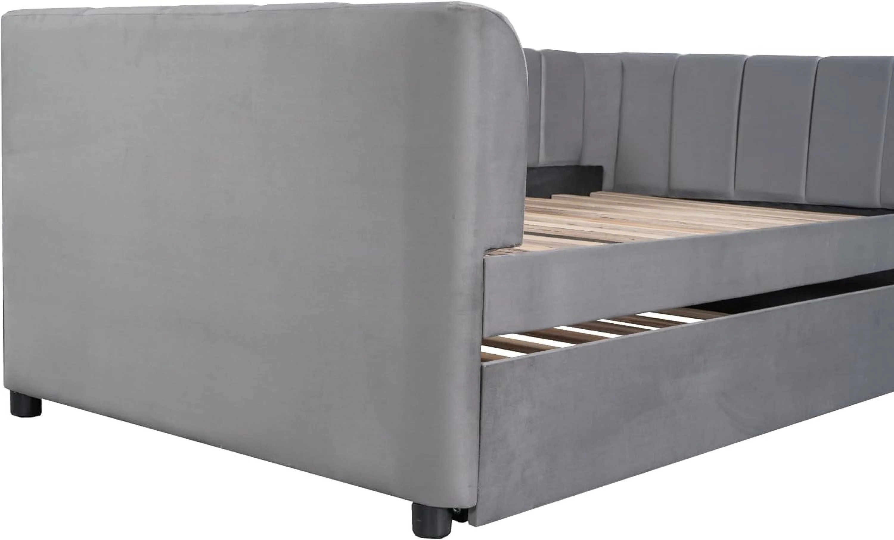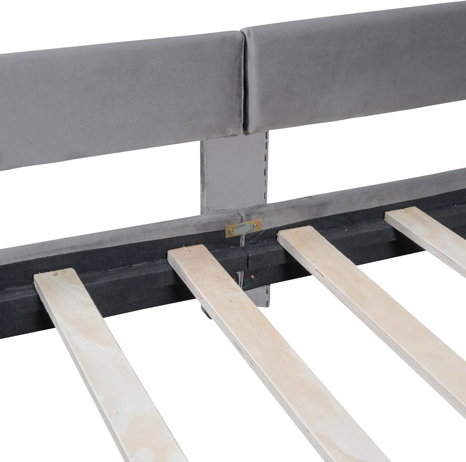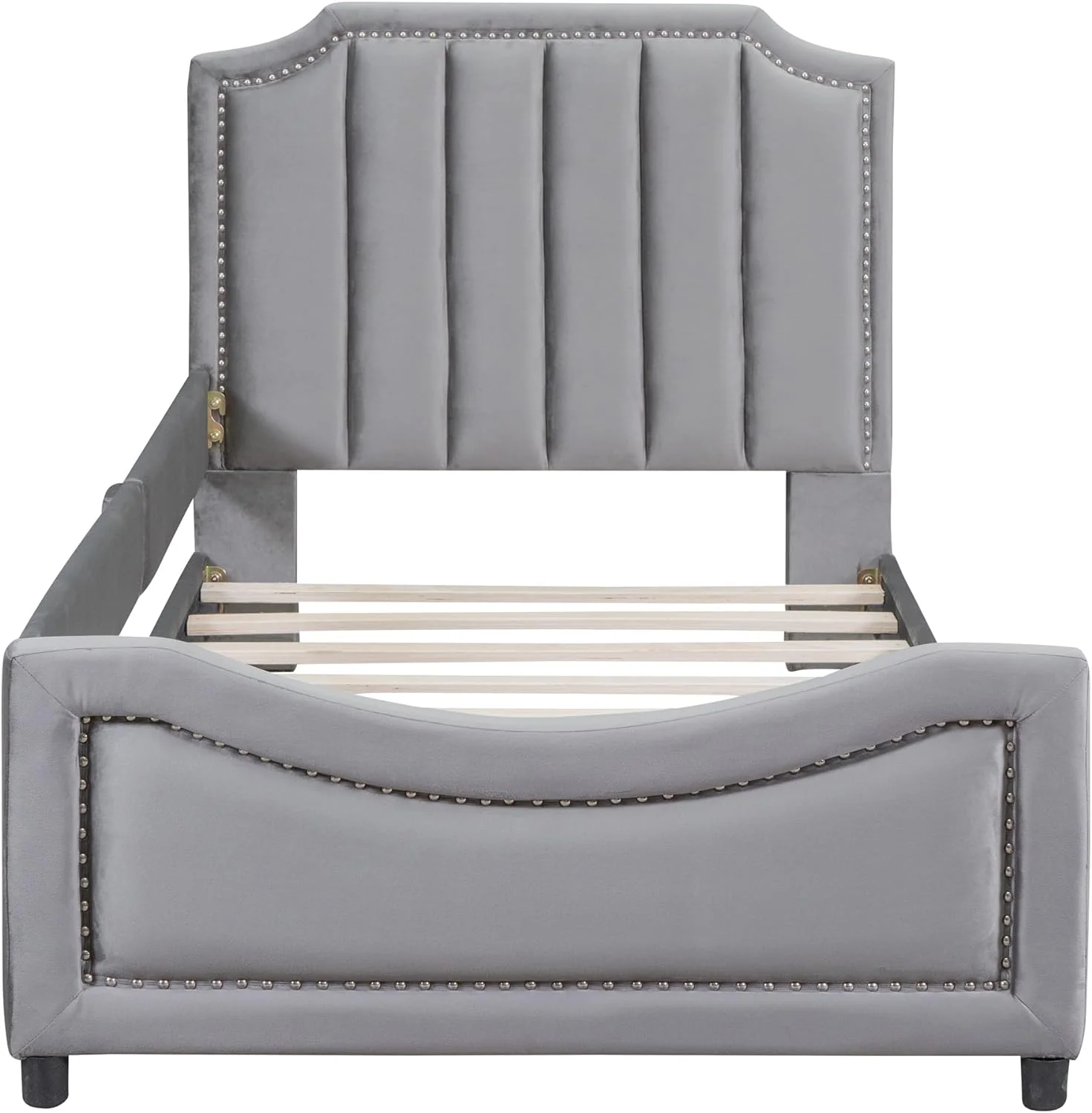 Size Velvet Upholstered Bed Frame With Nailhead Trim And Stripe Shaped Headboard, Classic Daybed No Spring Box Needed, Grey