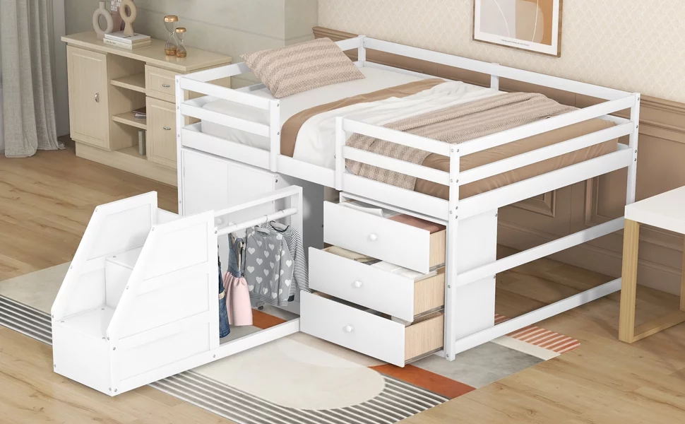 CoSoTower Full Size Functional Loft Bed with Cabinets and Drawers, Hanging Clothes At The Back of The Staircase, White