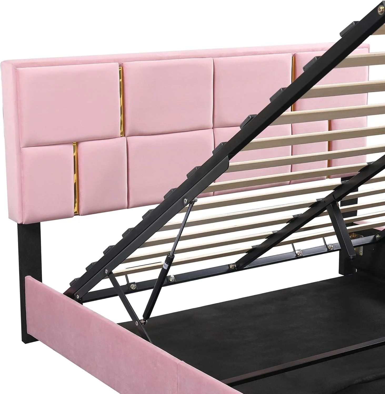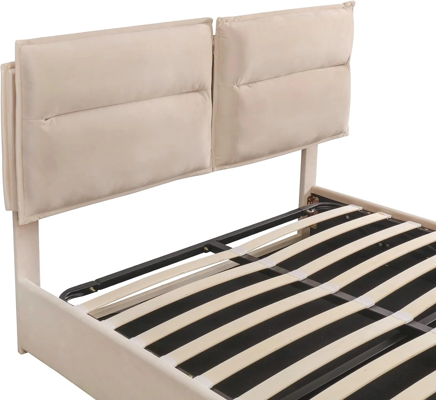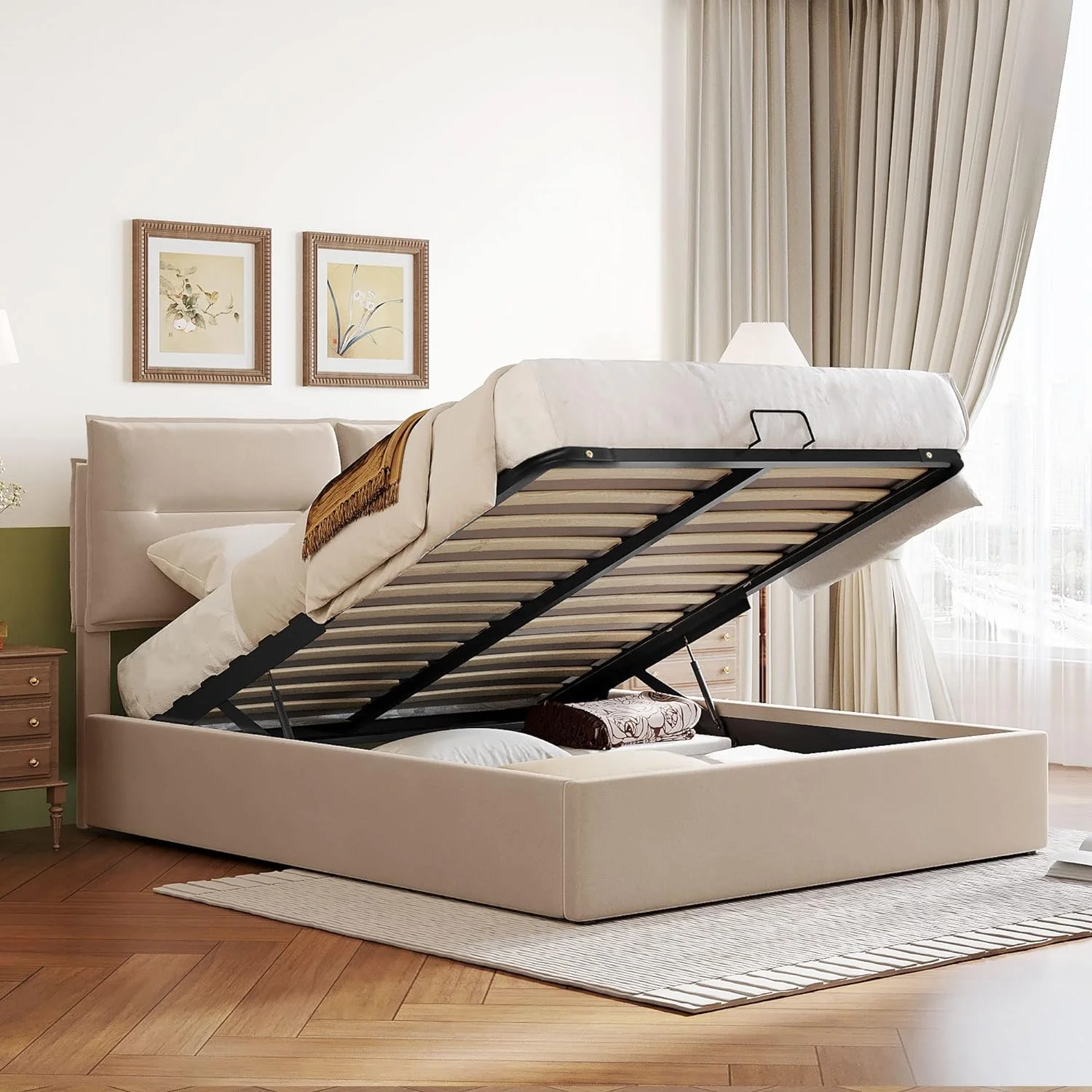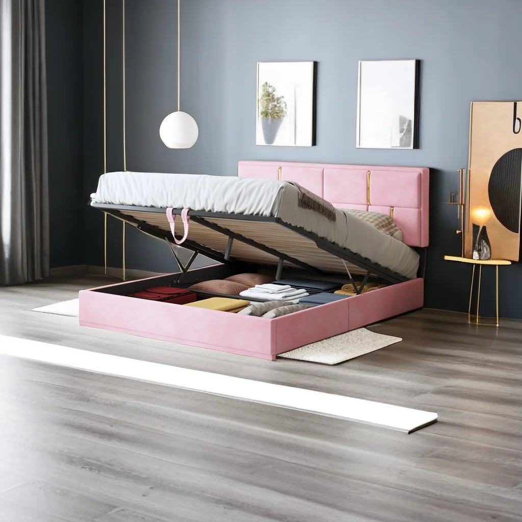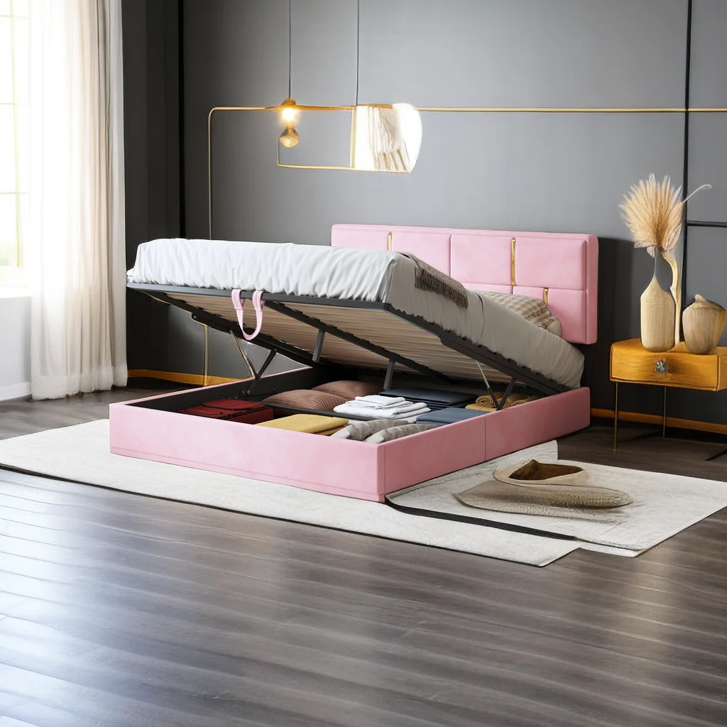 Upholstered Platform Bed, Hydraulic Storage System, Queen Size, Pine Wood & Plywood Frame, Velvet BedHead